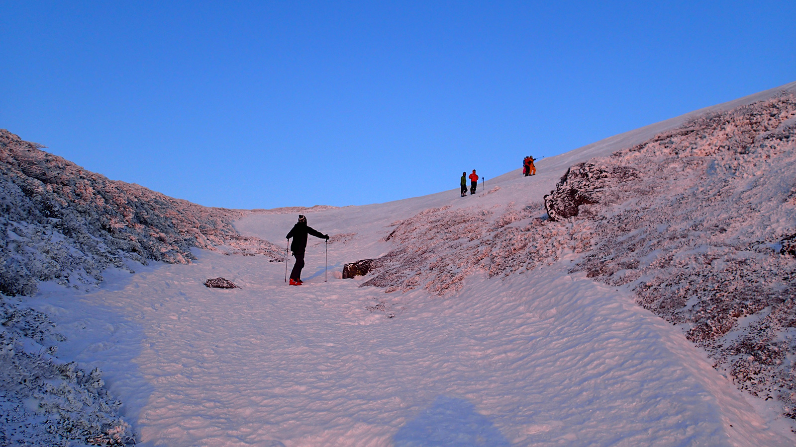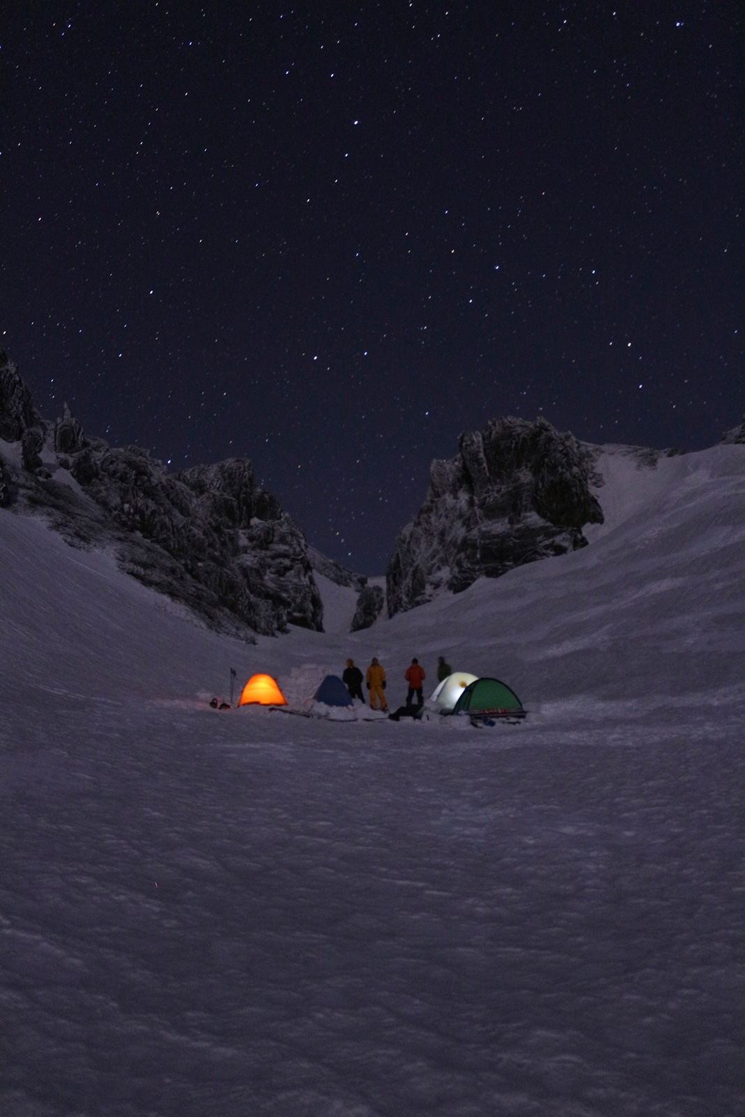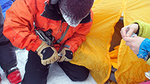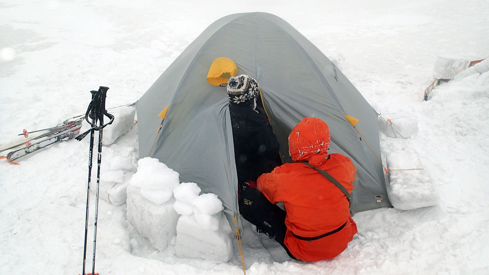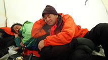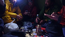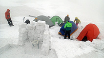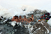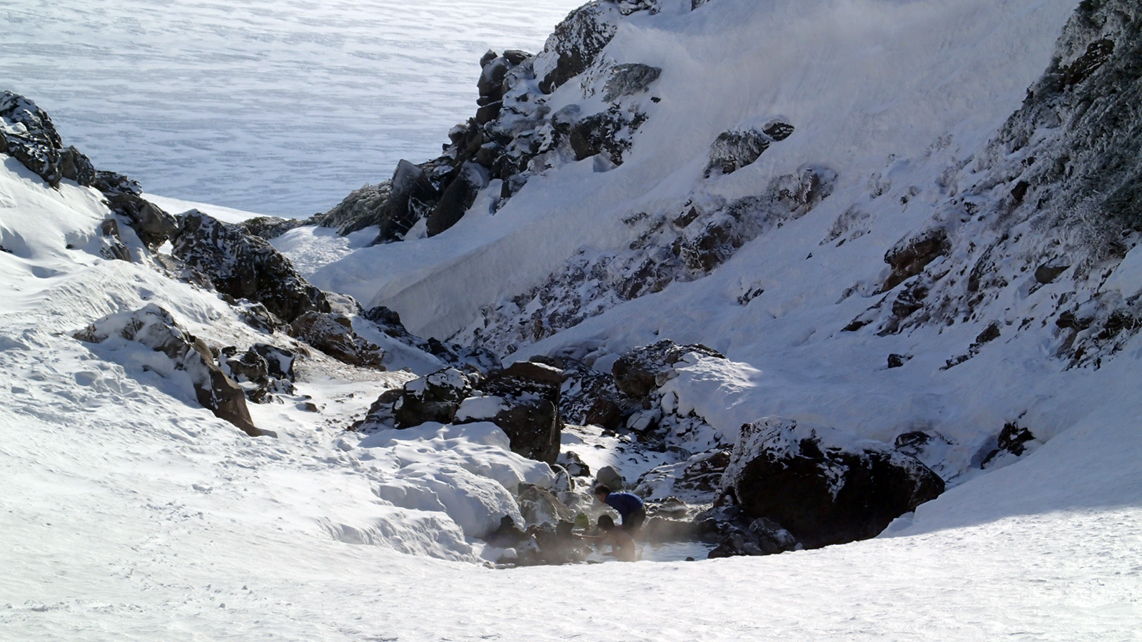 実に十年ぶりの中岳温泉ツアー。 旭岳温泉に向かう途中で雨が降ってきたが、その雨は標高900mあたりで雪に変わった。到着した旭岳は真っ白な雲に覆われていた。 駐車場で共通装備を配り出発準備。ロープウェイが強風で止まった場合は盤の沢での森林キャンプとする予定だったが、視界が悪い以外は問題無いと判断して予定通り出発。 だが、カズ君を山麓駅に忘れてきてしまうという問題が発生。カズ君が次の便で上がってくるまで姿見駅で待機することになった。これは、ロープウェイの運行時間を9:30としていたが、実際には9:20だったことと、リーダーが点呼を怠ったことが原因。 今回のツアーは、従来我々が得意としていたソリによる重量物運搬を廃して、全ての装備をザックに収めることにした。久しぶりの全荷が肩にずっしりとくる。でも、焼肉とビールを運んでいると思えば耐えられる。 姿見駅出発時の視界は10mのホワイトアウト。GPSとコンパスを用い、絶えず先頭と後続が連絡を取り合い進路を修正しながら進んだ。懸念された風は追い風で幸運だった。雪質は最悪の凍結融解クラストでガチガチ。ずっと片斜面をトラバースしているとスリップして辛い。特にスプリットボードのカズ君は大変だったと思う。 結局、3時間近くかかって中岳温泉に到着。すでに数パーティがテントを設営していた。 我々は、どうせ周りに迷惑を掛けるだろうと判断し、他のテントからかなり奥まったところにテント群&トイレを設営した。 天候さえ良ければ、日没まで安足間岳〜比布岳あたりに足を延ばして滑りを楽しむところなのだが、この視界と雪質では何もできない。必然的に真っ昼間から焼肉&酒宴となった。宴会場は30年もののICI4-5人用テント。ここに7人が入って、延々と酒を酌み交わす。狭いので、お互い背中に寄りかかったり、隣の人の腰や足に寝転がったり・・この狭さがテントらしくて心地よい。そのうち、いつの間にか風の音が止み、ベンチレーションから外を覗くと青空になっていた。 酔っ払った僕らは、歓声を上げながら近場の急斜面を登って滑って滑落したり、雪の上で裸になり露天風呂に浸かった。久しぶりの露天風呂は、深さ、広さ、湯温共に申し分なく快適だった。 最後に高台に登り、全員で夕陽を堪能した。夕陽も、そこへ向かって滑るテレマーカーの姿も感動的に美しかった。 そして、また宴会。1人300gを用意した肉は、食べても食べても無くならない。ビールが尽きて濃い酒に切り替わる。 そのうち、いつの間にか暗くなり、外を覗くと満天の星空になっていた。ホワイトアウトから快晴〜星空へ。劇的に変化する天候に僕らは打ちのめされ、感動し、感謝した。 明日の滑りに期待しながら、酔いつぶれて眠る・・