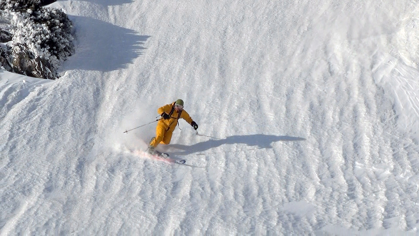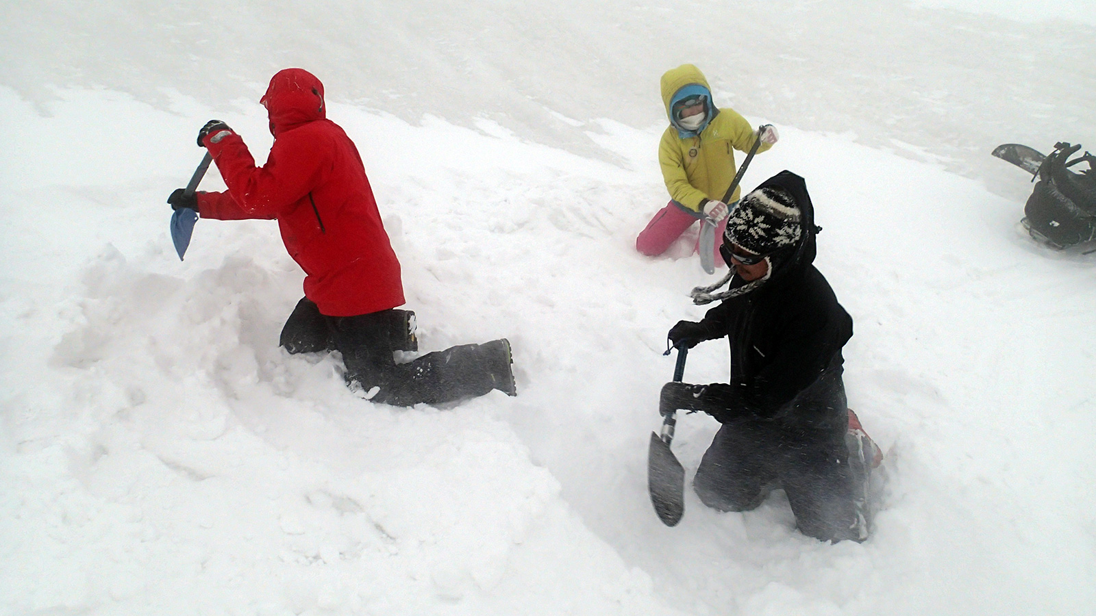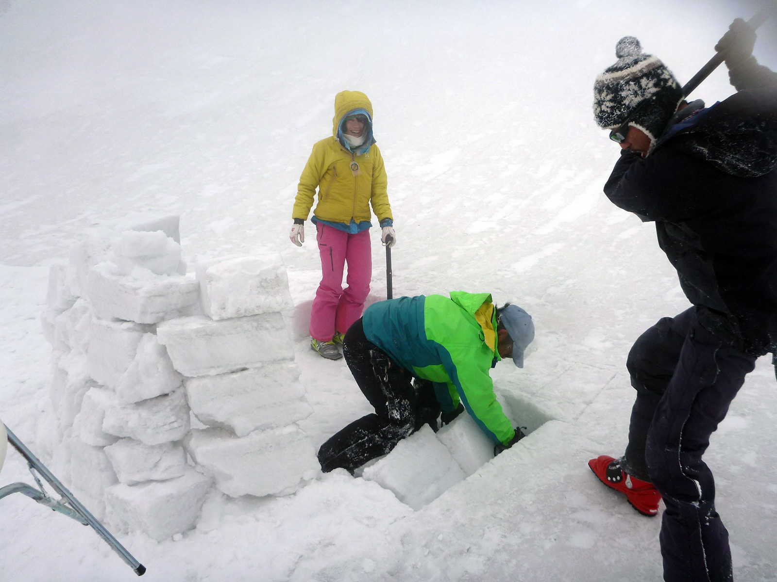融解凍結クラストはブロックに最適 奴隷のようにブロックを切り出すT田さん、シャベルをふるって働かせる田中パパの図 Photo by タカヤ
