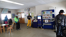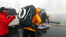 旭岳ロープウェイ山麓駅に集合 大西のザックに付いているのは便座。これなくして山中泊はありえない。そして格好いい