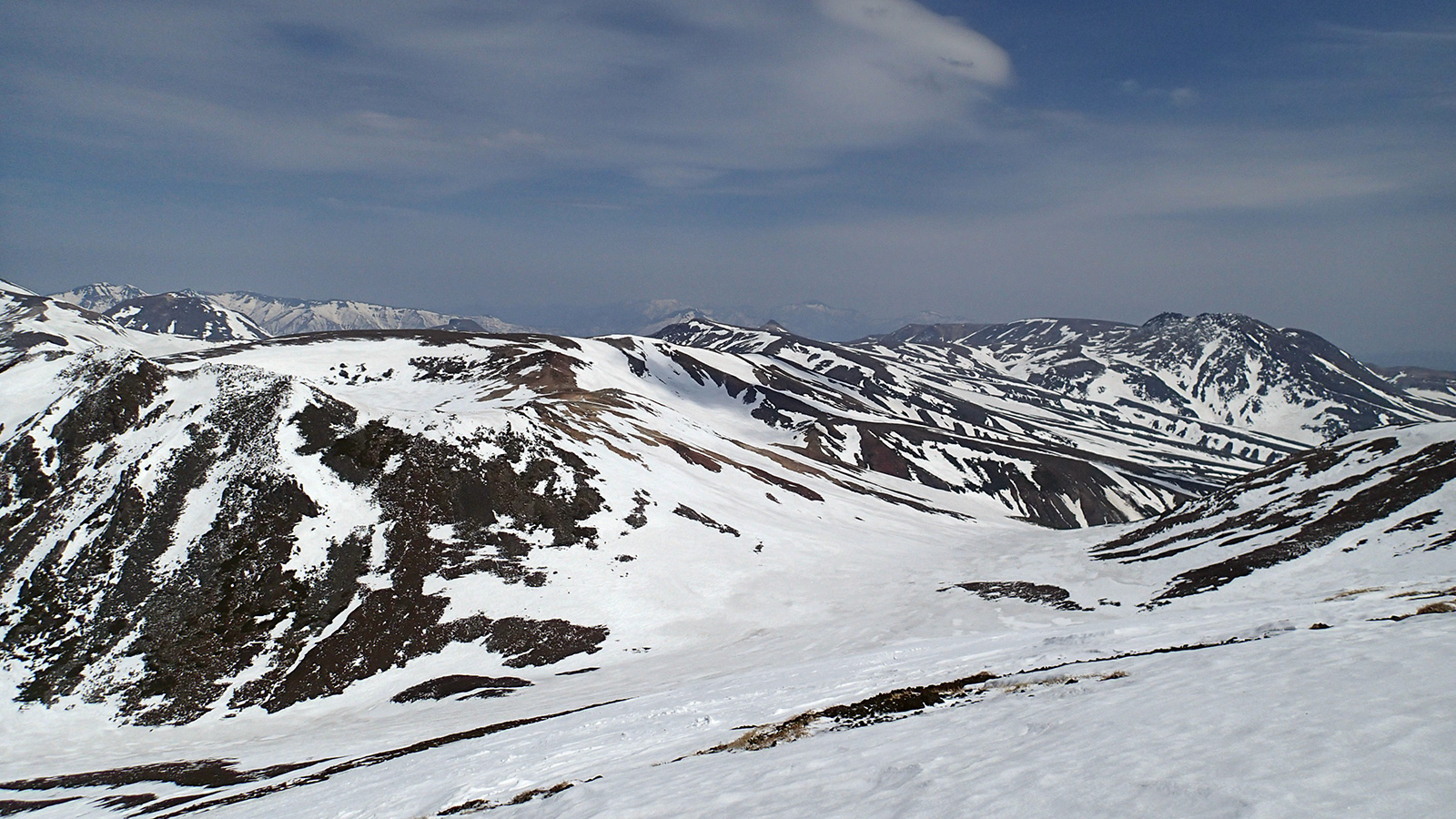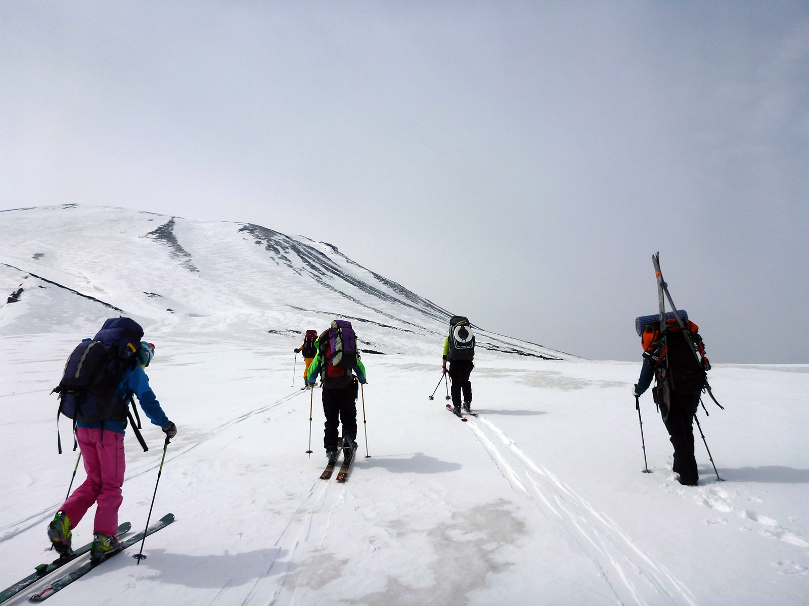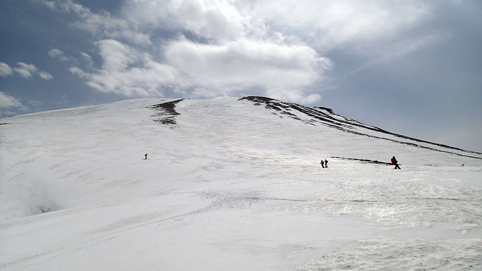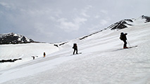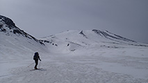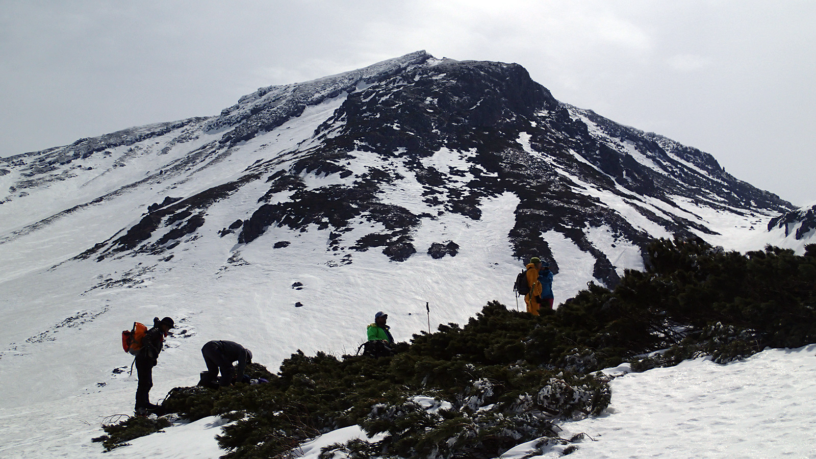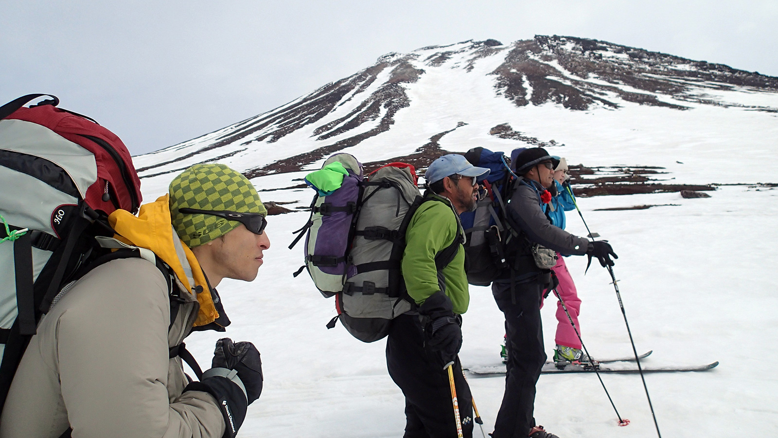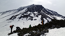 旭岳の北東斜面下部に大荷物をデポし、ここからは各人の共通装備を絞って最低限の装備で登った。