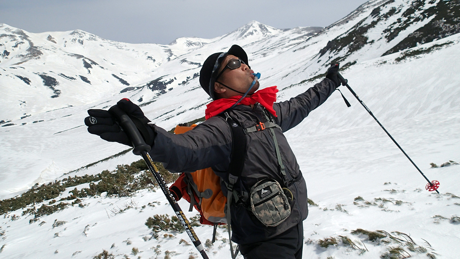 デポ地点では、田中パパからザラメアイスを頂き大休止。ため息をつきながら再び重い荷物を背負い、旭岳ロープウェイ駅を目指してロングトラバース。