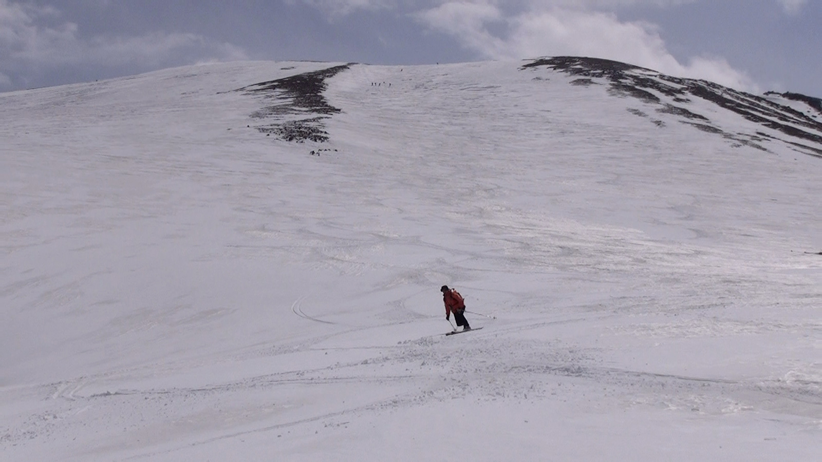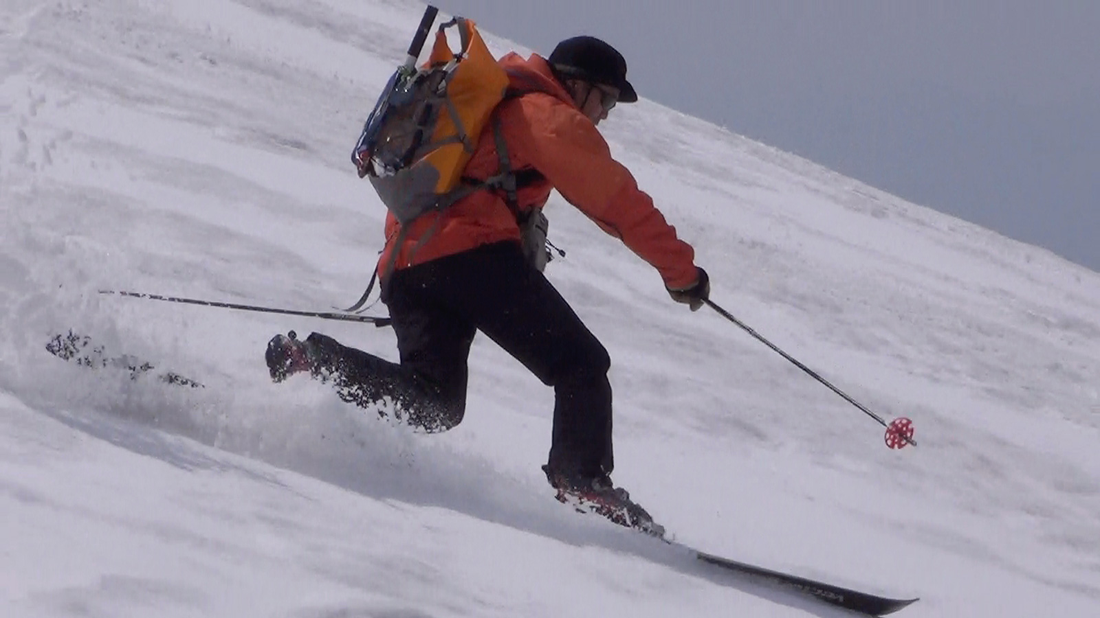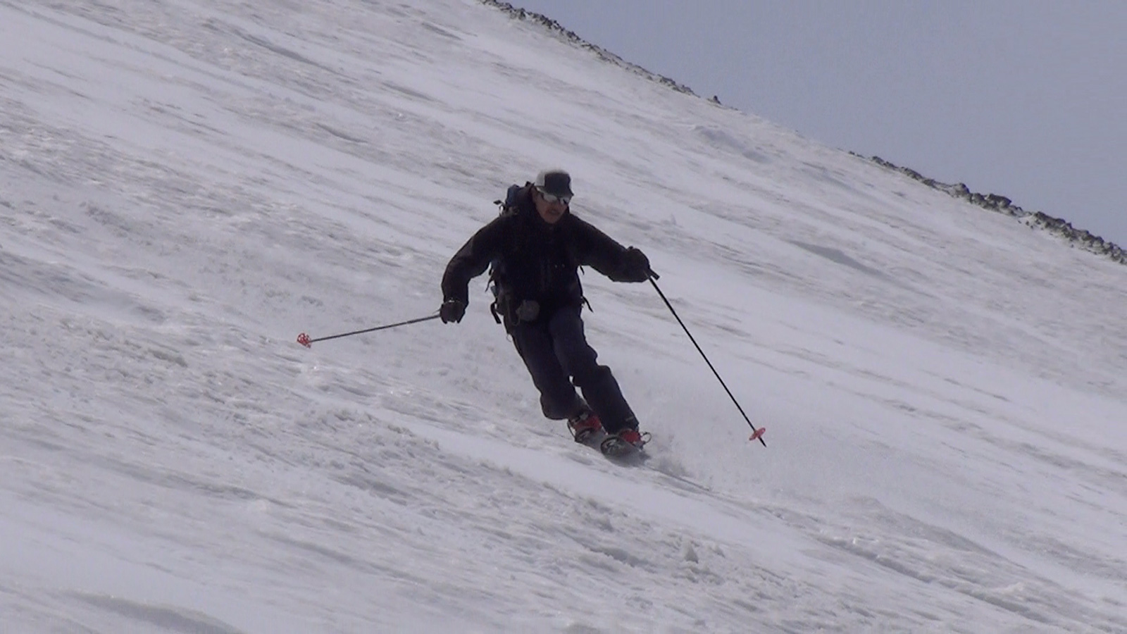 さて、問題は滑降。斜滑降キックターンで降りているスキーヤーが見えて、雪の手強さが偲ばれる。