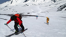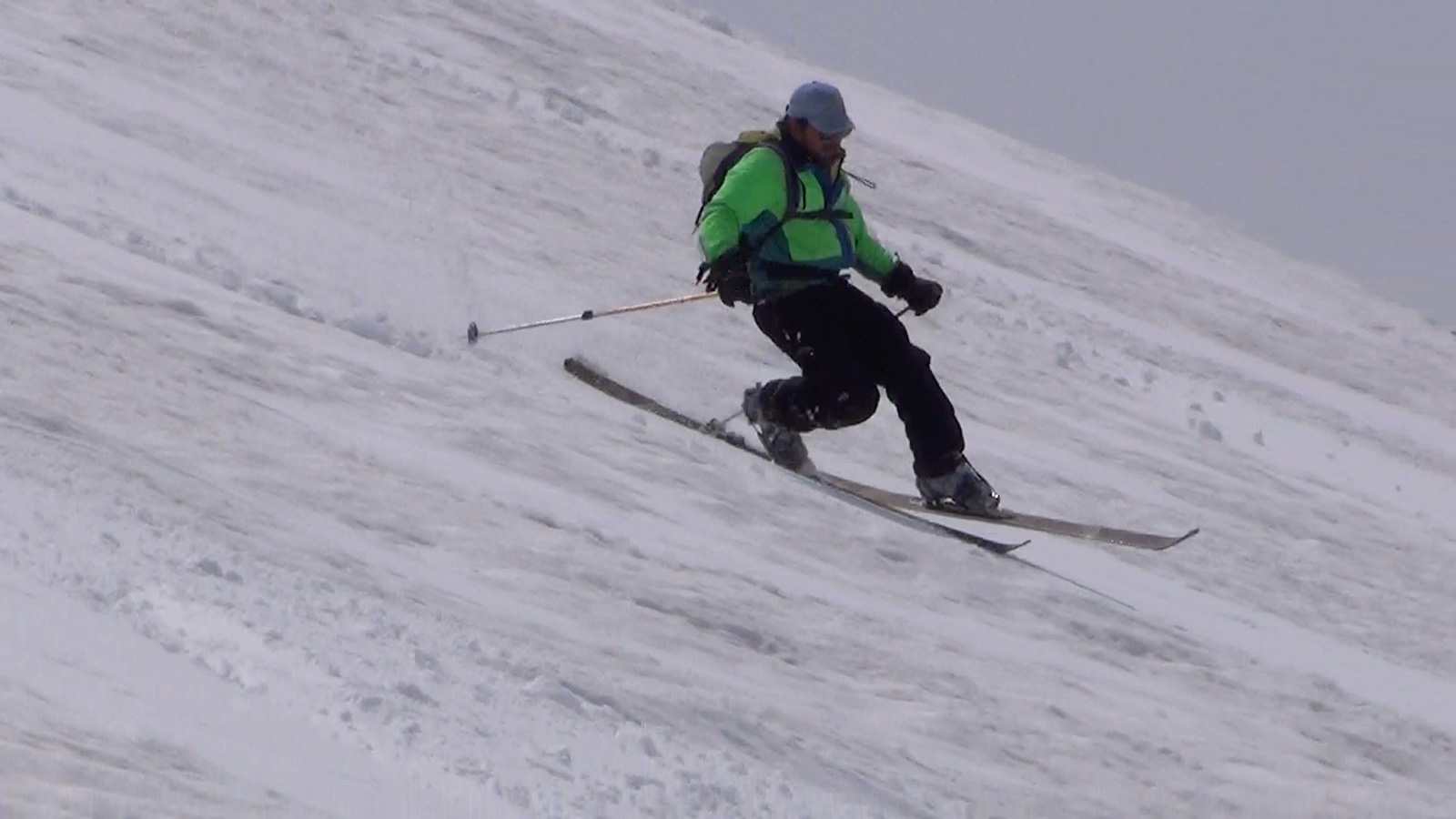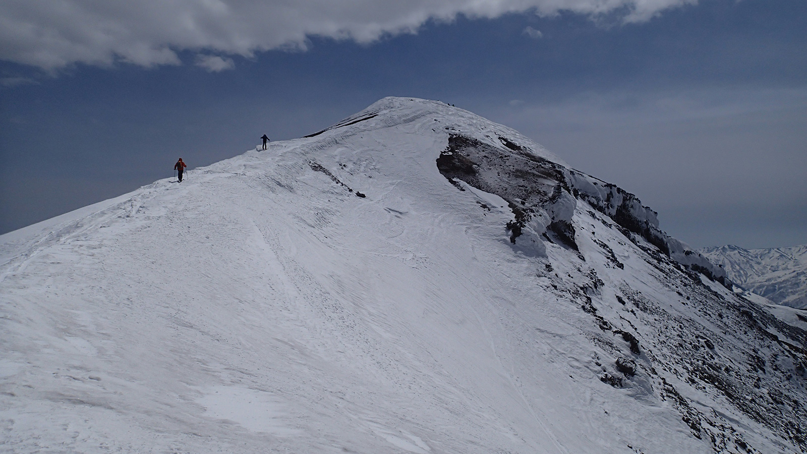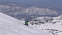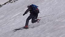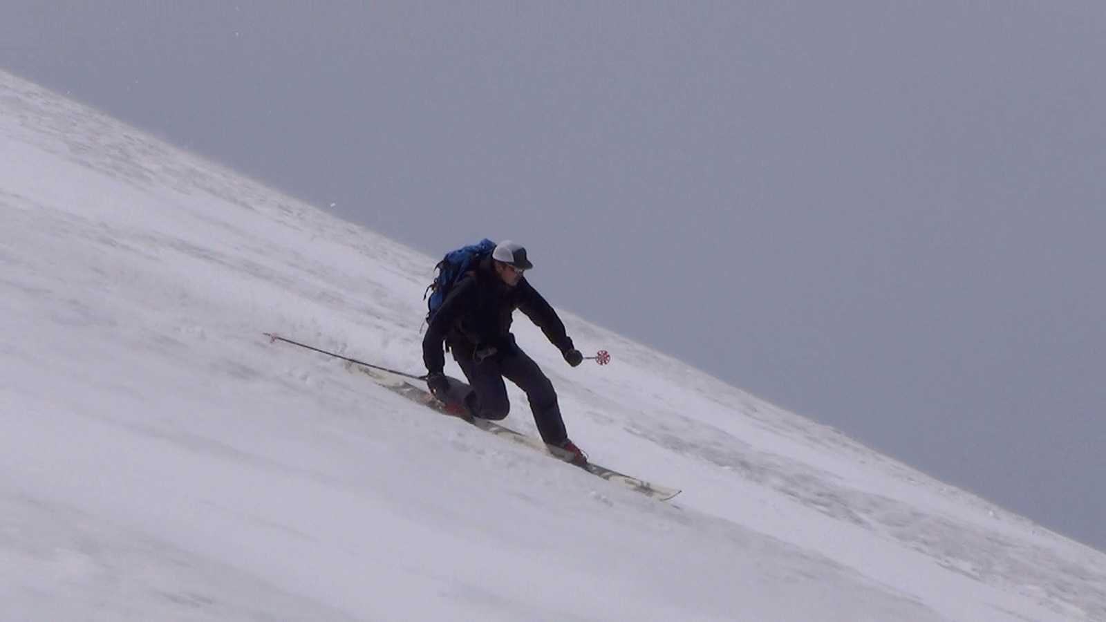さて、問題は滑降。斜滑降キックターンで降りているスキーヤーが見えて、雪の手強さが偲ばれる。