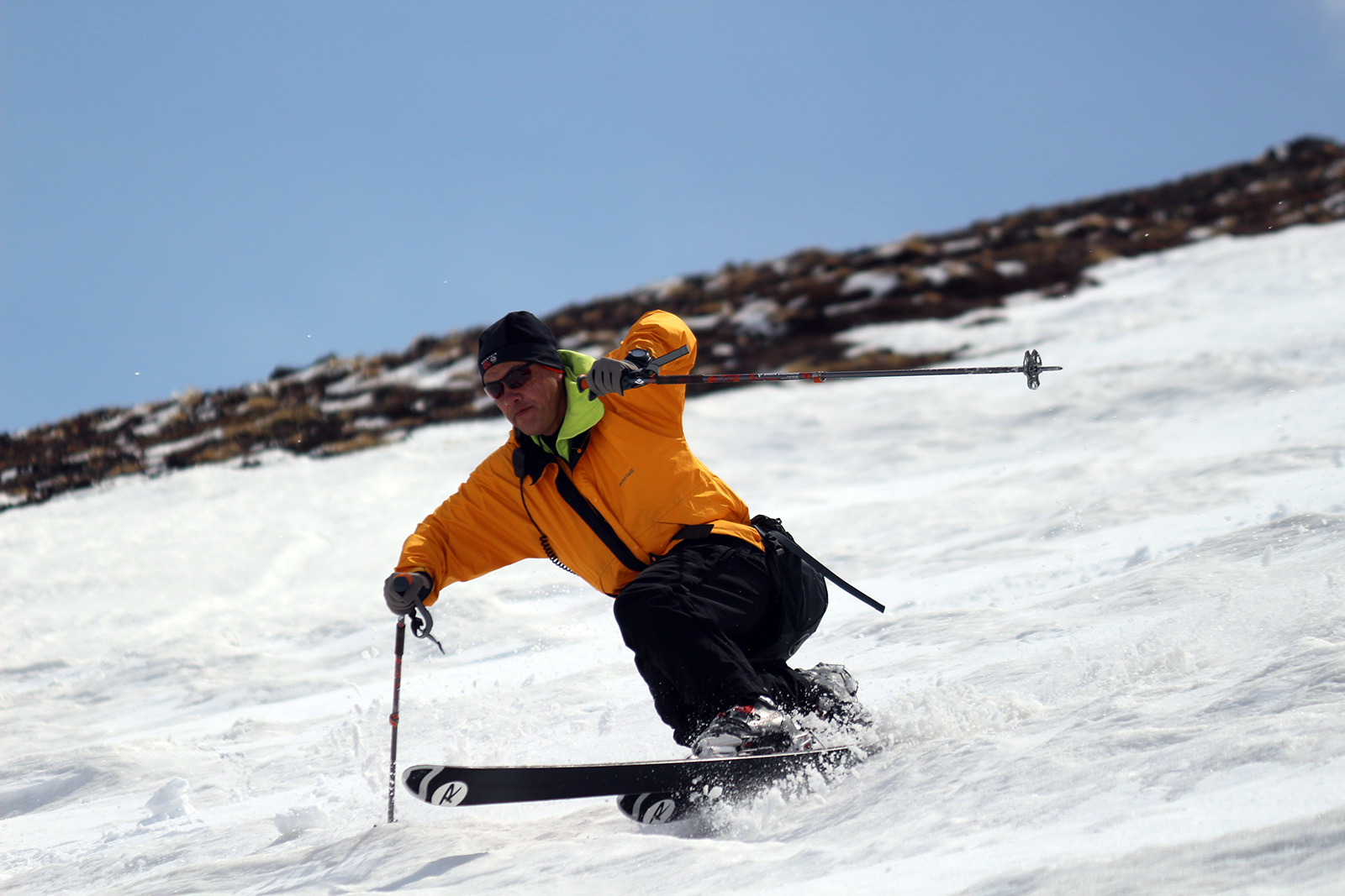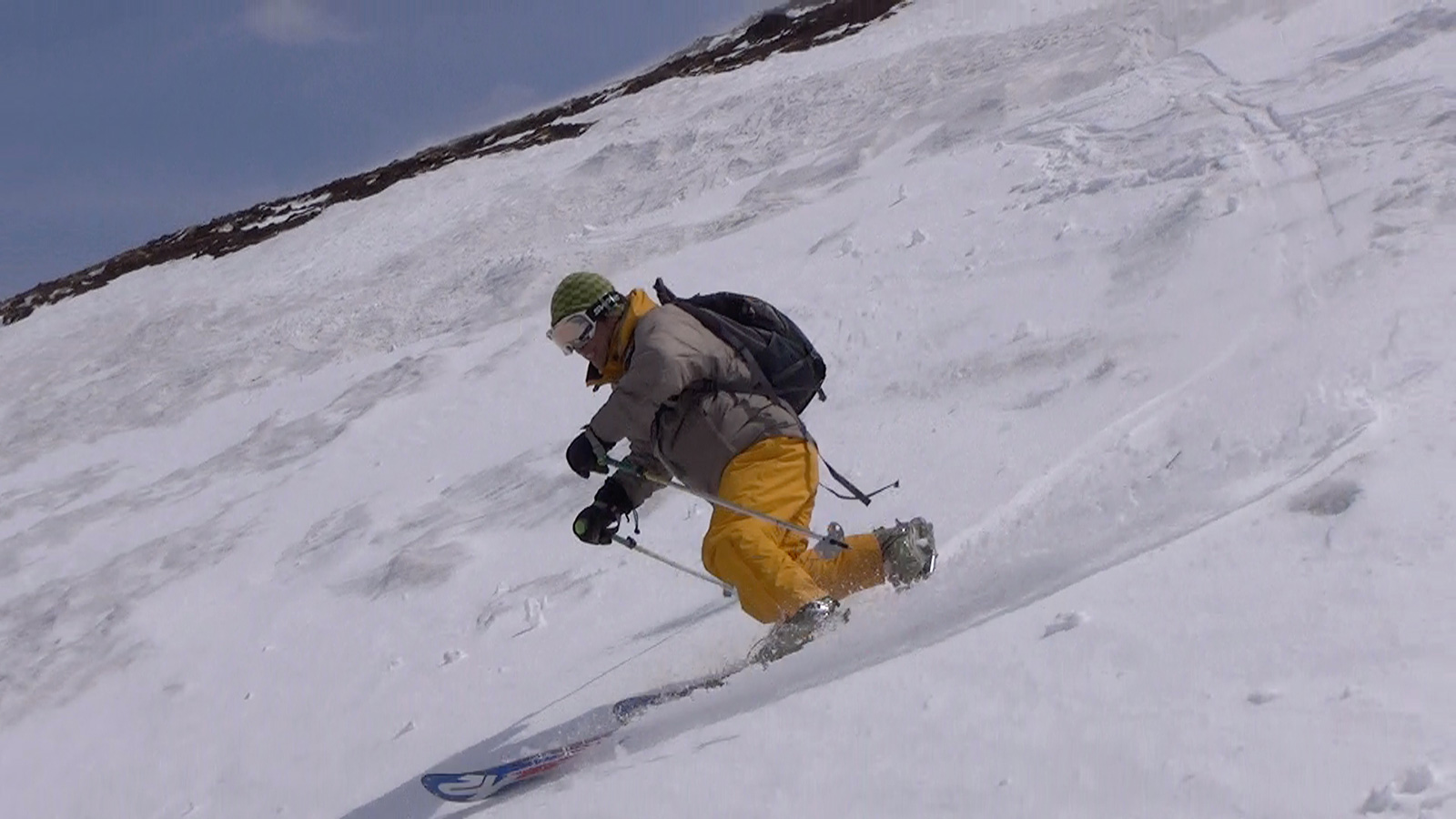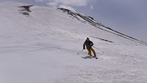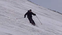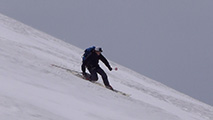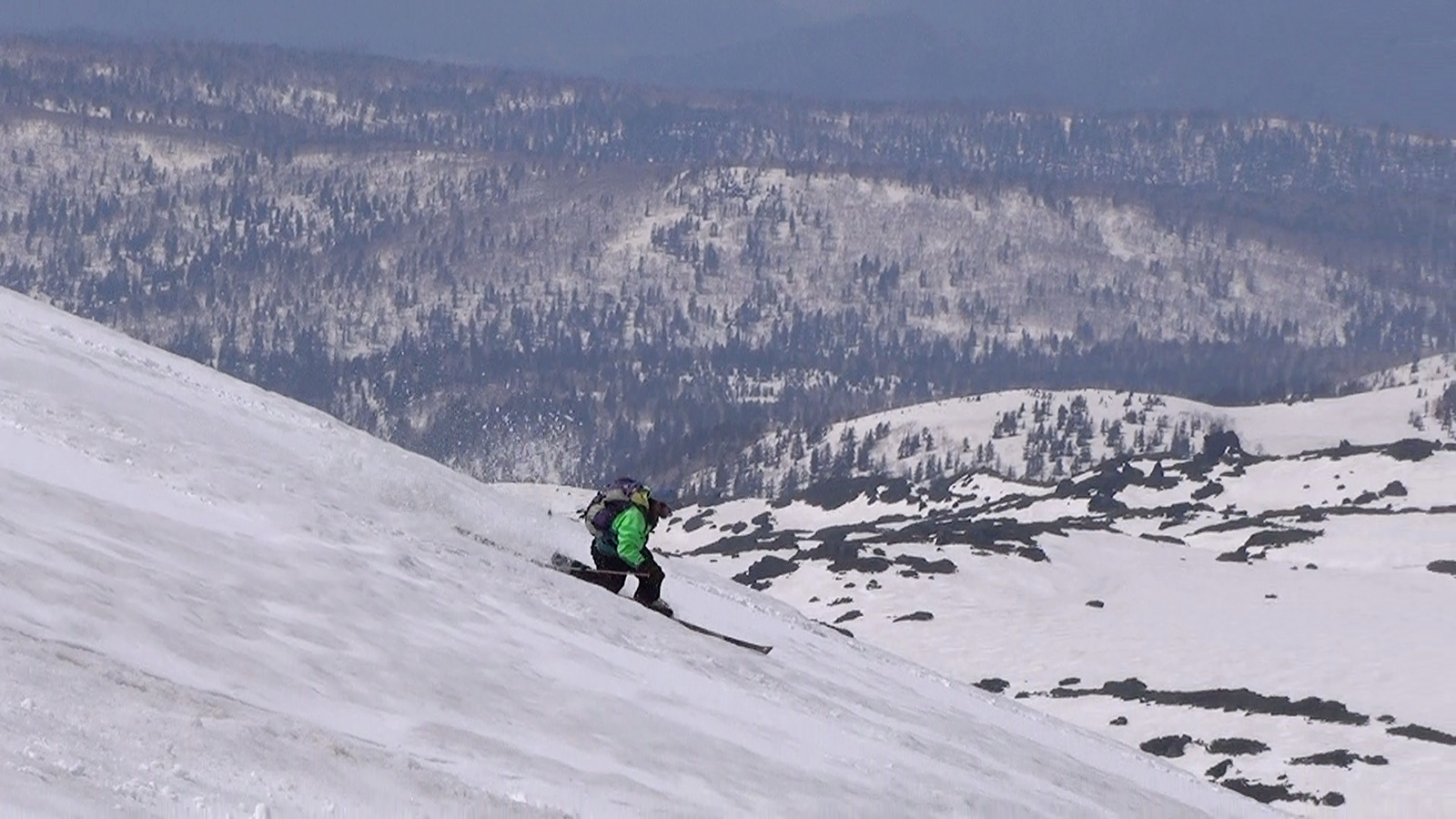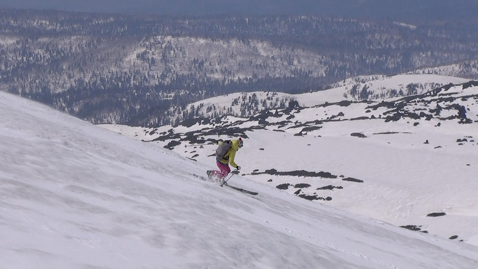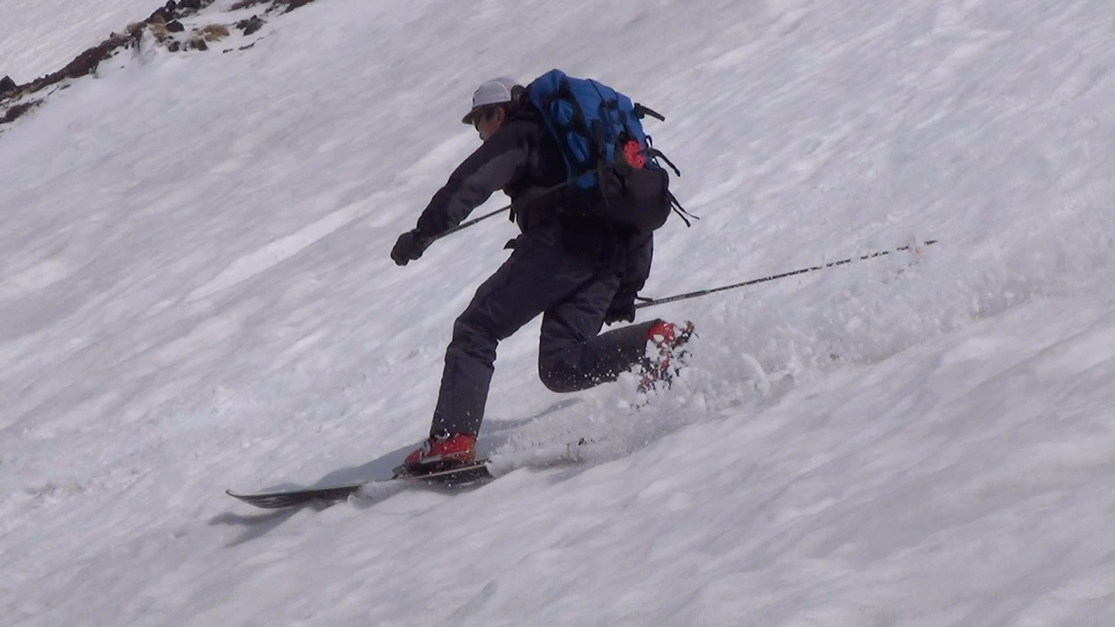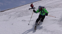 クラストが緩んでいても、まるでコブ斜面のような凸凹があり、かなり手こずる。しかし、それも徐々にフラットになり、最後は快適にザラメを飛ばすことできた。