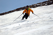 上部のクラスト帯は横滑り気味に高度を落とし、できるだけ西側にトラバースしながら雪の良いラインを捜した。