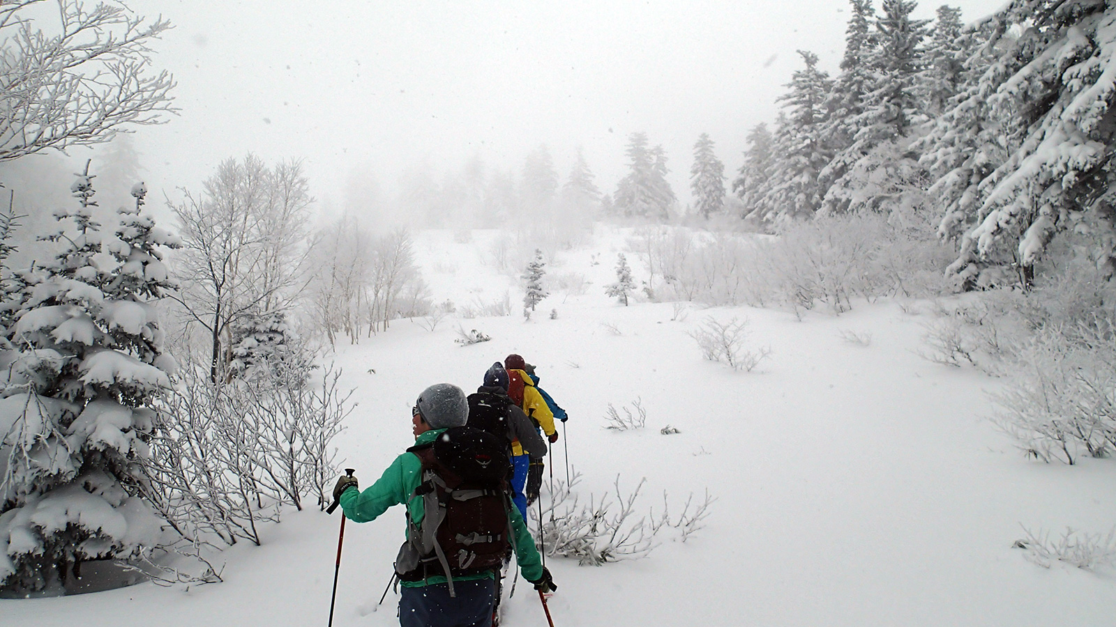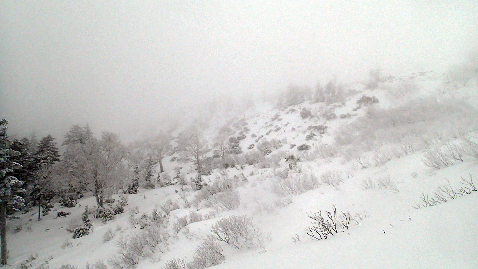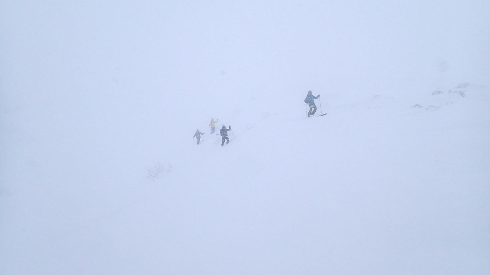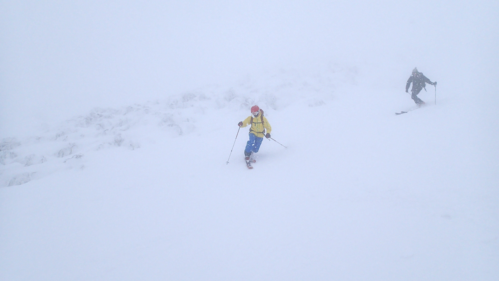 森林限界より上は視界は悪かったが、意外と風が弱かった。雪質はフラットでクラストしたベースがしっかりあるので、ブッシュを踏む抜くような事が無く、スイスイ高度を上げることができた。