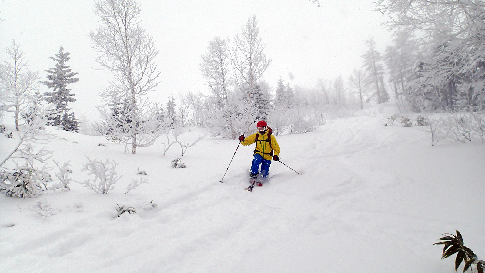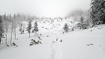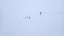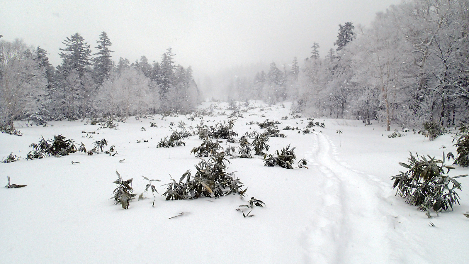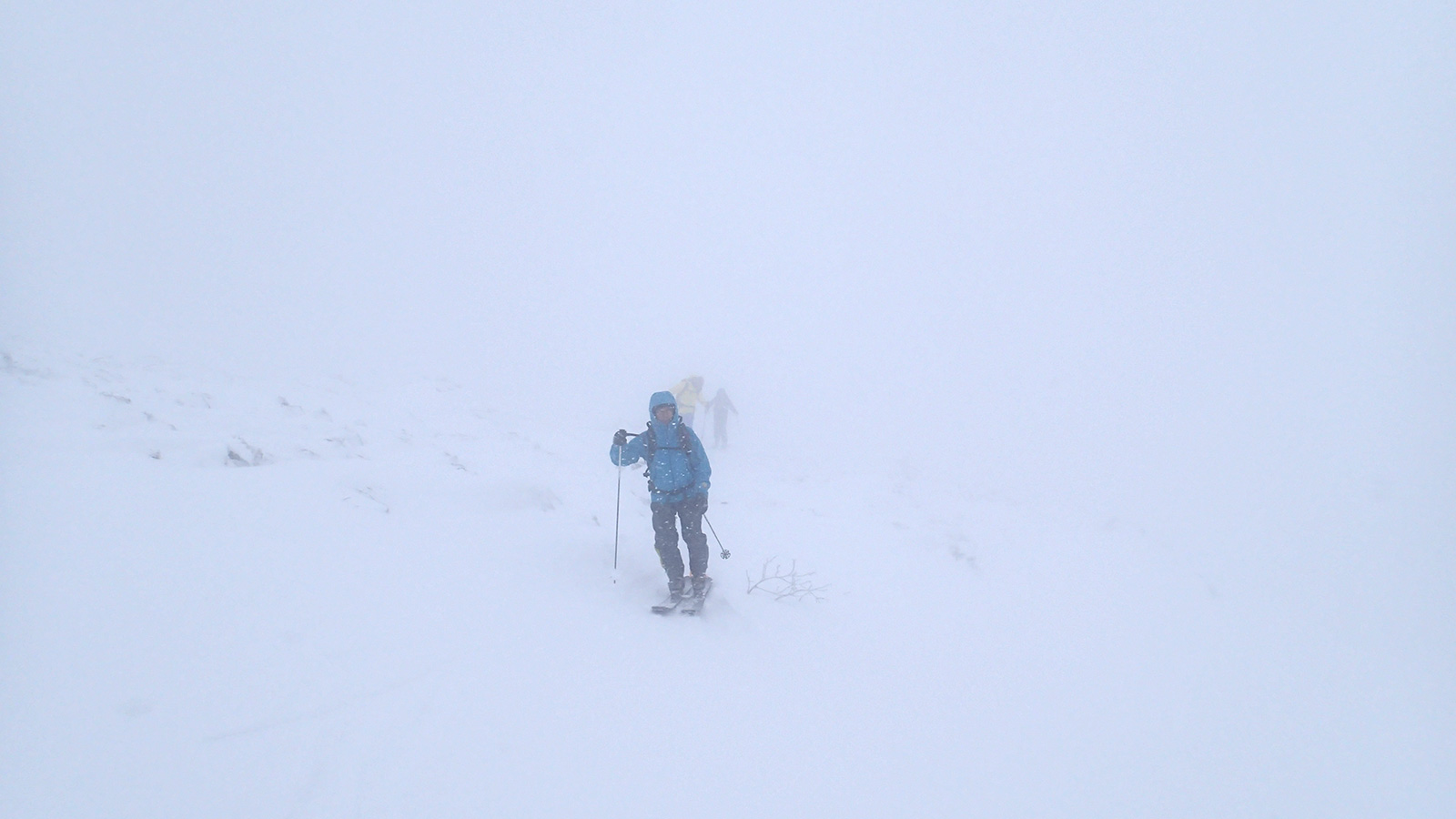 森林限界より上は視界は悪かったが、意外と風が弱かった。雪質はフラットでクラストしたベースがしっかりあるので、ブッシュを踏む抜くような事が無く、スイスイ高度を上げることができた。