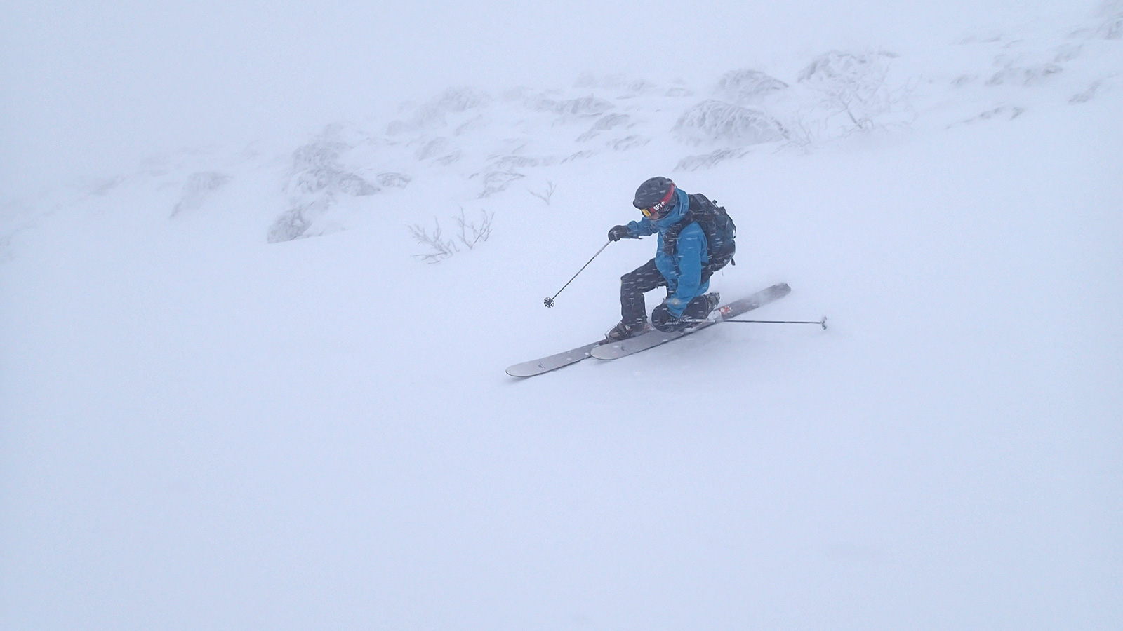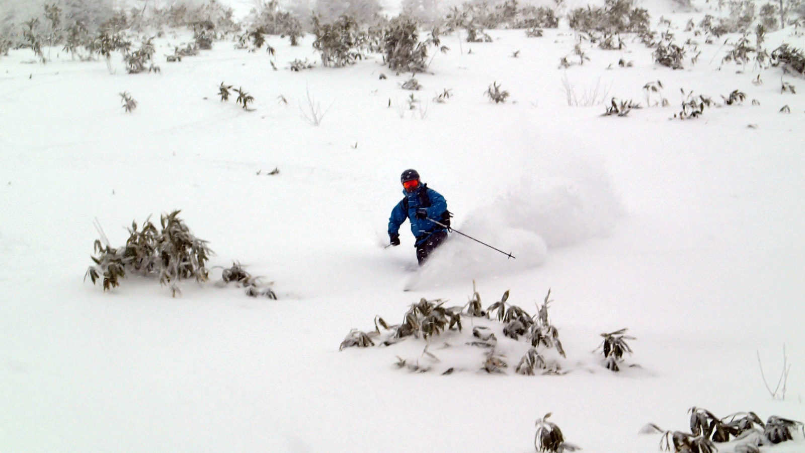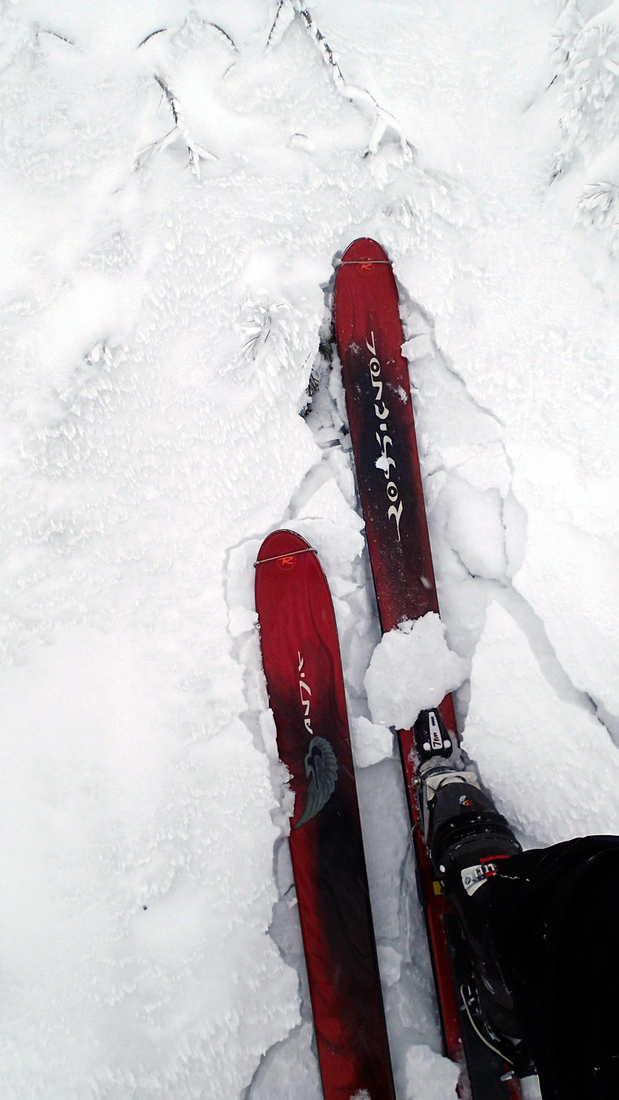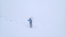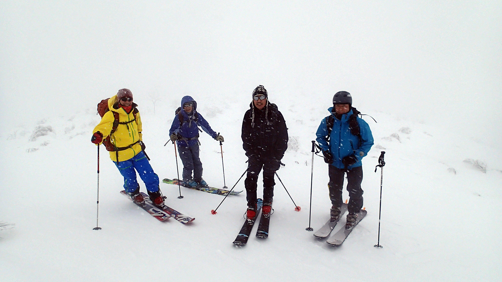 森林限界より上は視界は悪かったが、意外と風が弱かった。雪質はフラットでクラストしたベースがしっかりあるので、ブッシュを踏む抜くような事が無く、スイスイ高度を上げることができた。
