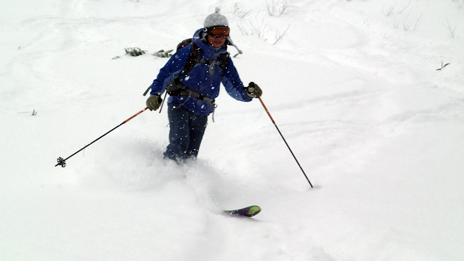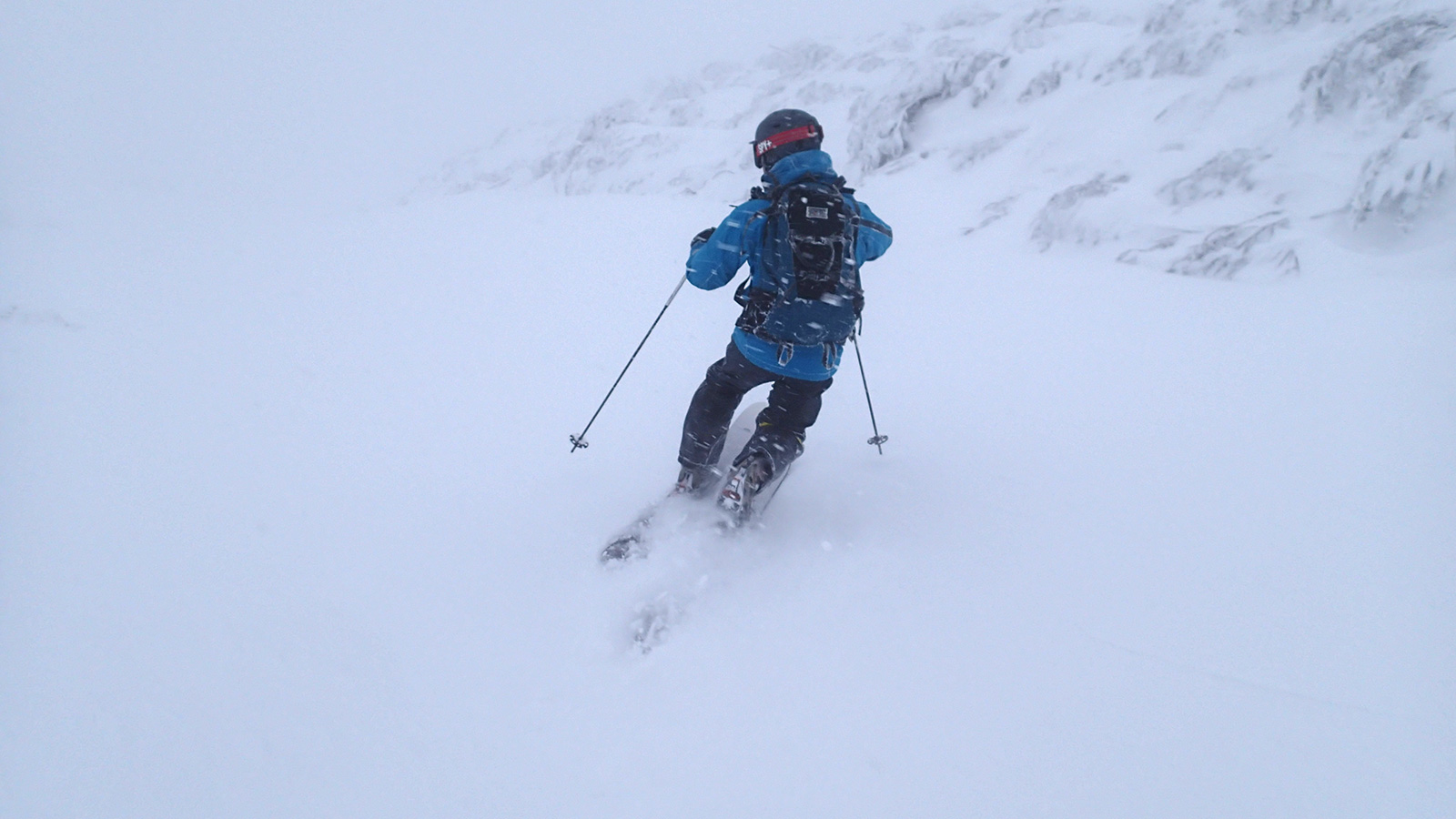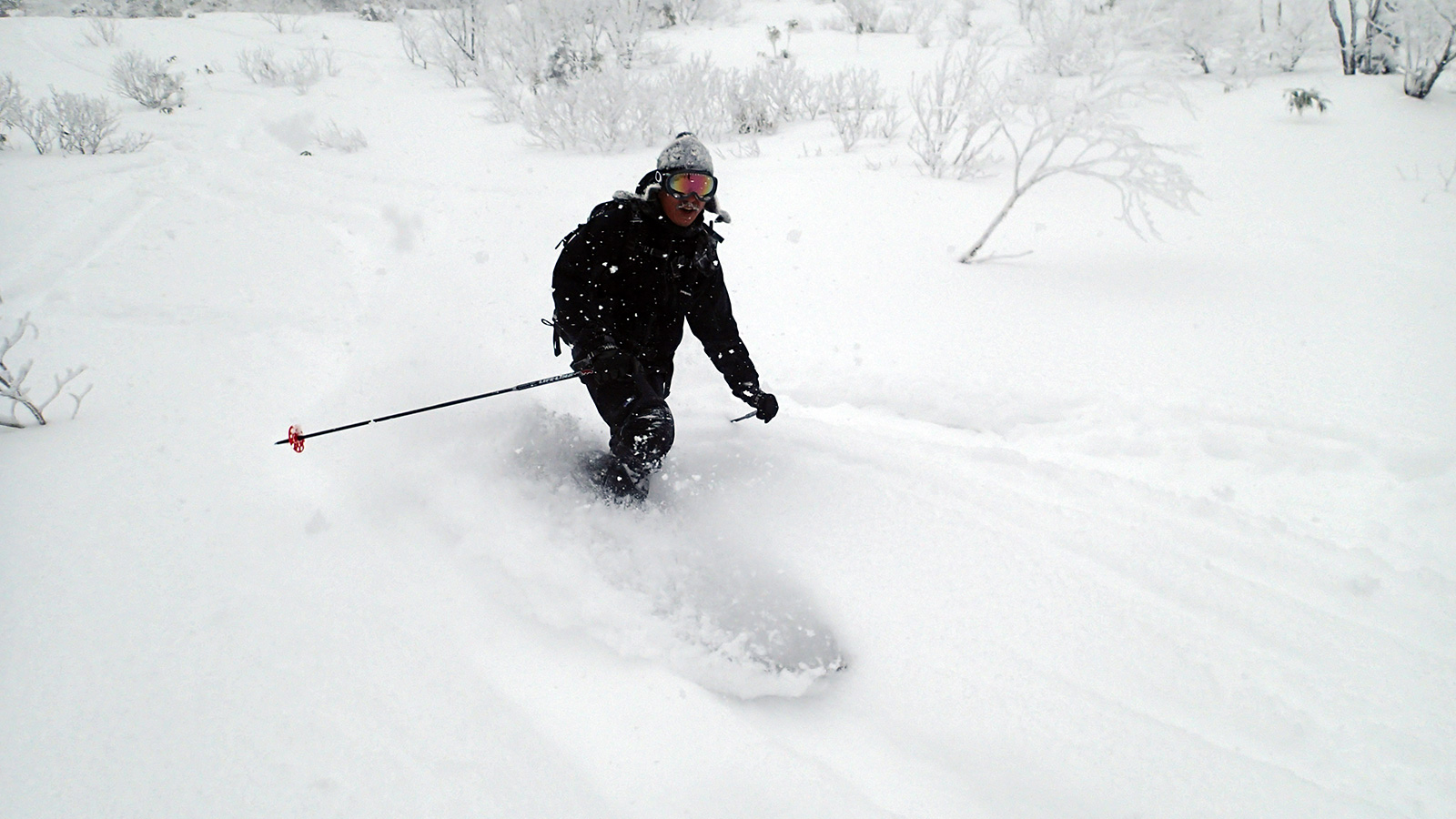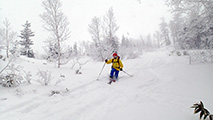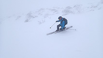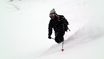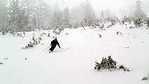 滑降は思いの外快適。ウィンドクラストだがシュカブラが発達していないので滑りやすい。沢筋を辿って滑ると、いくつかパウダーも拾えた。シーズンインでこれなら御の字だ。