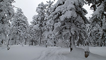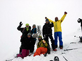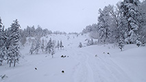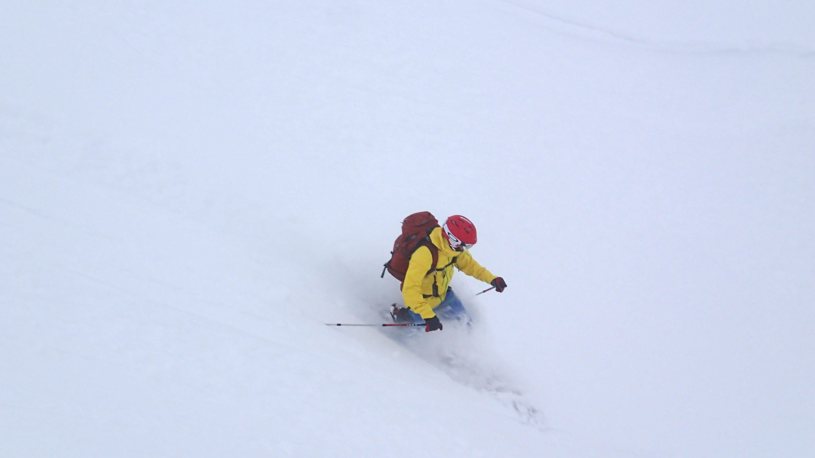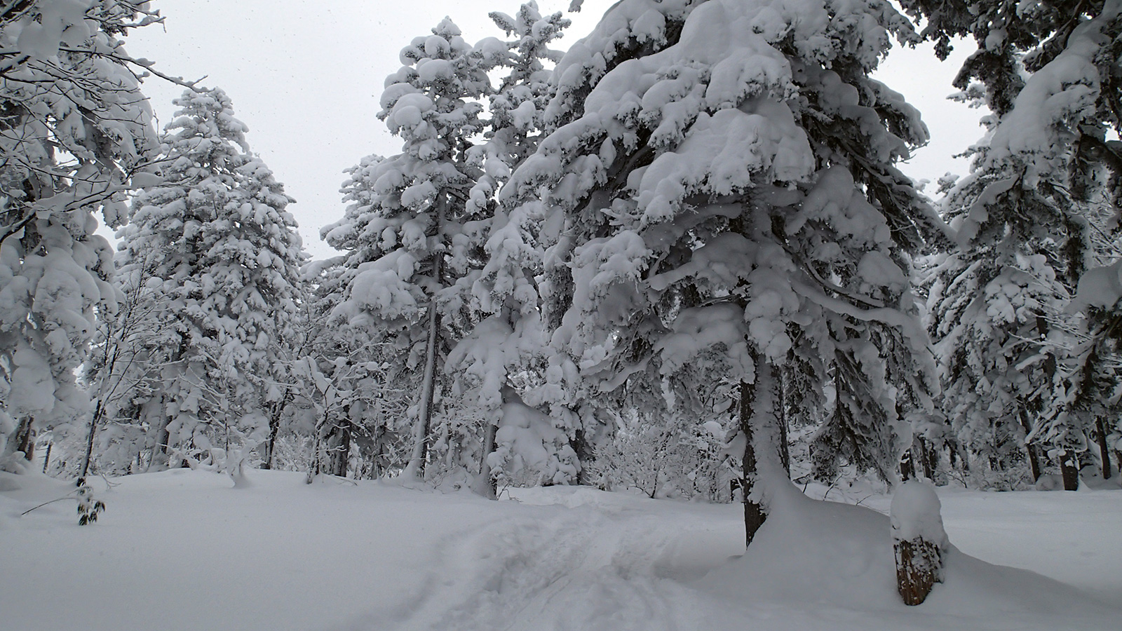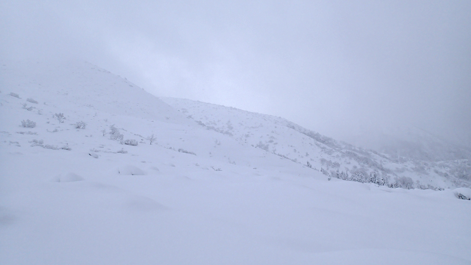 樹林帯は深くて軽い雪に覆われているが、森林限界より上はクラストしたベースの上に重たい風成雪が溜まっていた。ハンドテストでは顕著な弱層なし。