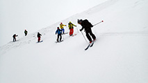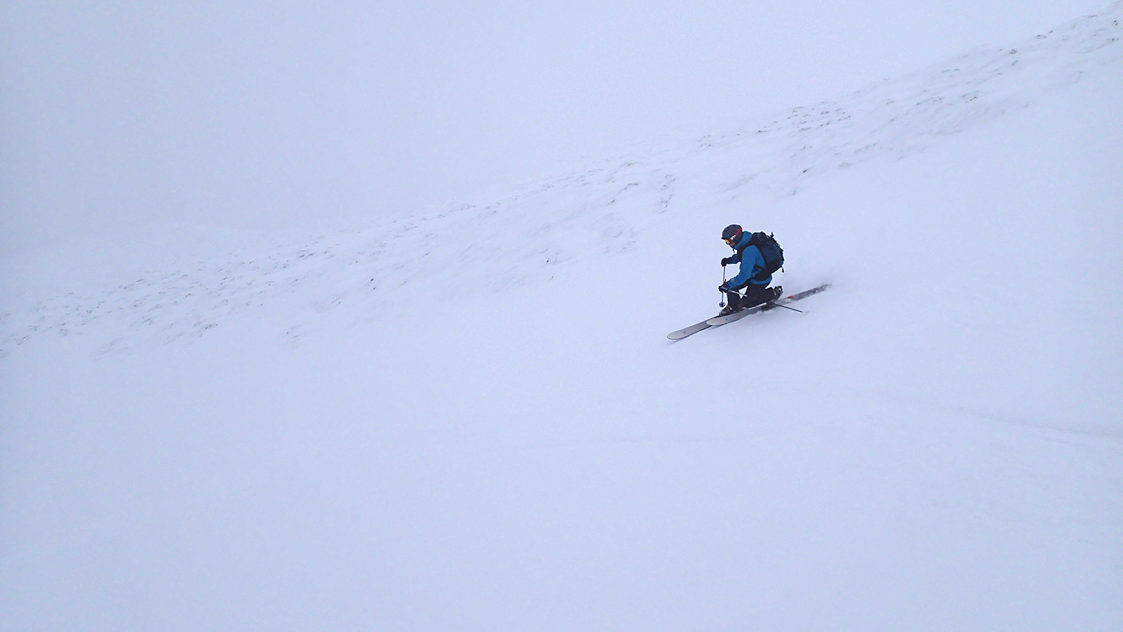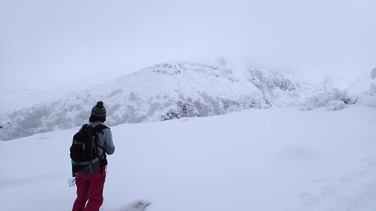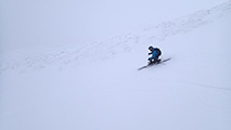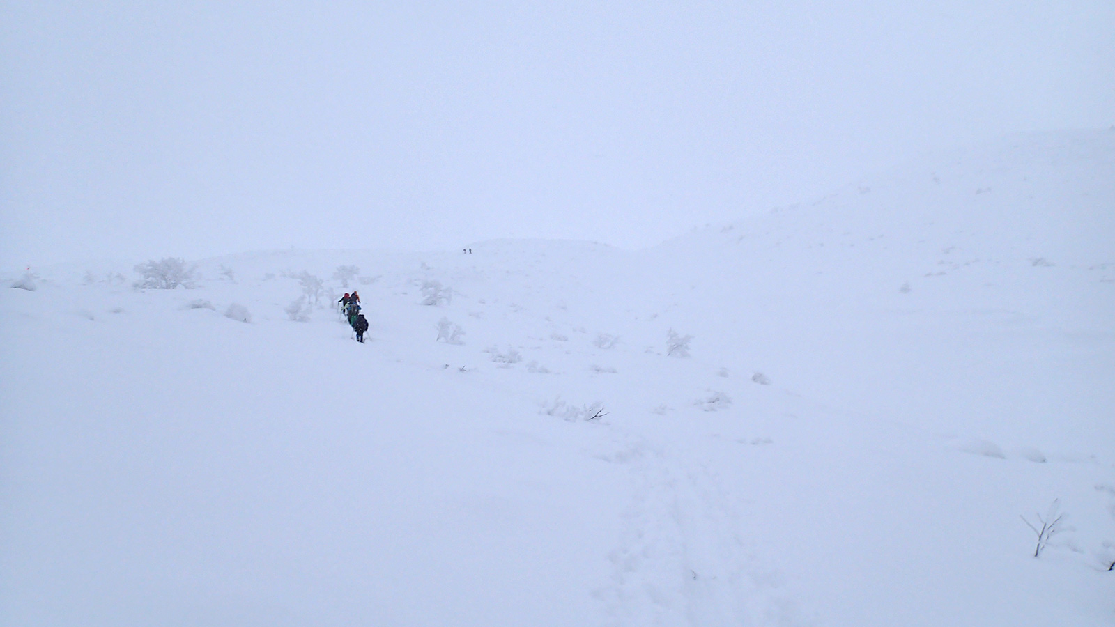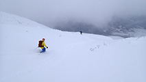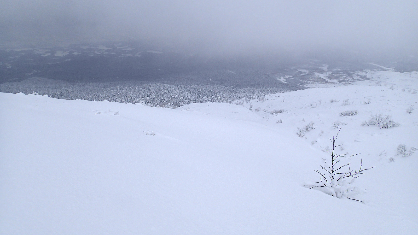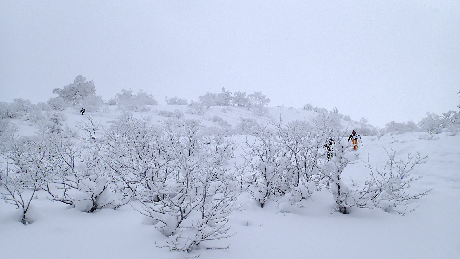 注意すべきは雪で薄く覆われたハイマツ。スキーのトップが刺さると転倒〜負傷の恐れがあるので、滑降時には沢筋か登りのトレースを忠実に降りた方が良い。