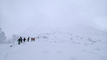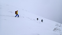 山頂直下はガリガリにクラストしてスリップしやすい。大西は途中にスキーをデポしてツボ足で登頂したが、ハイマツの踏み抜きに難儀した。