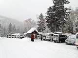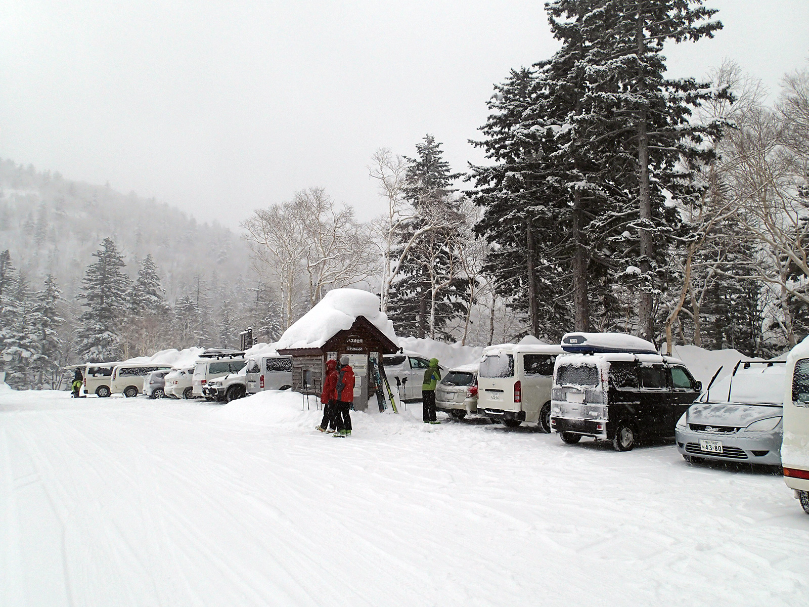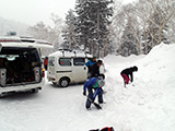 白銀荘で三台の車を一台にまとめてバーデン前へ向かったが、すでに駐車場は満車状態。5人でシャベルを振るってなんとかスペースを確保した。