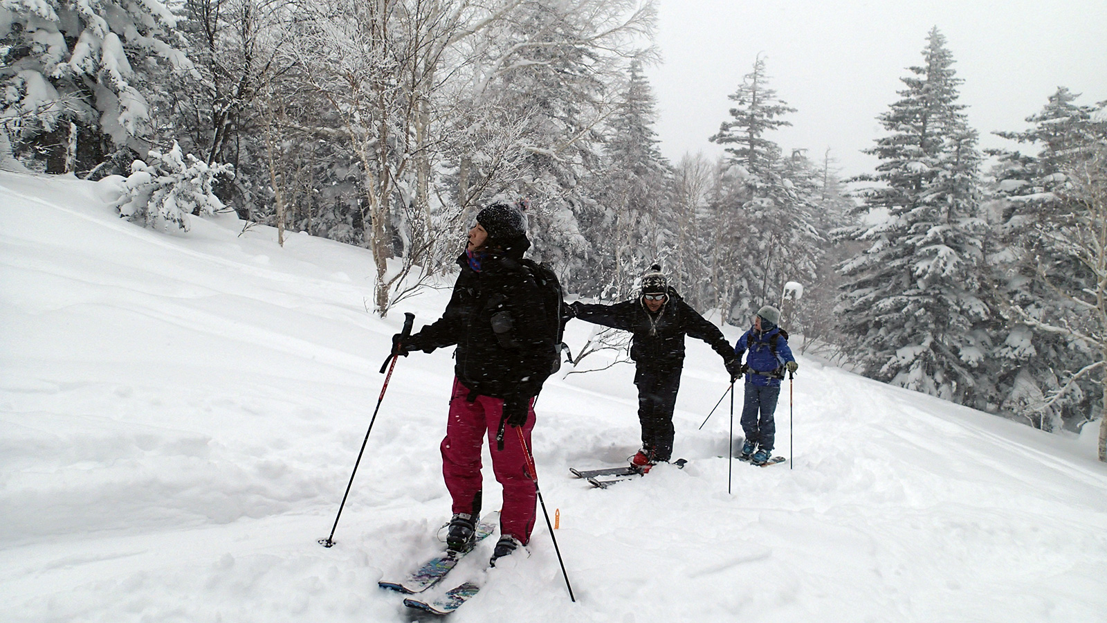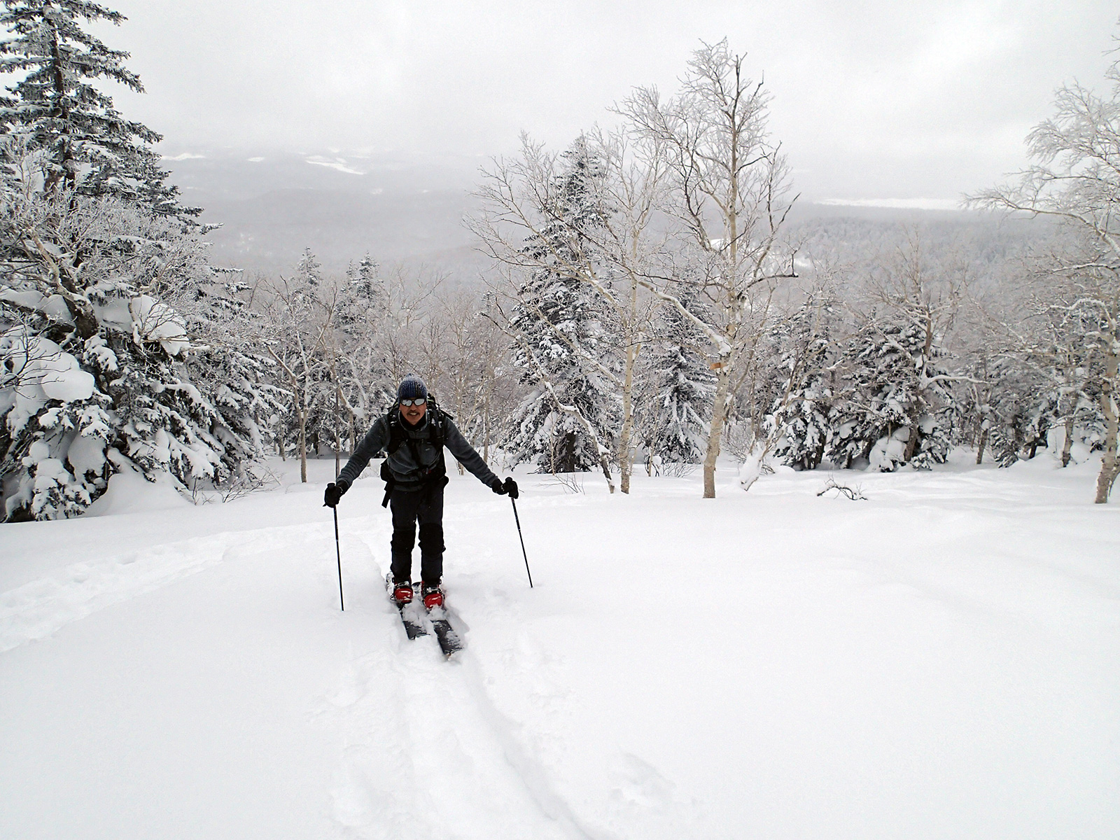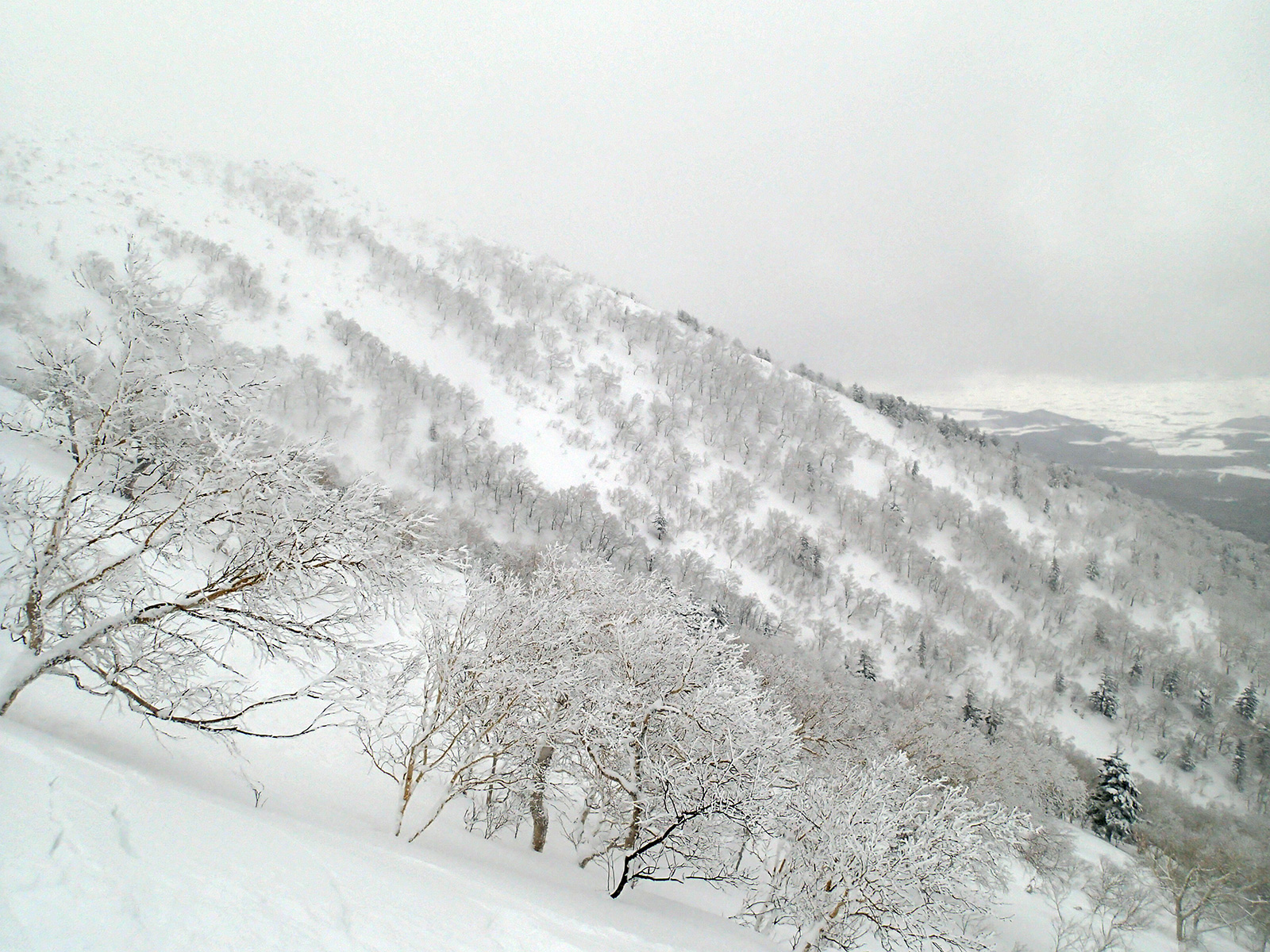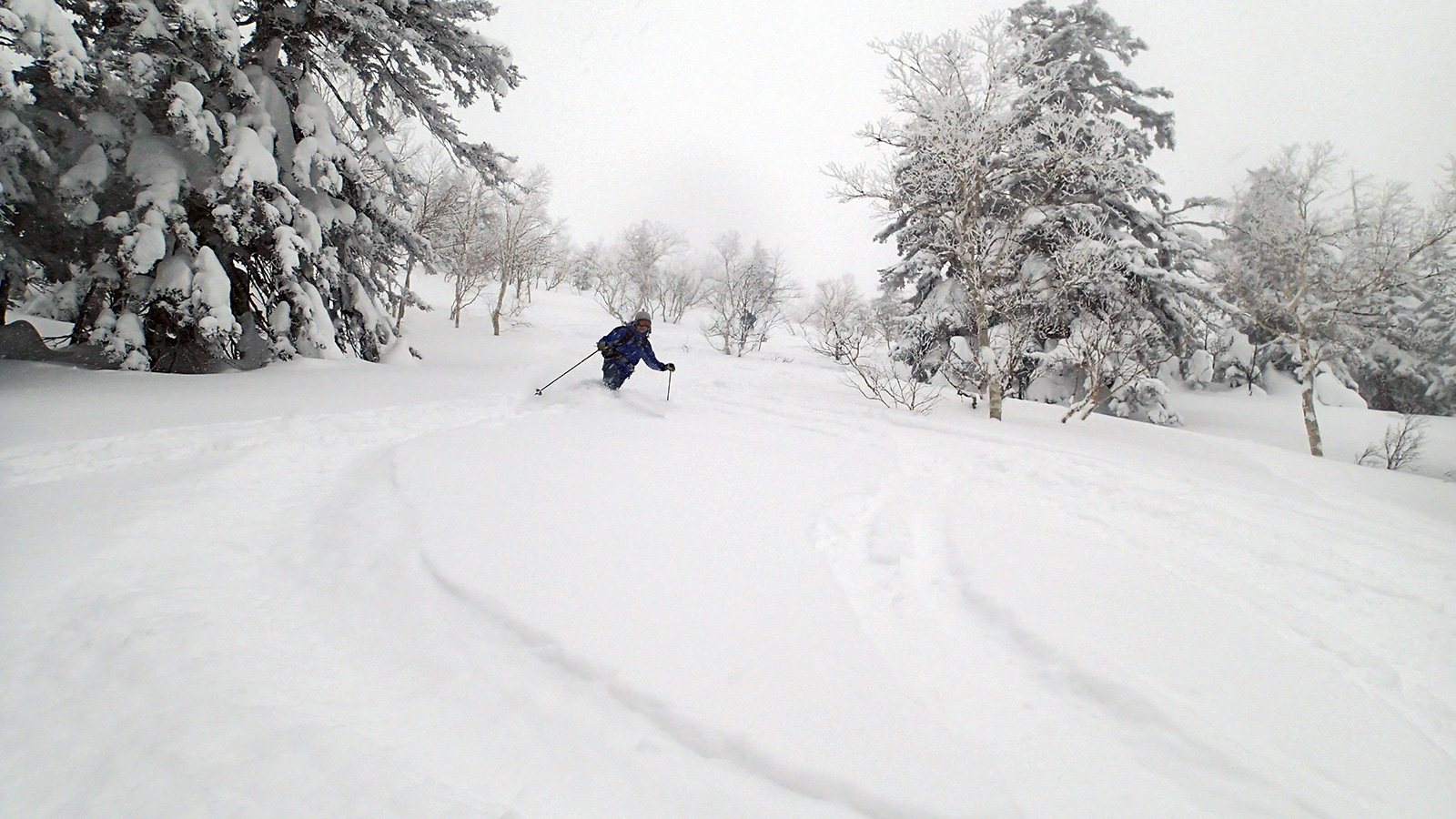雪質:樹林帯は深くて軽い雪。森林限界より上はウィンドクラストの上に20〜30cmのウィンドスラブ