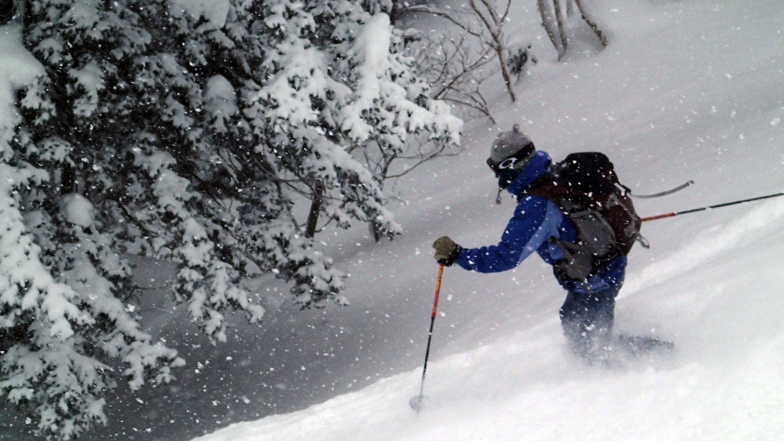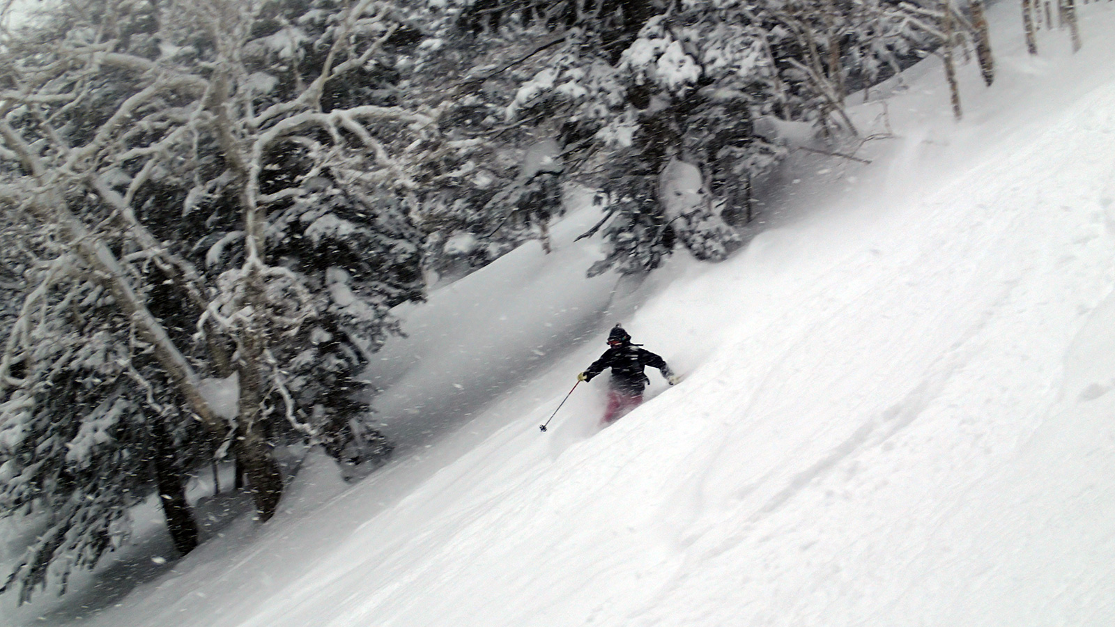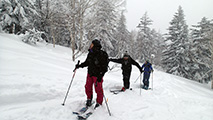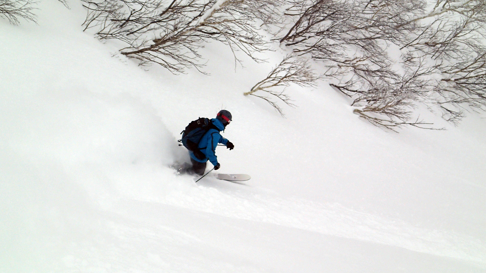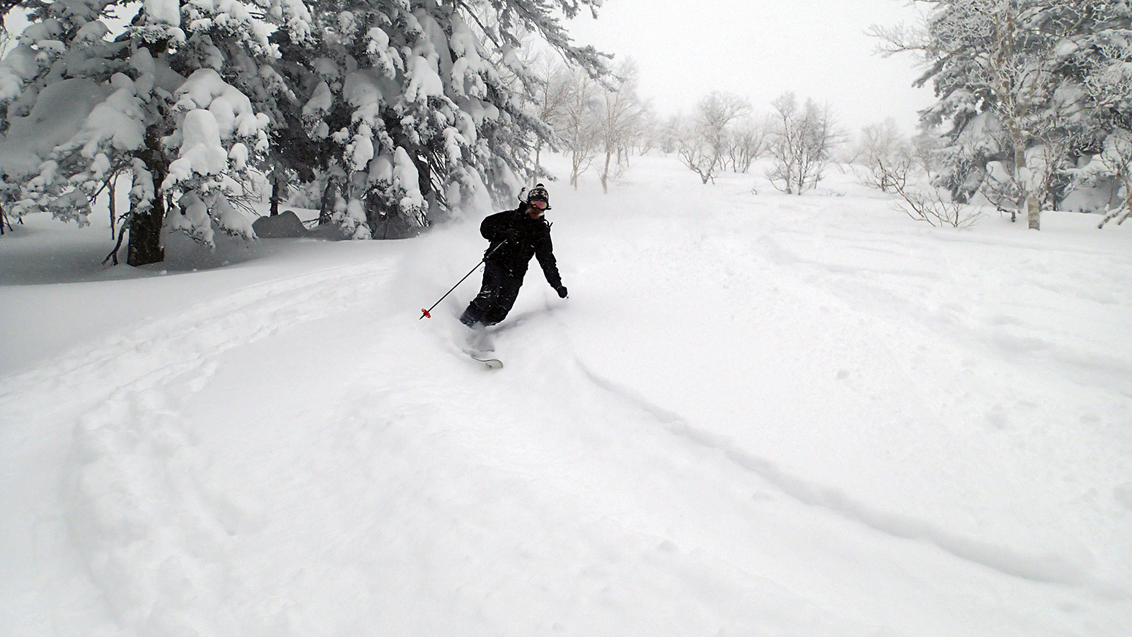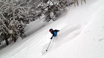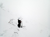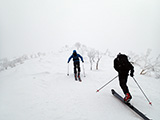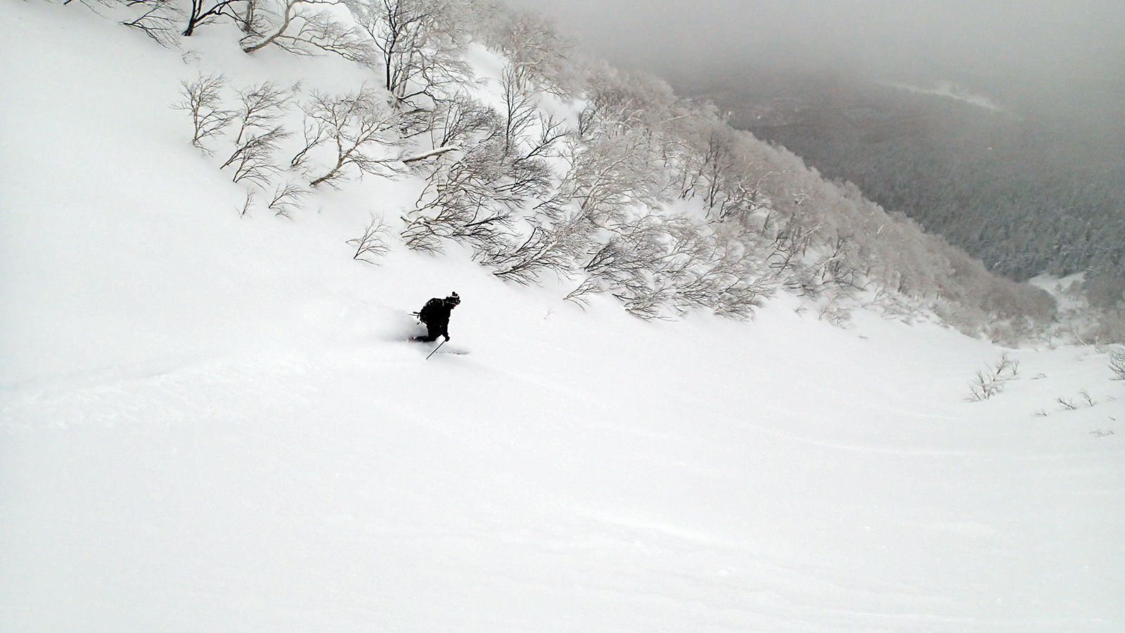 雪質:樹林帯は深くて軽い雪。森林限界より上はウィンドクラストの上に20〜30cmのウィンドスラブ
