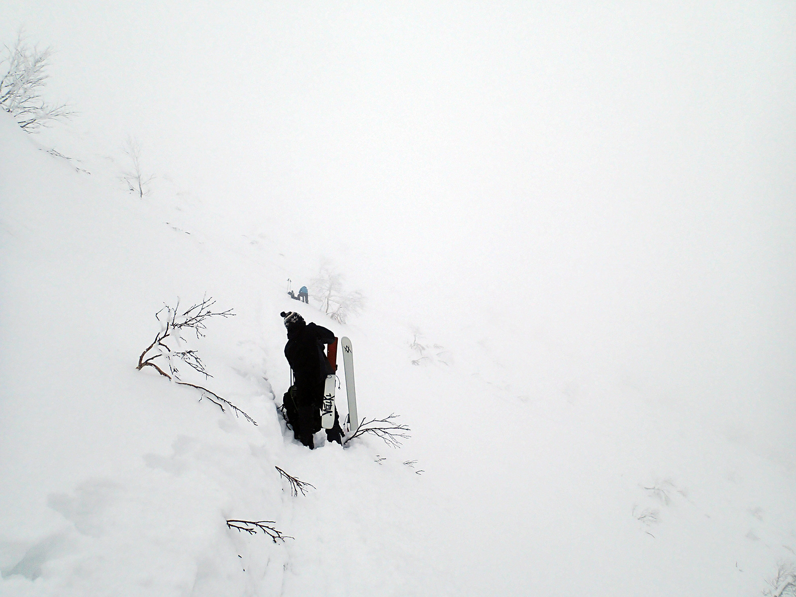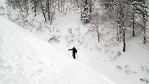 積雪は不安定でウィンドスラブに亀裂が入りやすい状態だった。ただし、吹きだまったところでもそれほどスラブに厚みがなく、柔らかだったことから滑降可能と判断した。