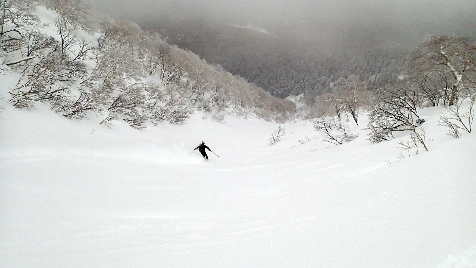 G尾根を1466mまで上がってから、人を避けて二十二林班沢のボトムへ向かったところ、奇跡的にノートラック発見。素晴らしい滑りを楽しめた。それでも途中からシュプールだらけになったので、そこからヤスゲレへトラバースして1本目終了。