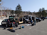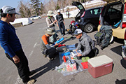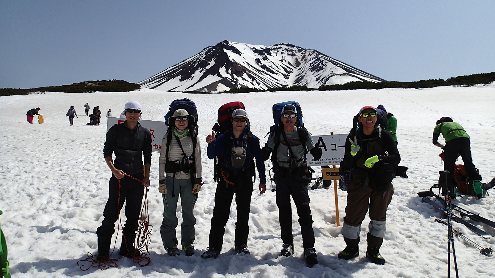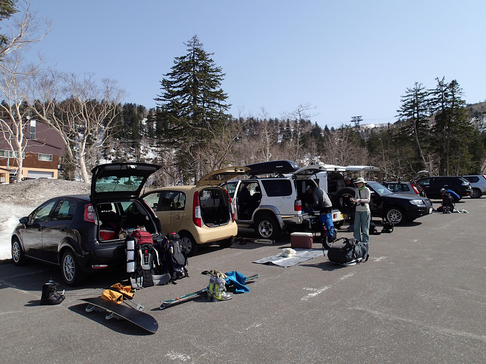 中岳ツアーの初日、快晴。9:00に旭岳ロープウェイ第2駐車場に集合。日焼け止めとシールワックスを念入りに施す。