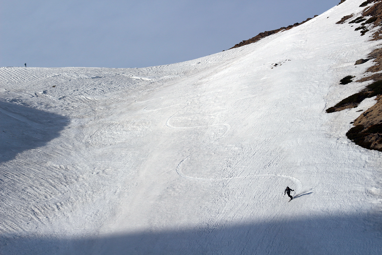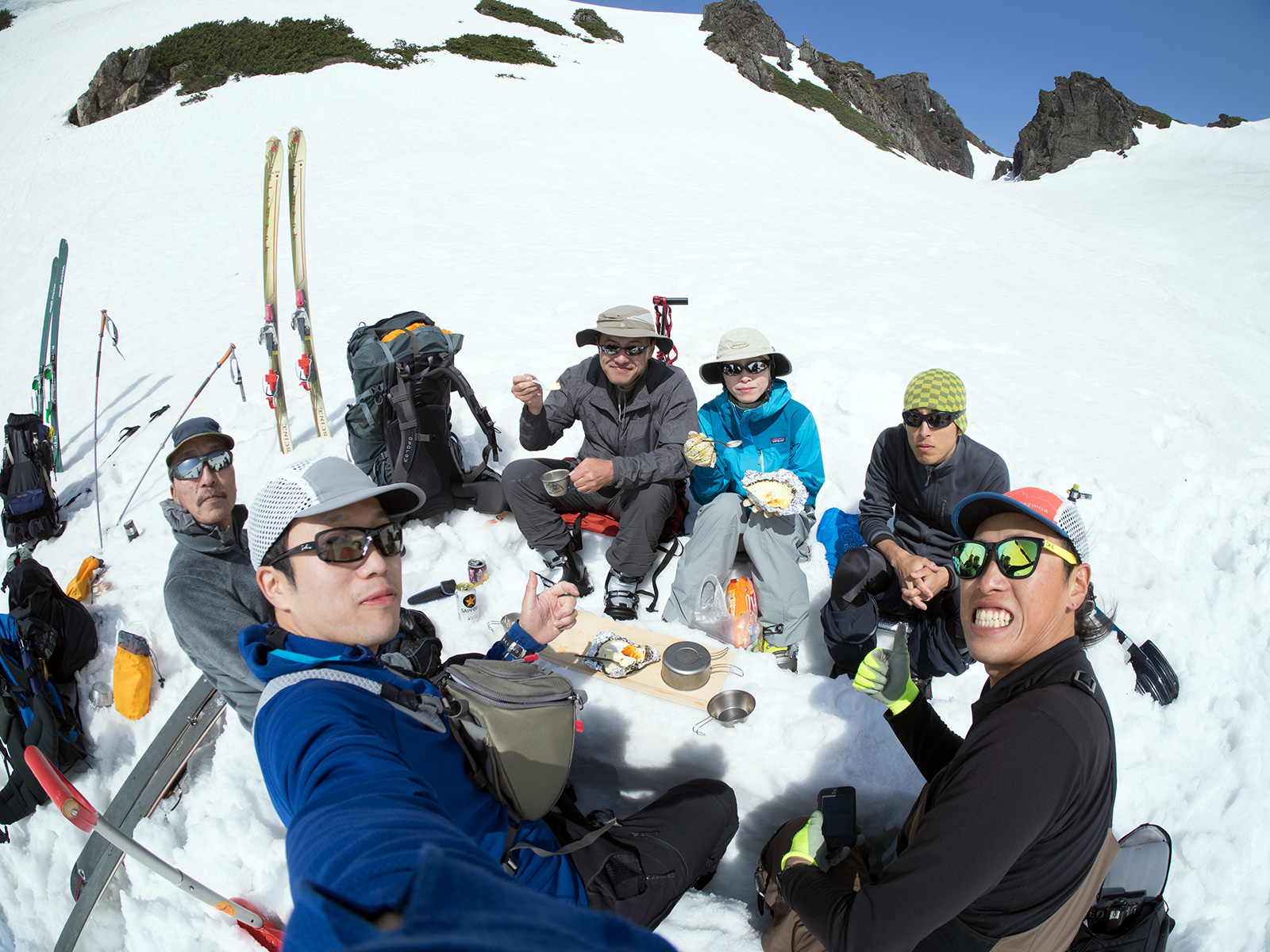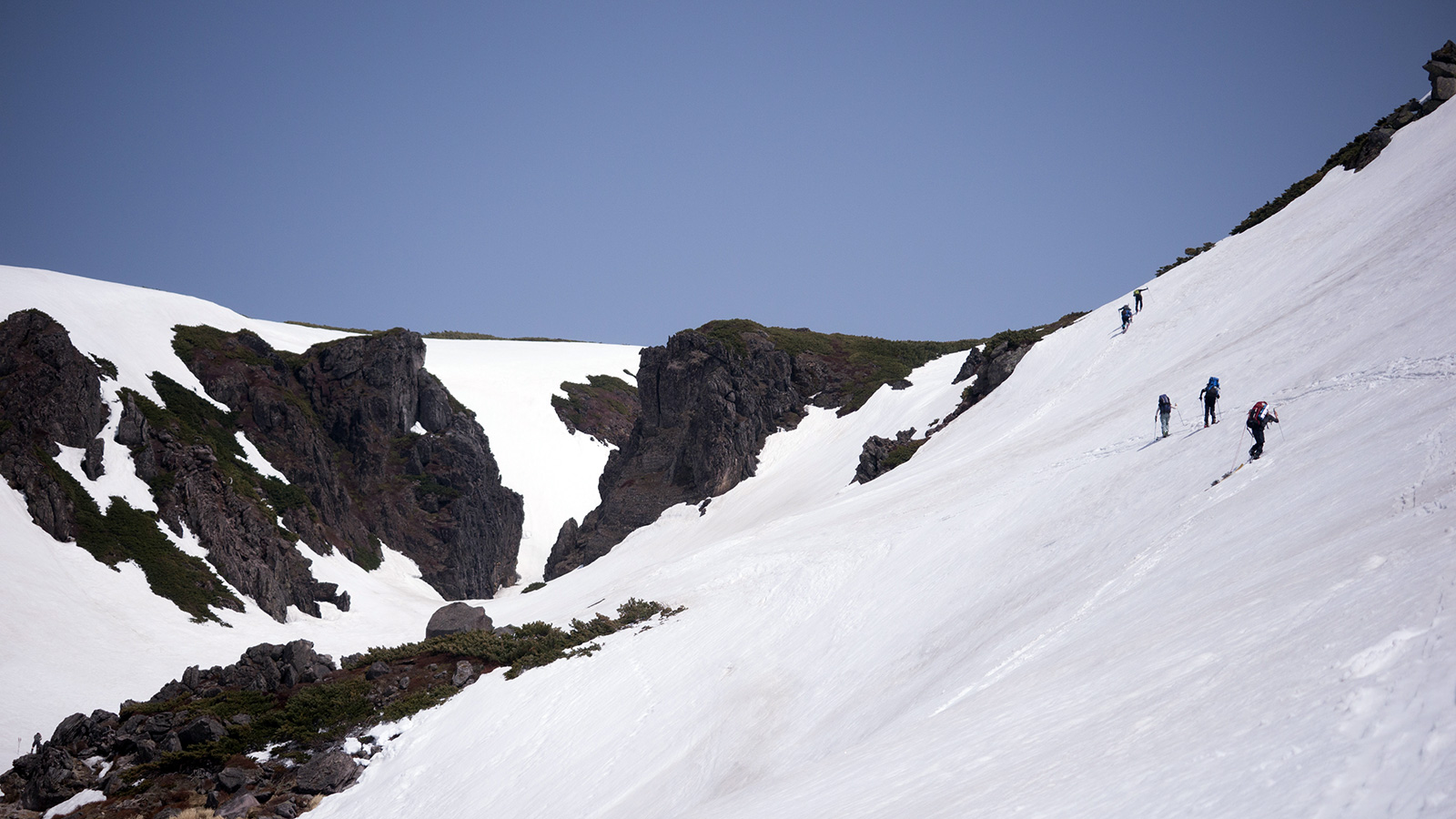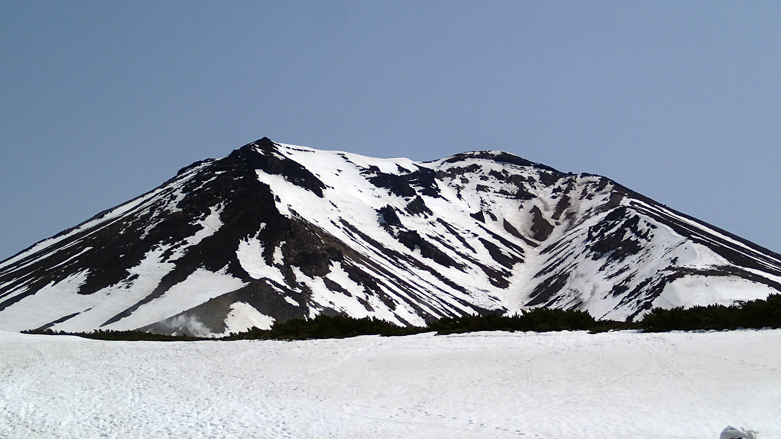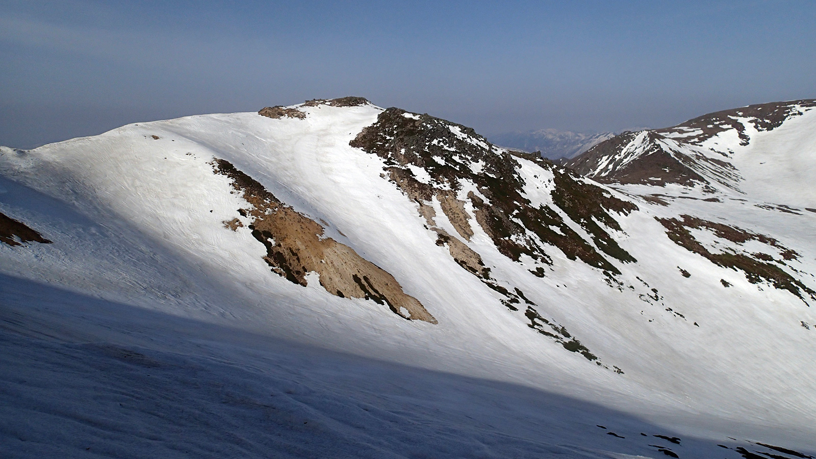 雪量・雪質:例年よりは少ないが、北斜面の雪は豊富に残っていた。概ね滑りやすいザラメだが、日射面やハイマツ周辺は腐り始めているので注意。