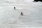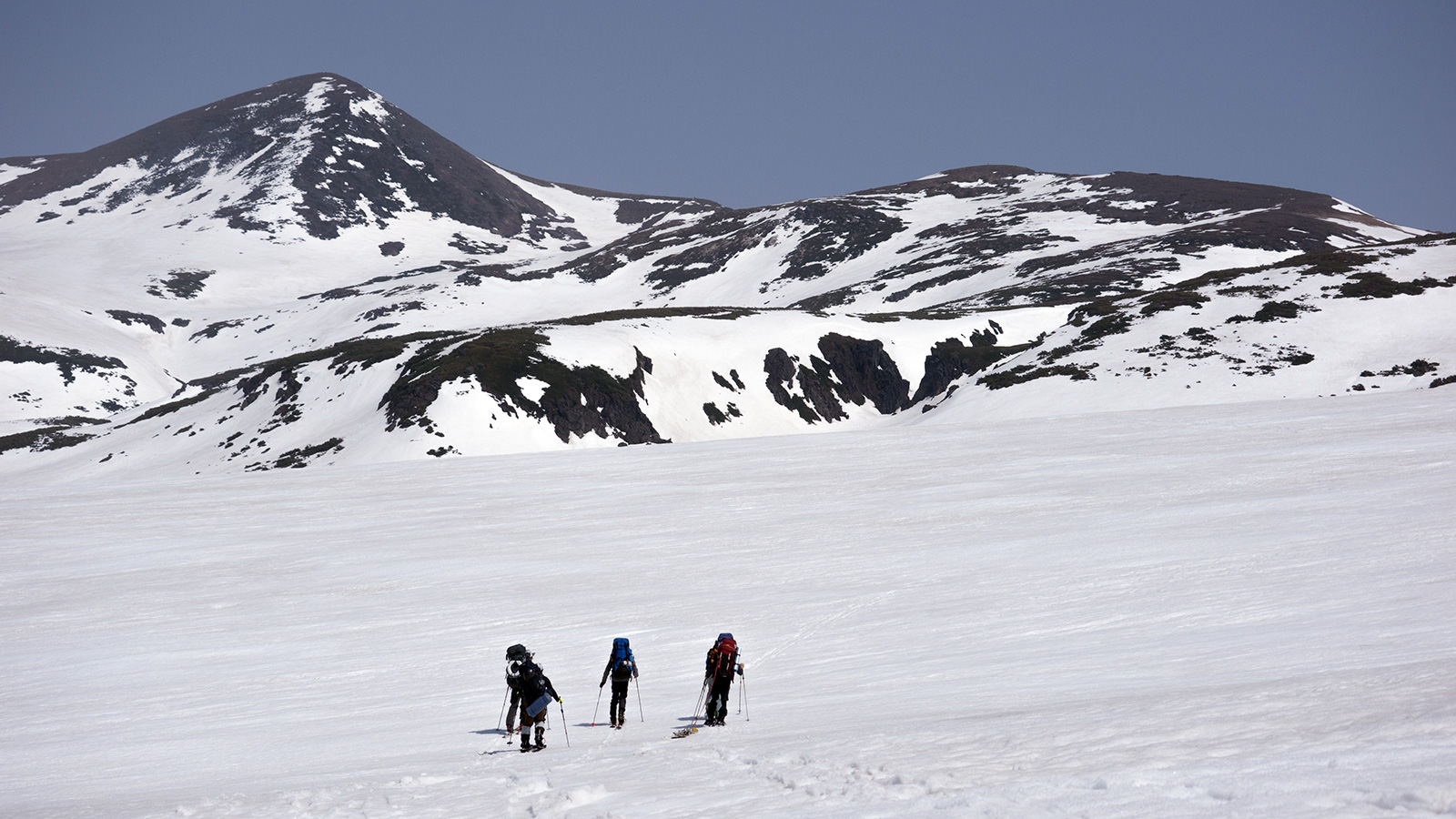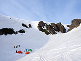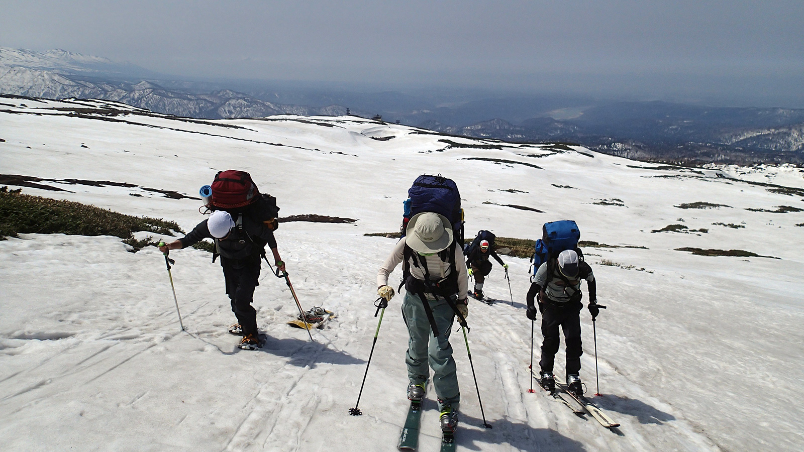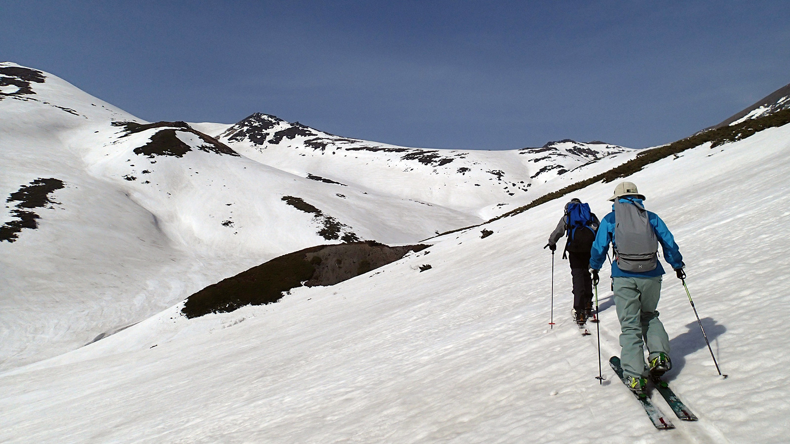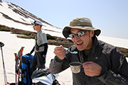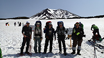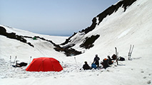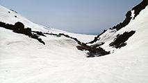 雪の少なさが懸念されたが、北斜面の雪は豊富で問題なし。順調に中岳温泉に到着。