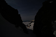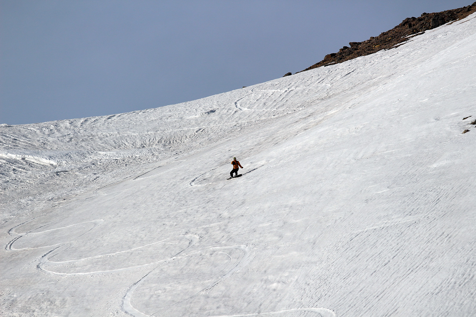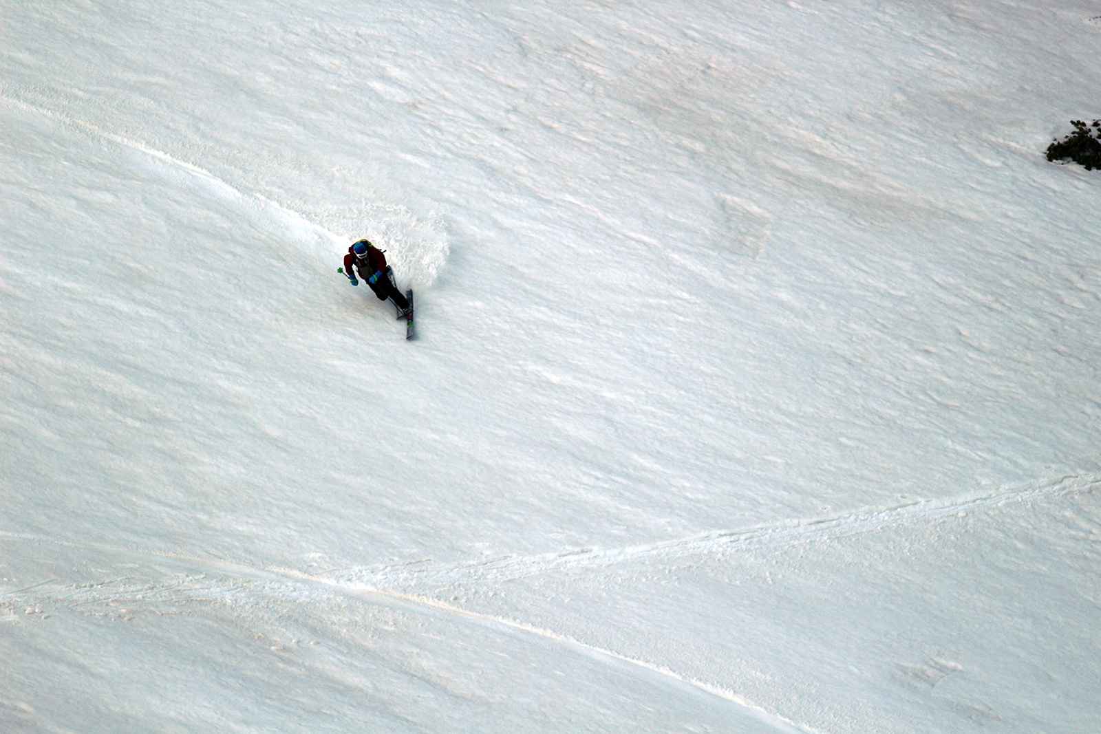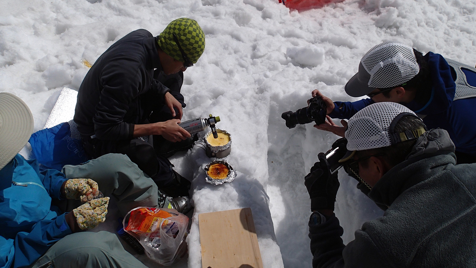 山頂直下で風を避けて休憩し、安足間南斜面のコンディションと撮影条件を勘案して、安足間岳東斜面から比布岳南斜面にかけて滑降した。