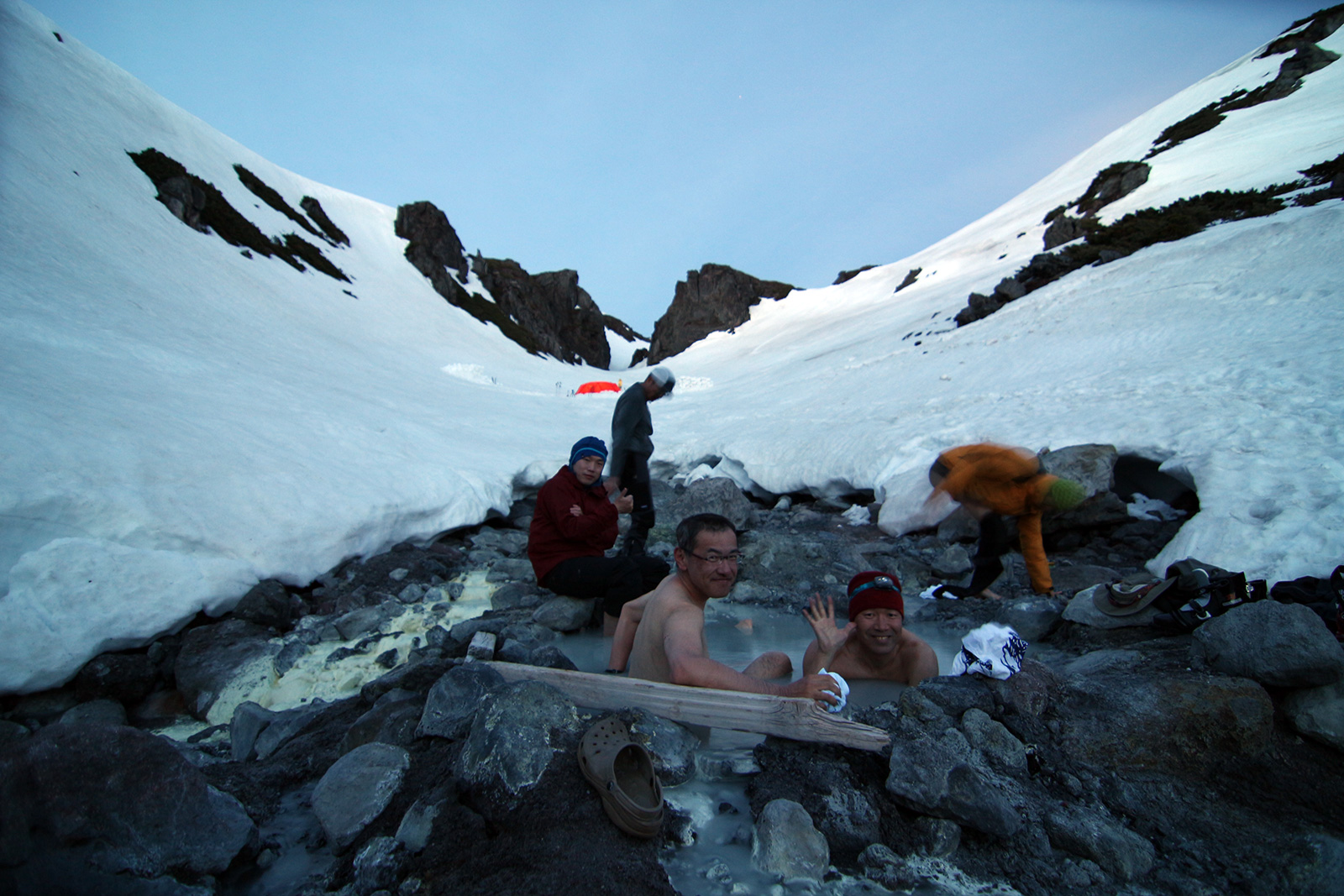 日没前に幕営地点に戻り中岳温泉に入浴したが、湯温が低く水深も浅かったので、大西とtake以外は足湯で済ませてしまった。