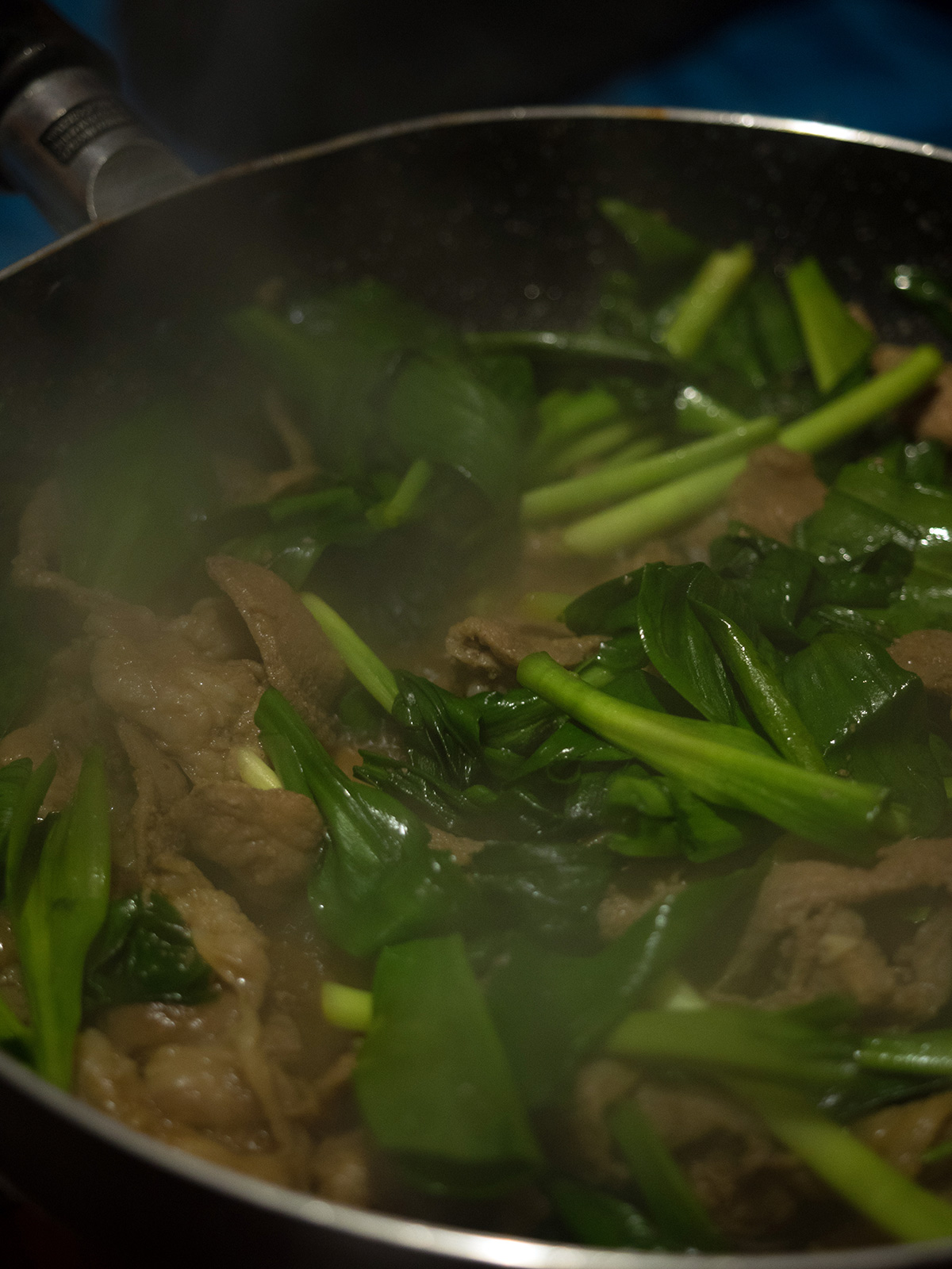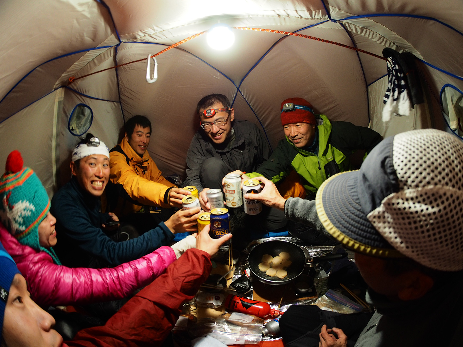 そして、いよいよ宴会開始。宴会用テントとして新規購入したダンロップV6は、天井が低いので缶ビールを飲むときに後頭部が支えてしまうが、8名くらいまでは煮炊きしながら宴会ができる。