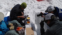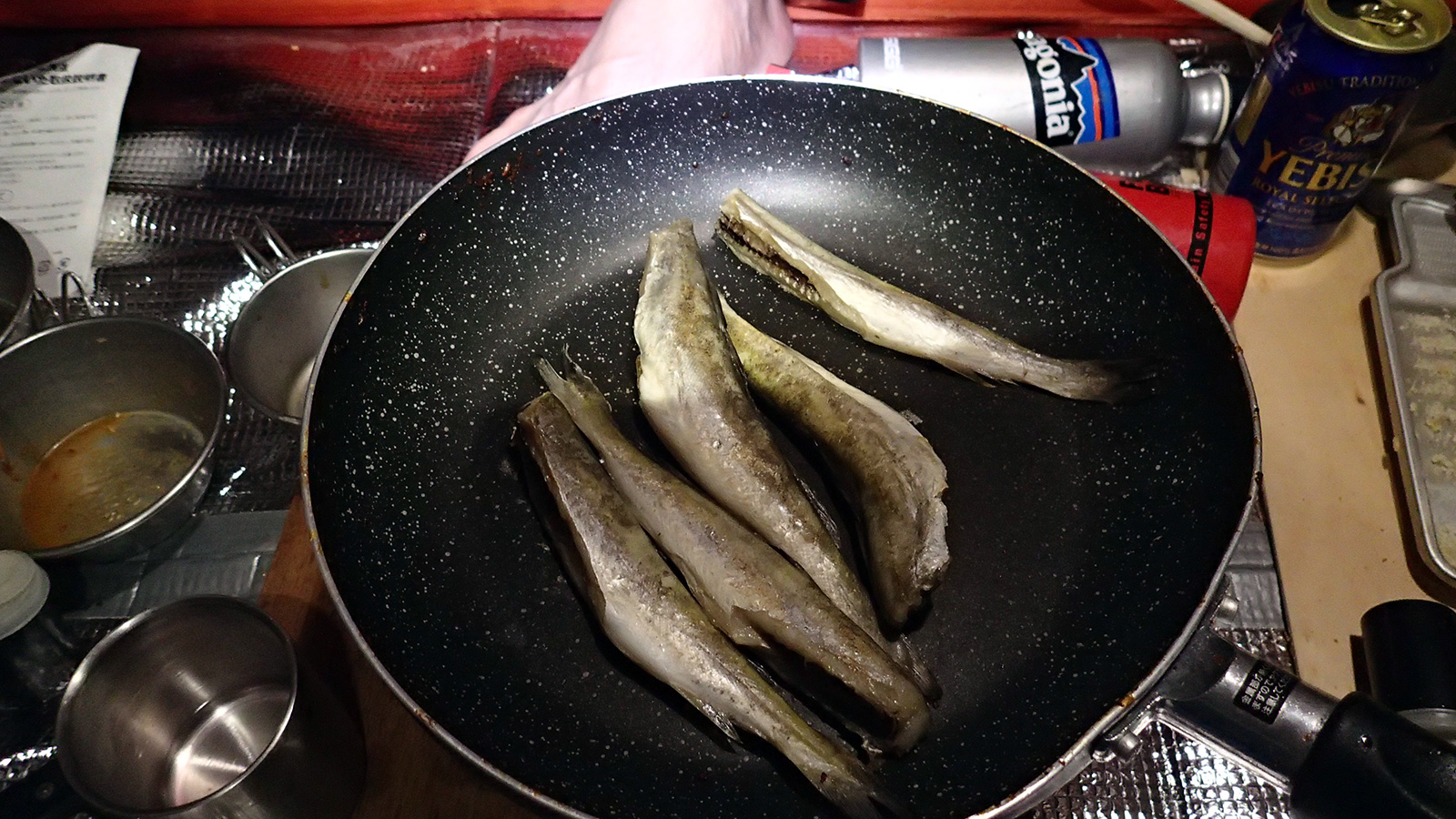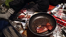 食糧計画担当の田中パパによる夕食のメニューは素晴らしく、メインの焼肉のほか、コマイ・イカ・ホタテなどの魚介類、さらにsokuzaさんが持参してくれたキトピロ、根わさびを堪能できた。もちろんビールやワインなどのお酒も豊富で楽しい宴会となった。