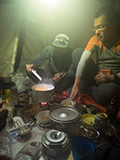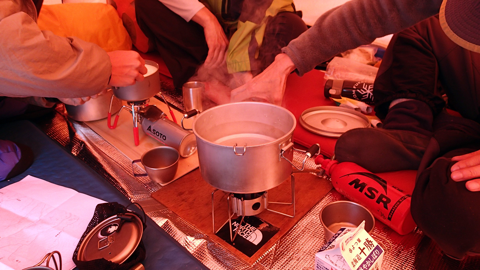 テント内でのSOTO ST-310とMSRドラゴンフライの煮炊き二台体制は効率が良かった。今回から導入したガスストーブSOTO ST-310+パワーガスは低重心なので安心できる。厳冬期にどれくらい使えるかは不明だが、この時期ならパワーに問題ない。