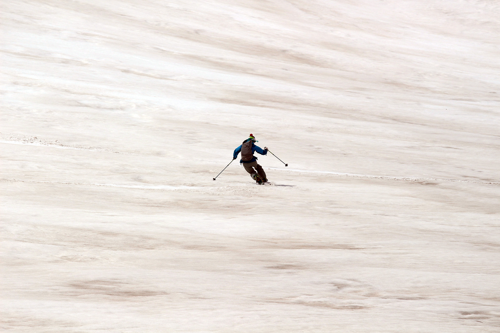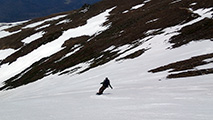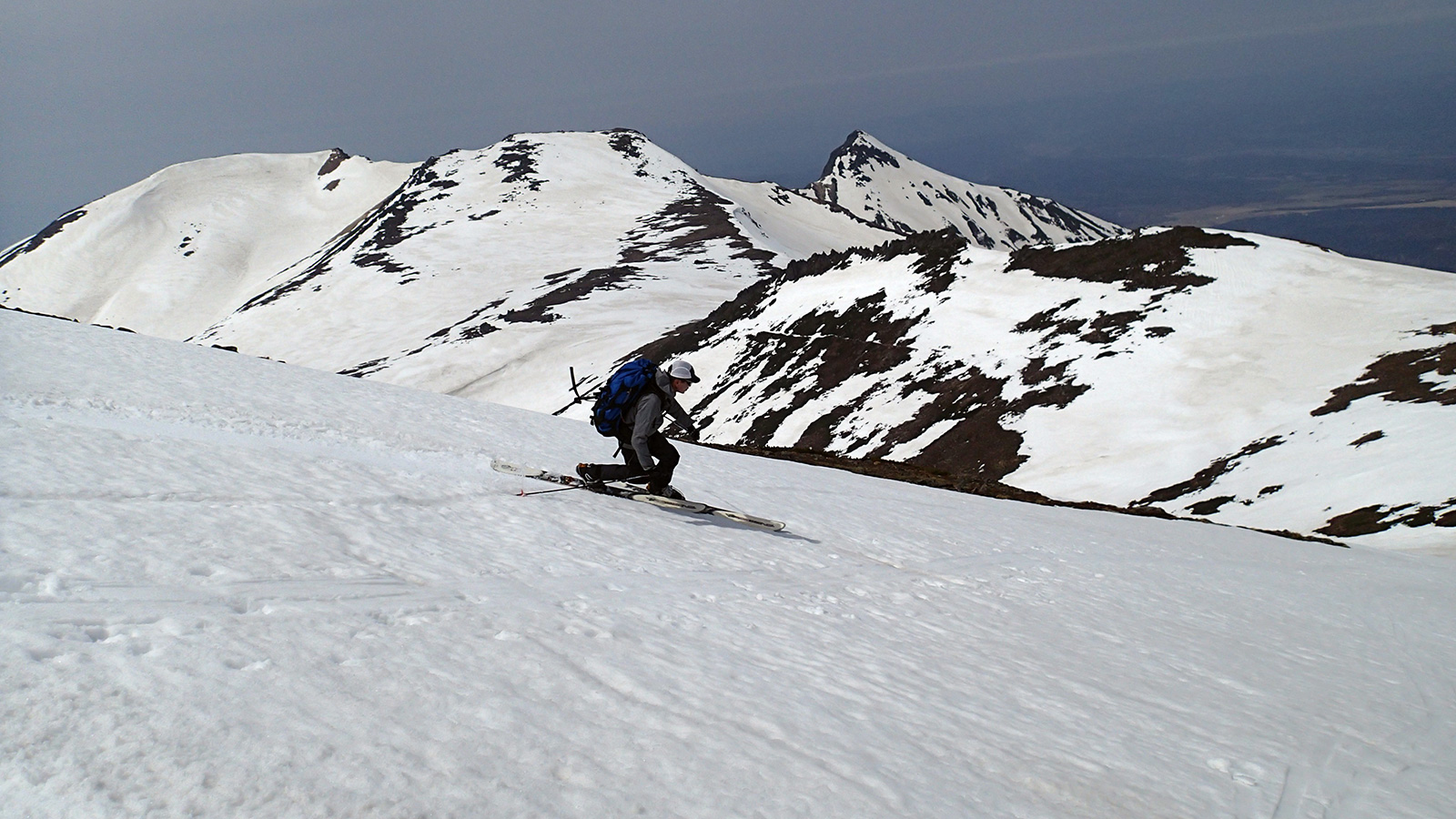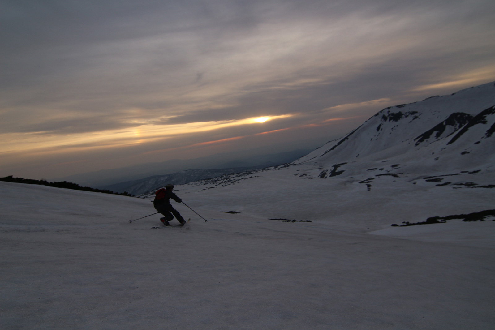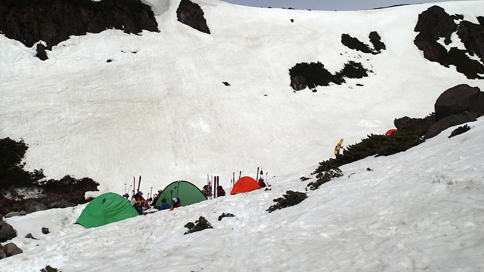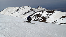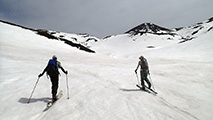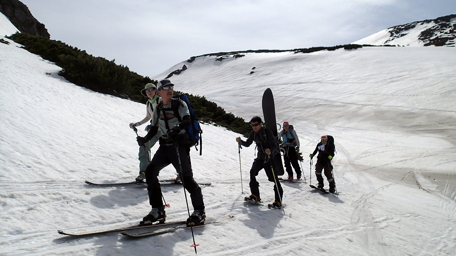 北鎮岳北西斜面の滑降は、腐った雪やストップ雪、凹凸に少々手間取ったが、ラインを選べば快適だった。