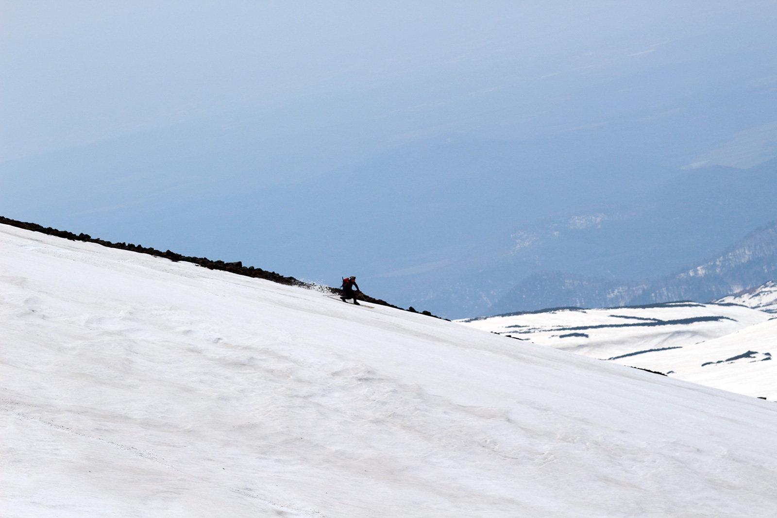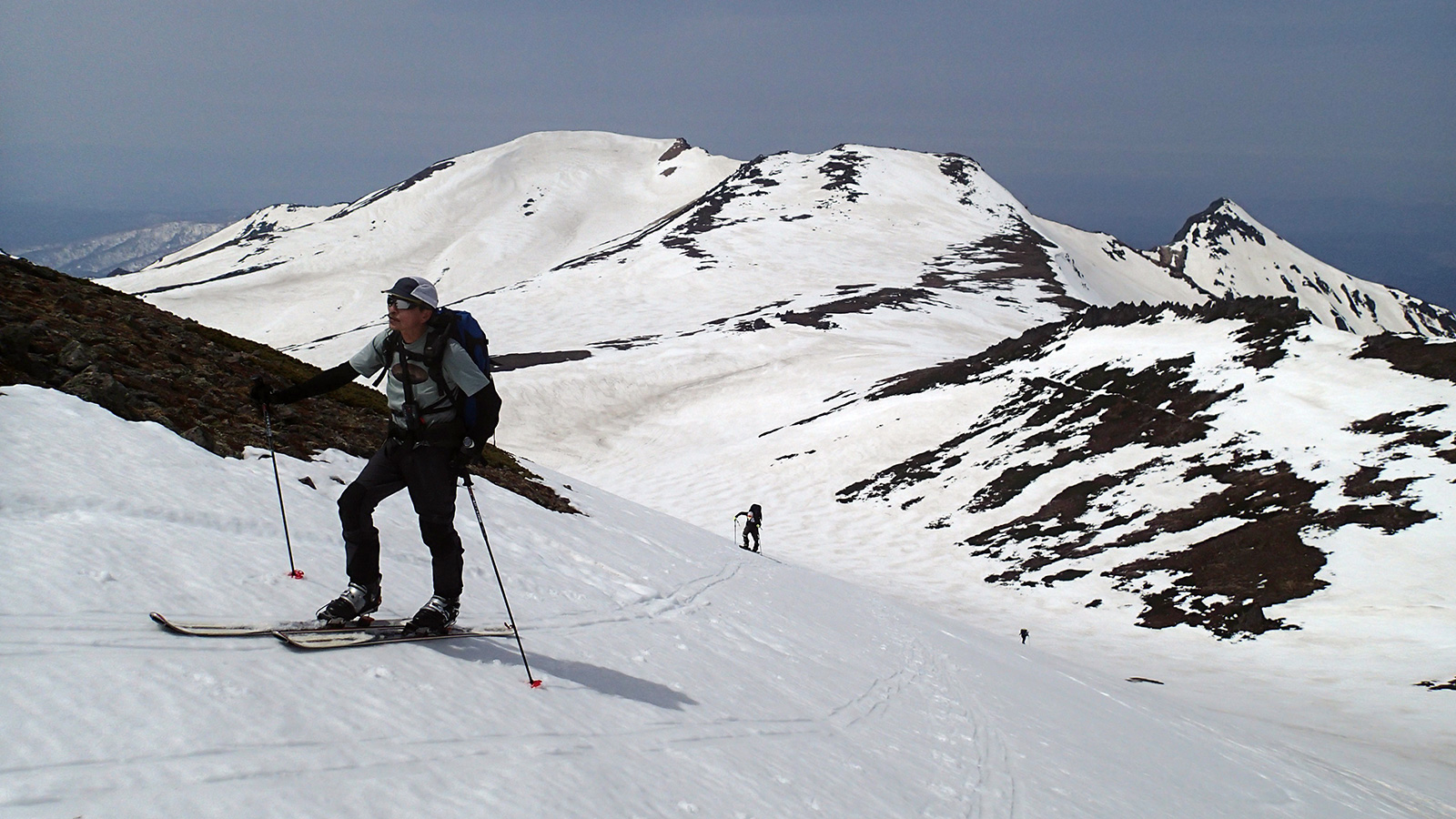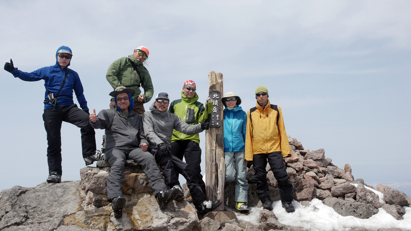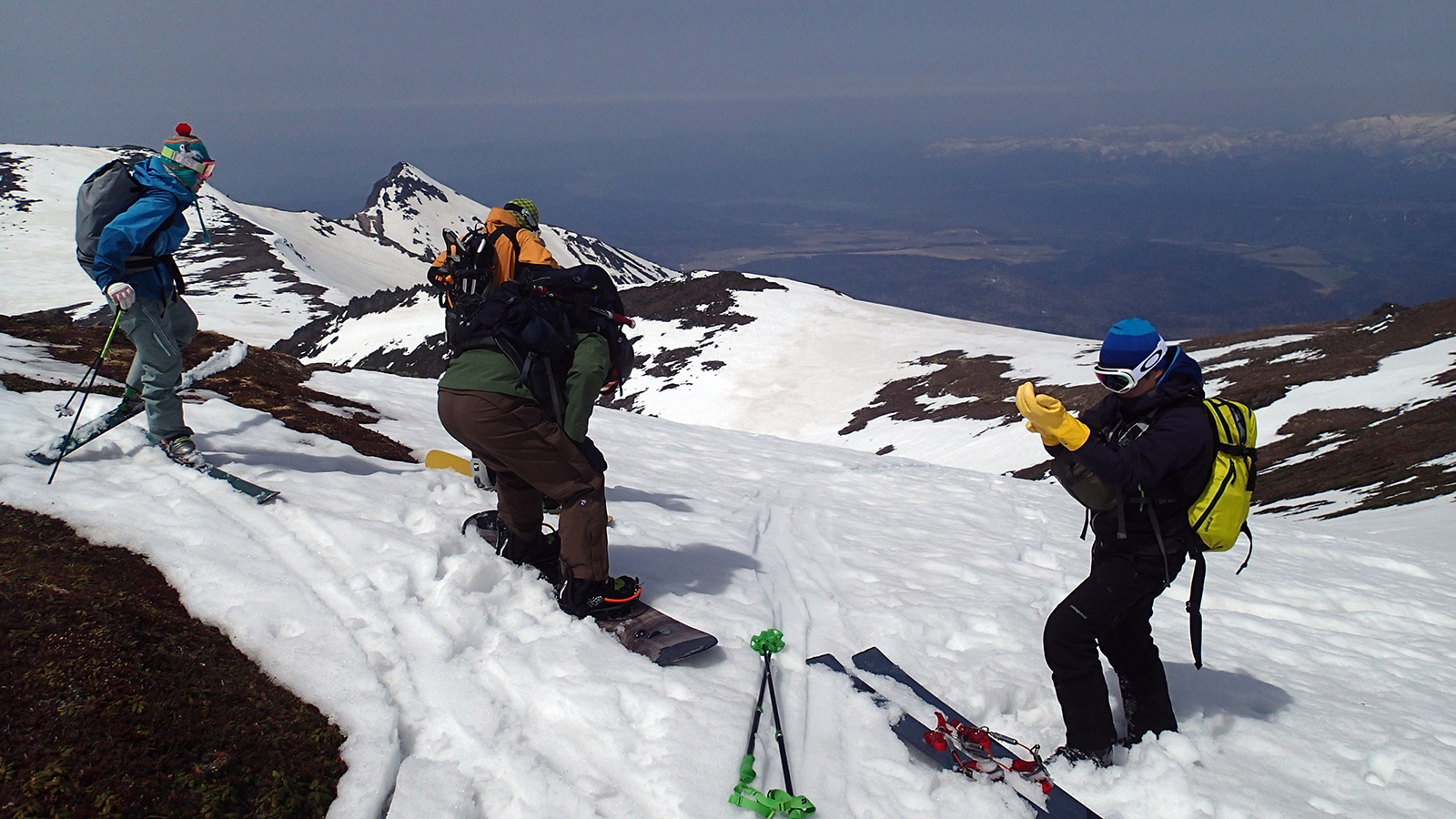 やっと着いた山頂では Hokkaido backcountry guidesの塚原さん達のツアーと遭遇できた。山頂は風が強かったが、ここから見る広大な御鉢平や大切の山々の景観は素晴らしい。