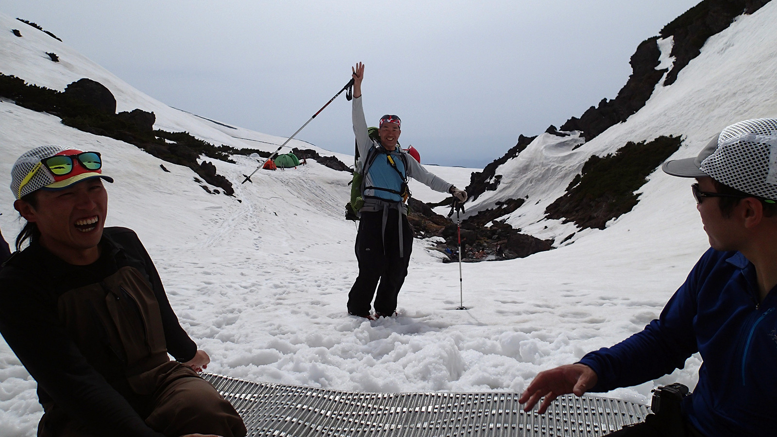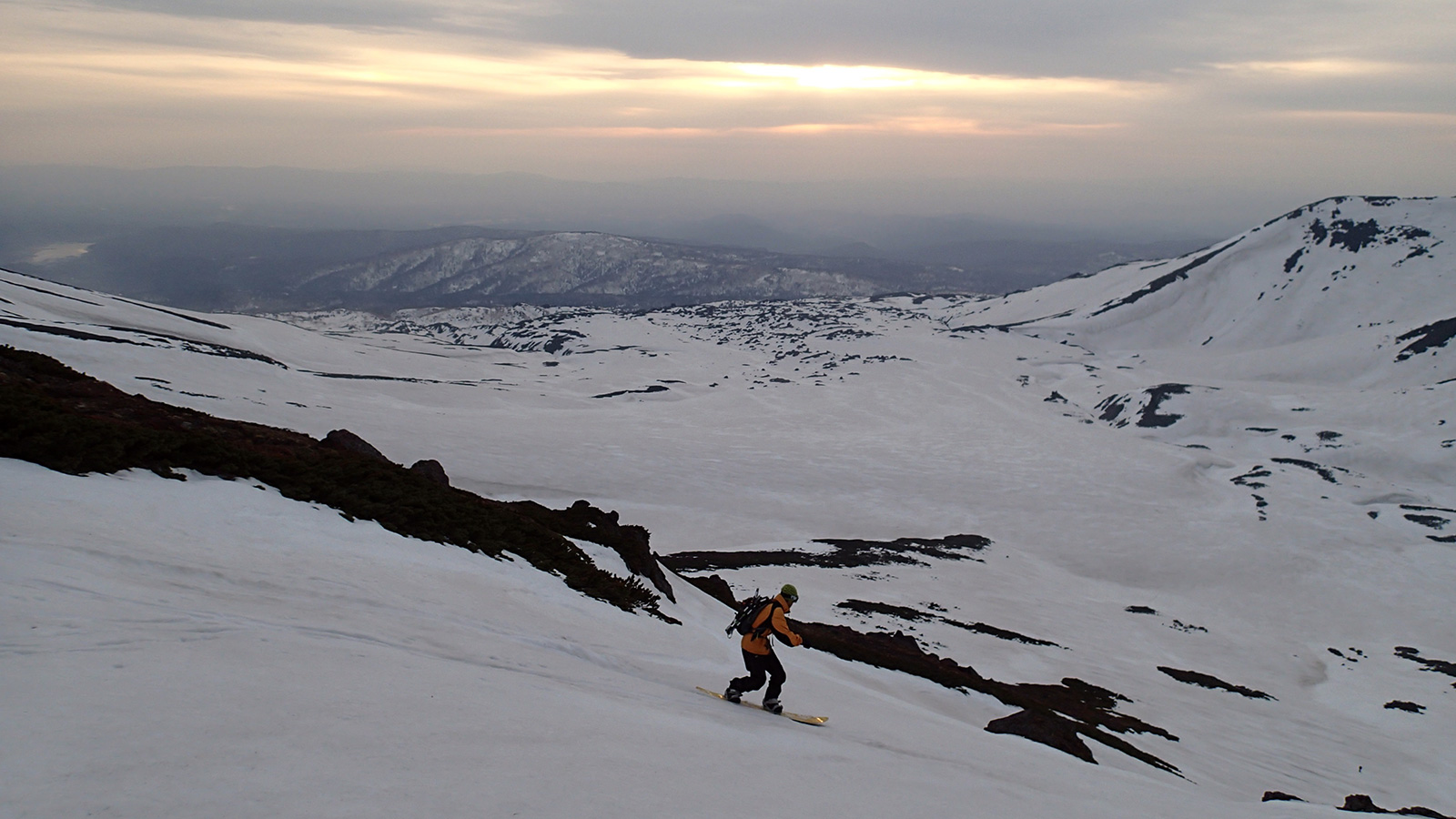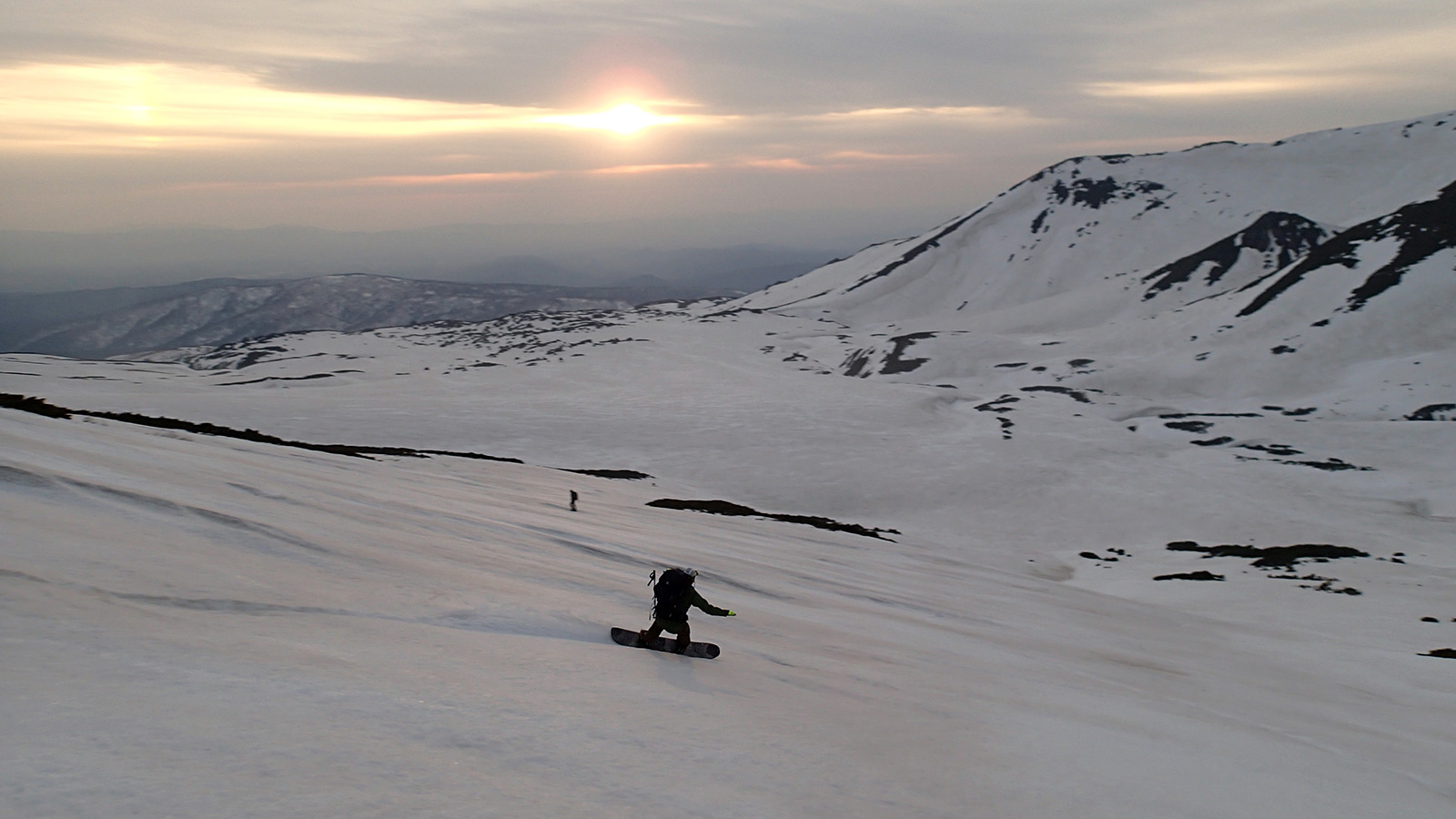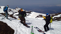 やっと着いた山頂では Hokkaido backcountry guidesの塚原さん達のツアーと遭遇できた。山頂は風が強かったが、ここから見る広大な御鉢平や大切の山々の景観は素晴らしい。