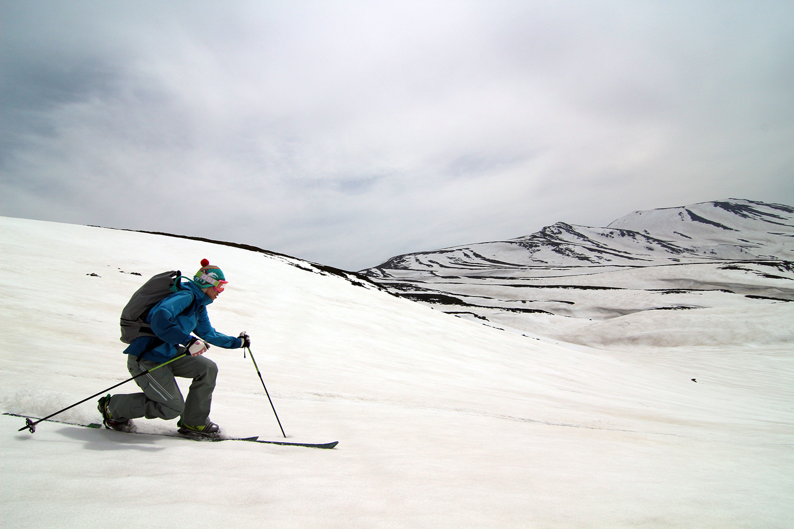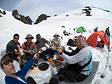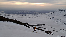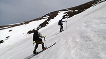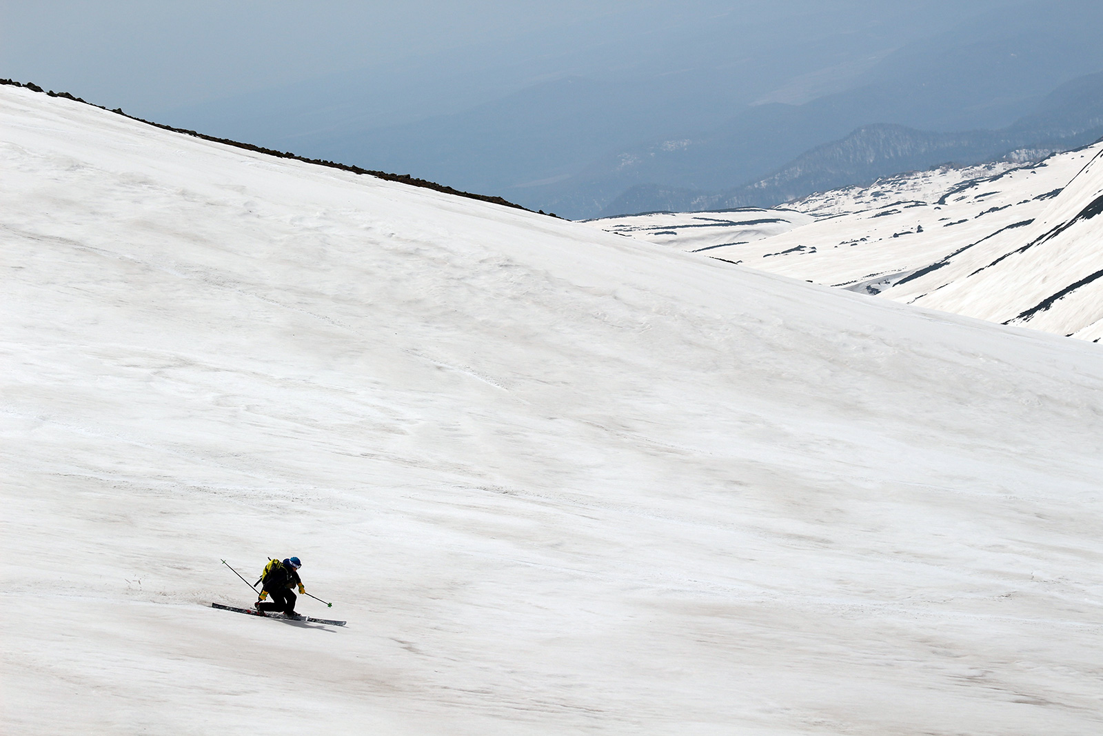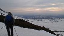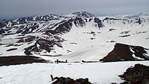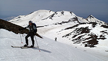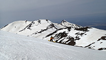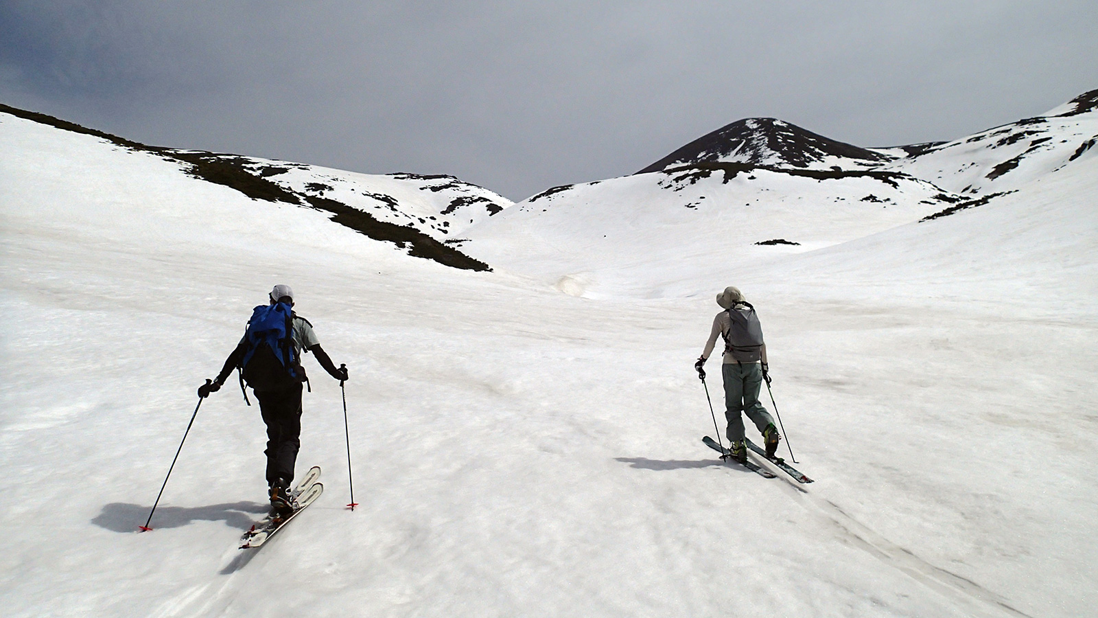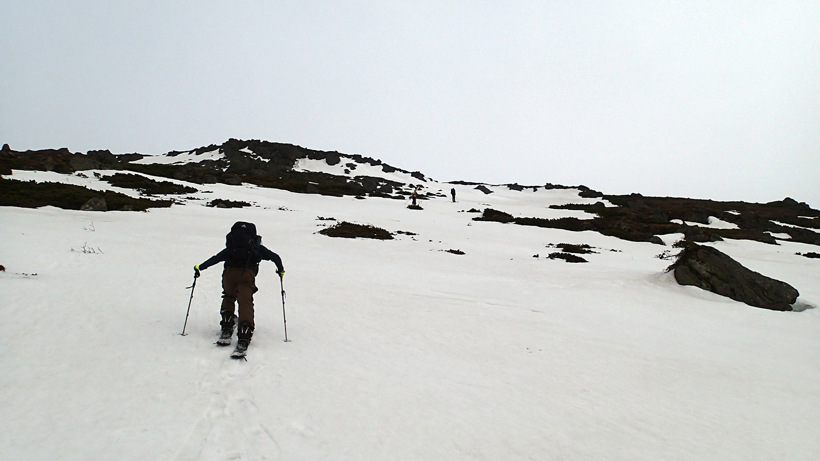 やっと着いた山頂では Hokkaido backcountry guidesの塚原さん達のツアーと遭遇できた。山頂は風が強かったが、ここから見る広大な御鉢平や大切の山々の景観は素晴らしい。