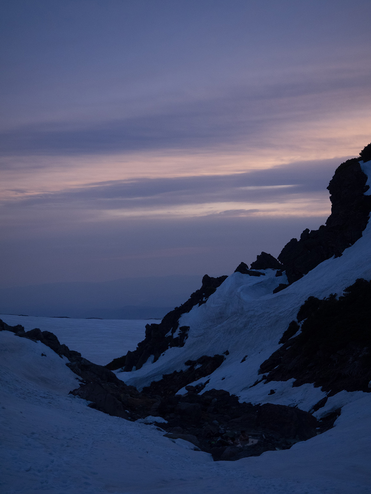 予定より少々遅れて13:00に中岳温泉で食事と休憩。前日の夕食で残った焼肉とH本のスイーツを楽しんだ。ここでtakeさんとお別れ。その後皆で温泉に入浴し、酒も入って旭岳北斜面のピストンはパスすることになったが、夕陽を滑るシーンを撮影することになり、日没時間を狙って熊ヶ岳へ出発。
