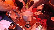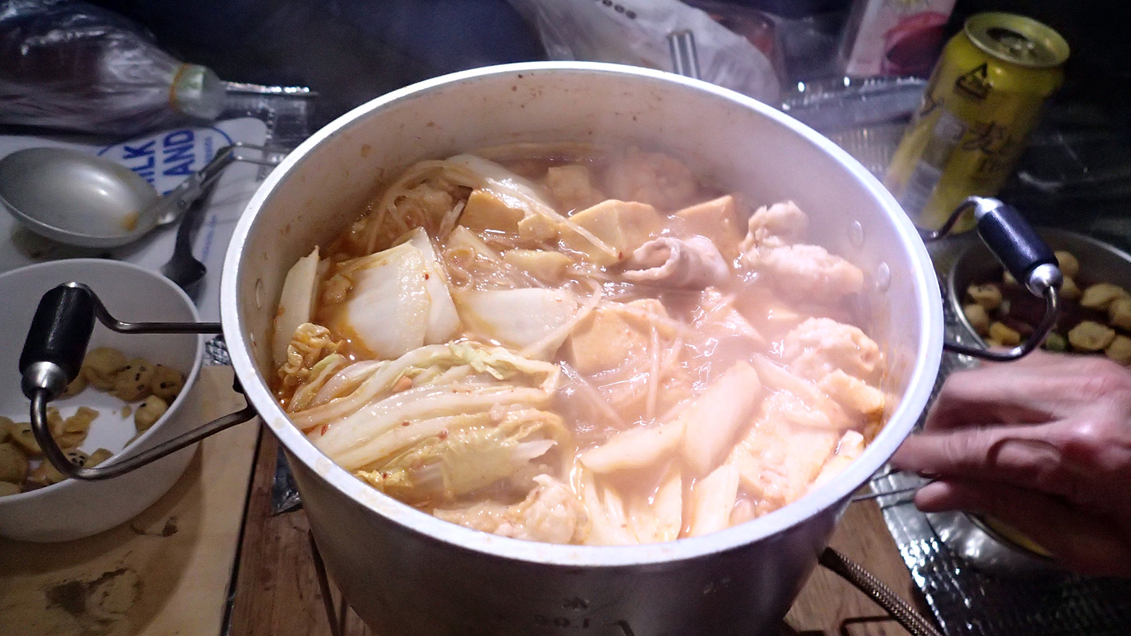 熊ヶ岳からの夕陽は感動的だった。気温が下がり雪のコンディションは良くなったのだが、大きな凹凸があって田中パパが派手に吹っ飛んだ。sokuzaさんが板を流すなどトラブルもあったが、なんとか撮影は無事終了し、宴会二日目に突入。キムチ鍋(豚バラ+キトピロ+白菜+高野豆腐+キノコ+春雨)を楽しんだ。