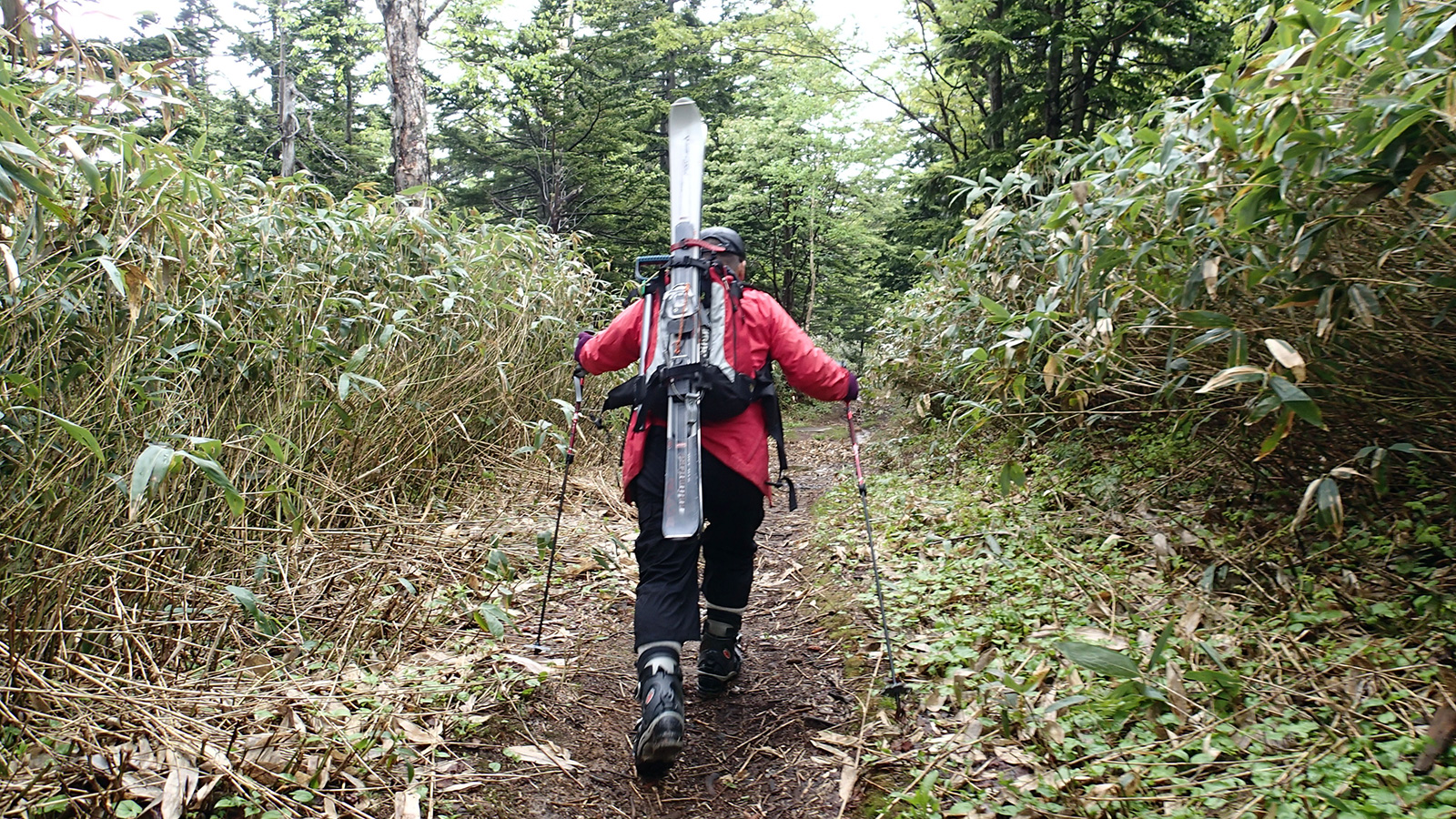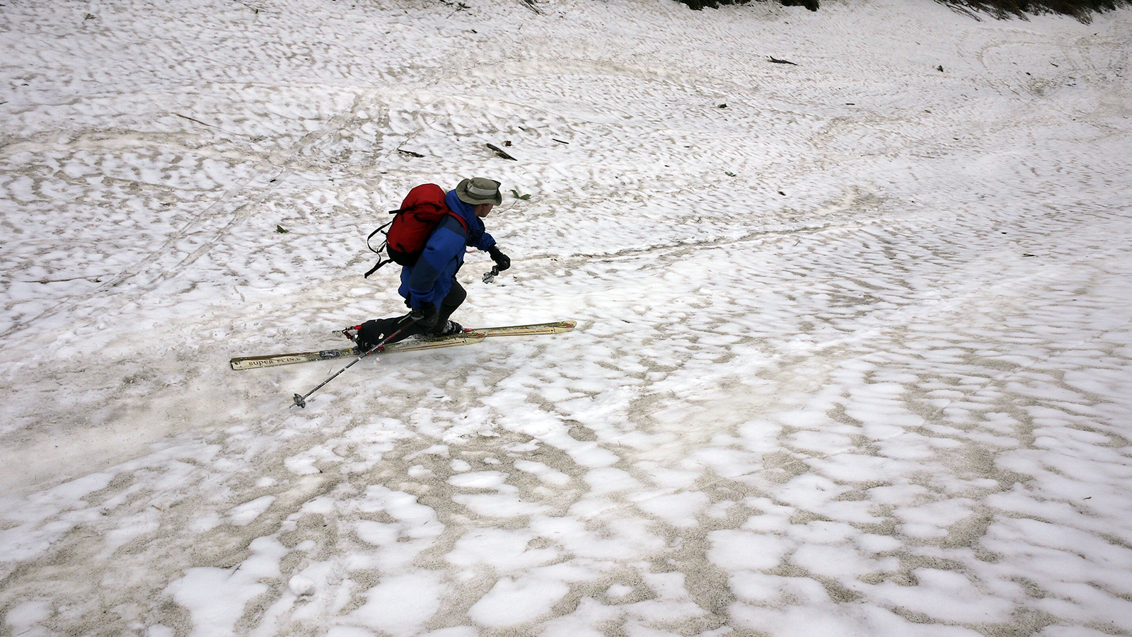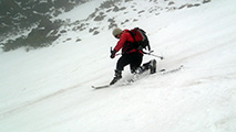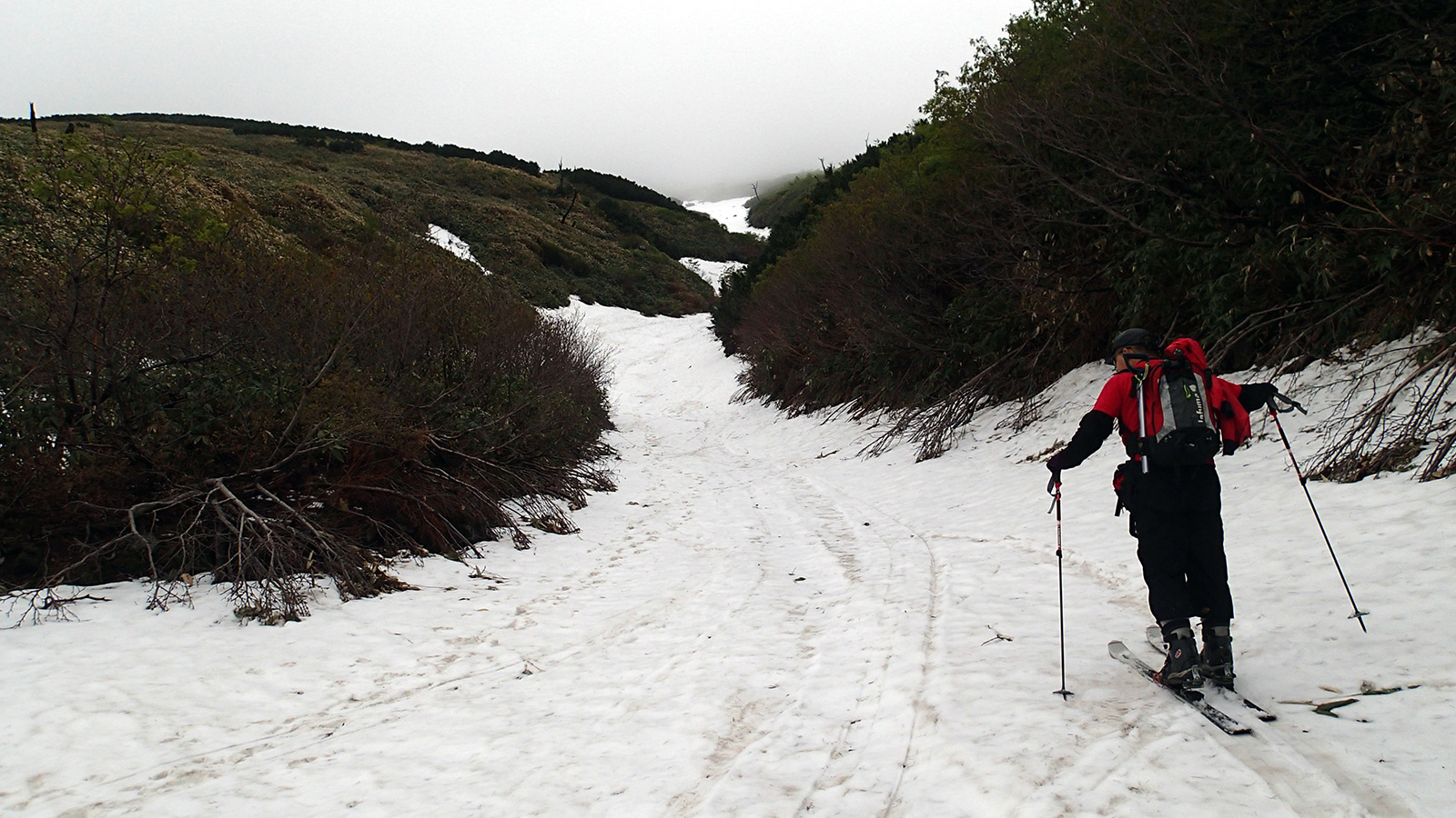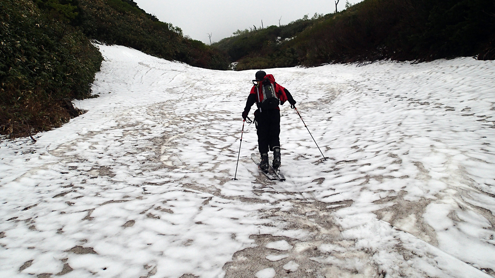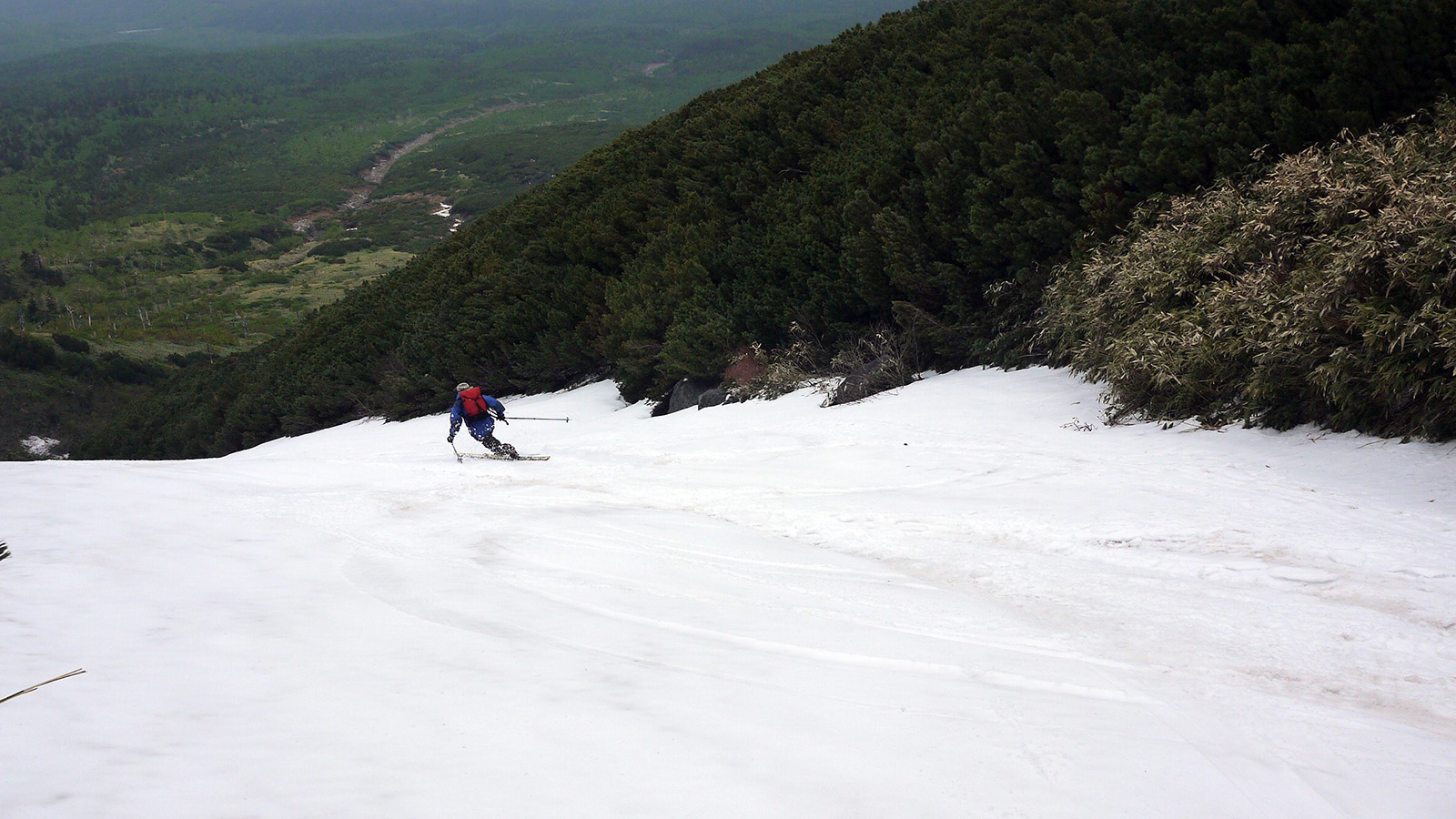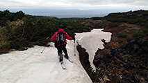 雪量・雪質:残雪スキーとしては十分、藪漕ぎ無し。ザラメの上に2〜3cmの新雪、上部はアイス