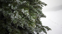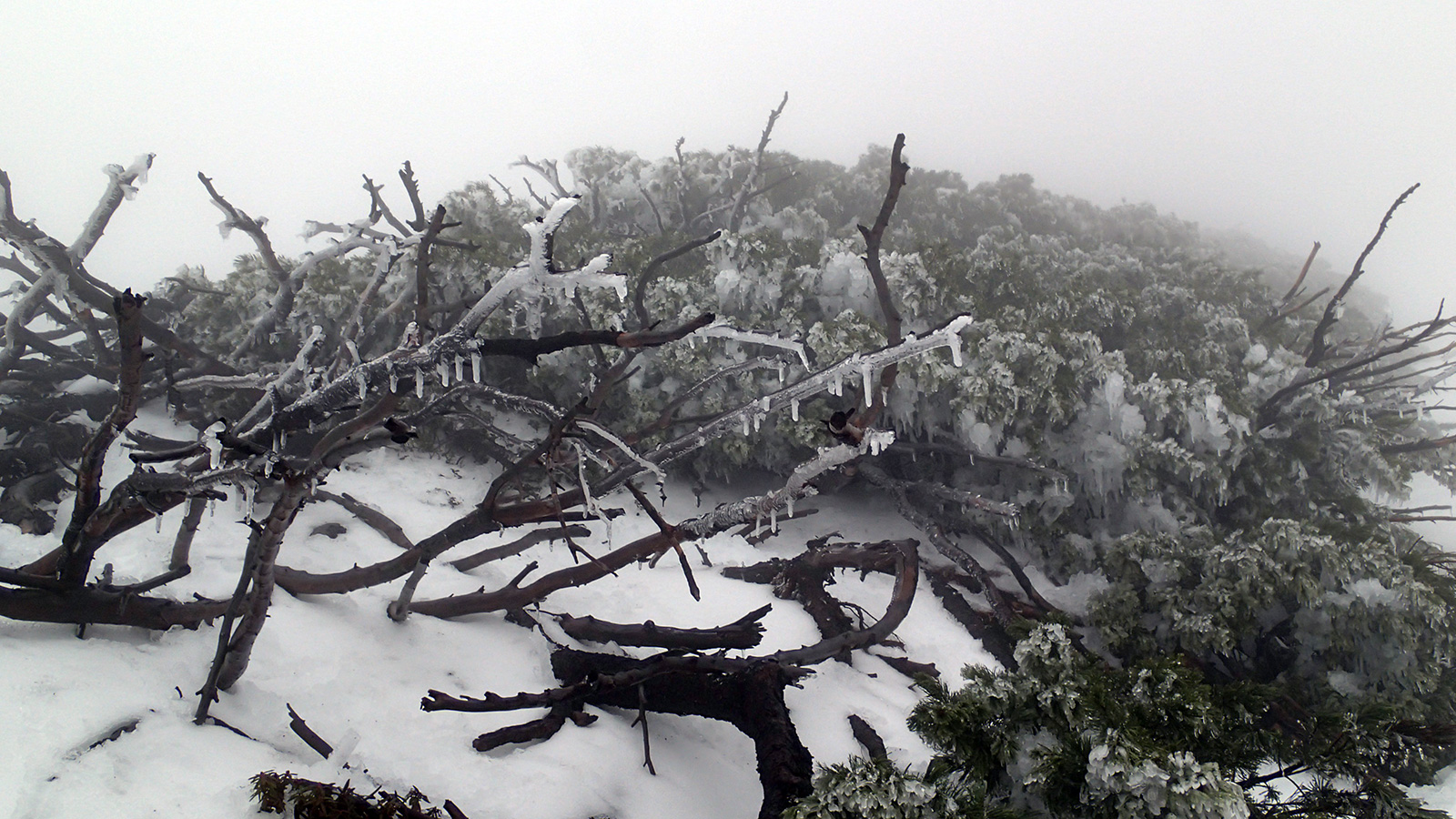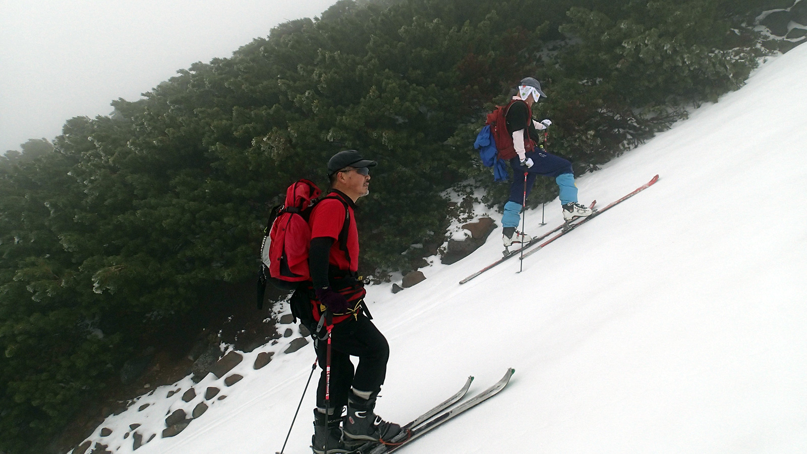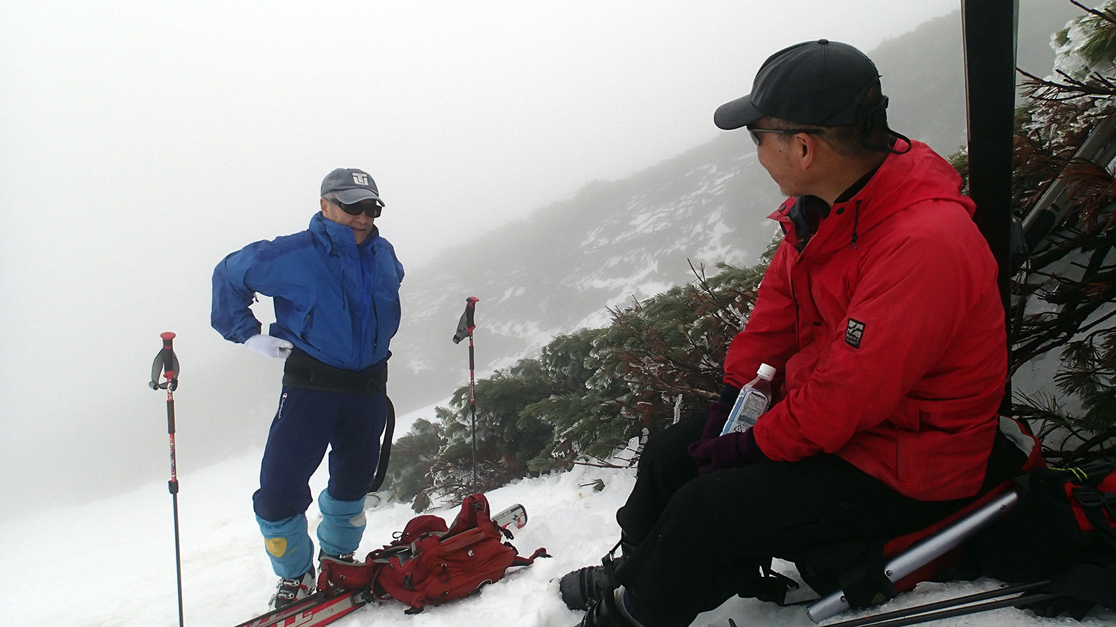 かなり砂が浮いていた部分は新雪に覆われて綺麗になっていた。しっとりとした新雪や樹氷がとても美しい。しかし、千春沢上部は新雪部分がアイスになっていてスリップしやすかった。さらに視界が悪いことから残雪二股部分(1495m)で視界が晴れるのを待つことにした。