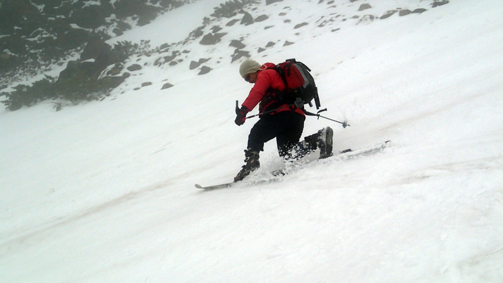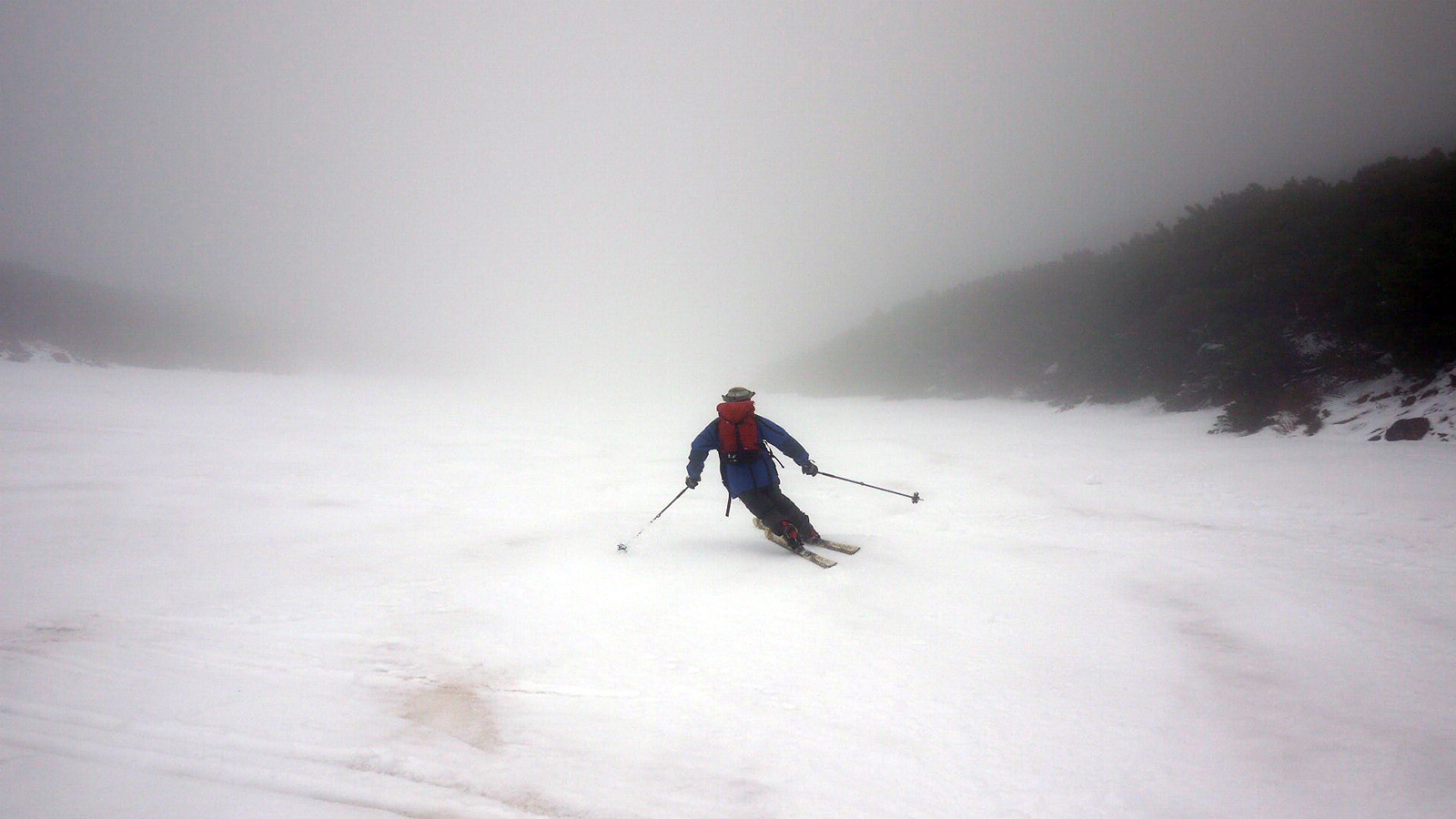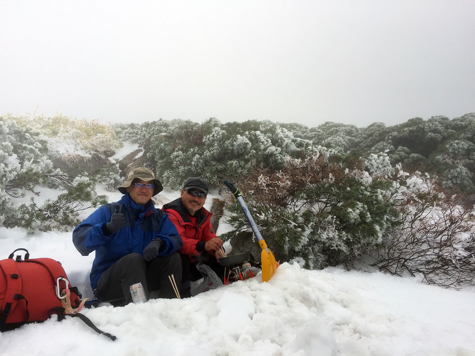 震えながら焼肉をしていたが、清水さんが下山し、視界もさっぱり回復しないので観念して滑降開始。