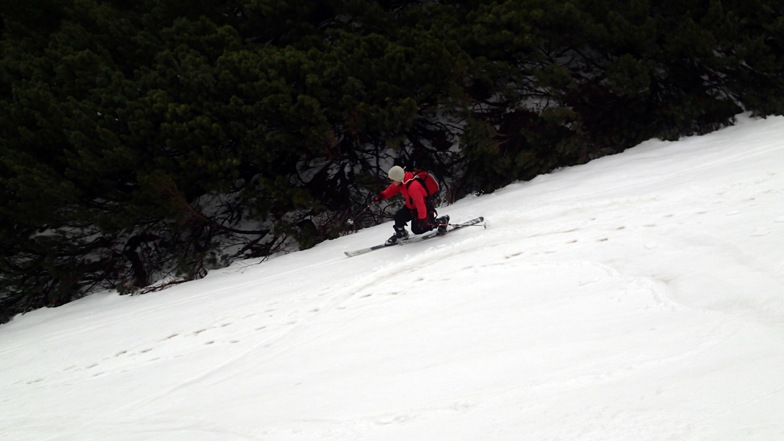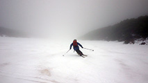 雪はパウダー!ではなかったが、薄い新雪は滑りやすく、この時期としては最高の滑り心地だった。