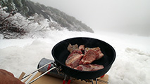 待望の焼肉だったが・・寒い。気温は0度程度で風も無いのだが、厳冬期の防寒装備がないと厳しい。