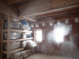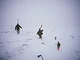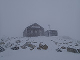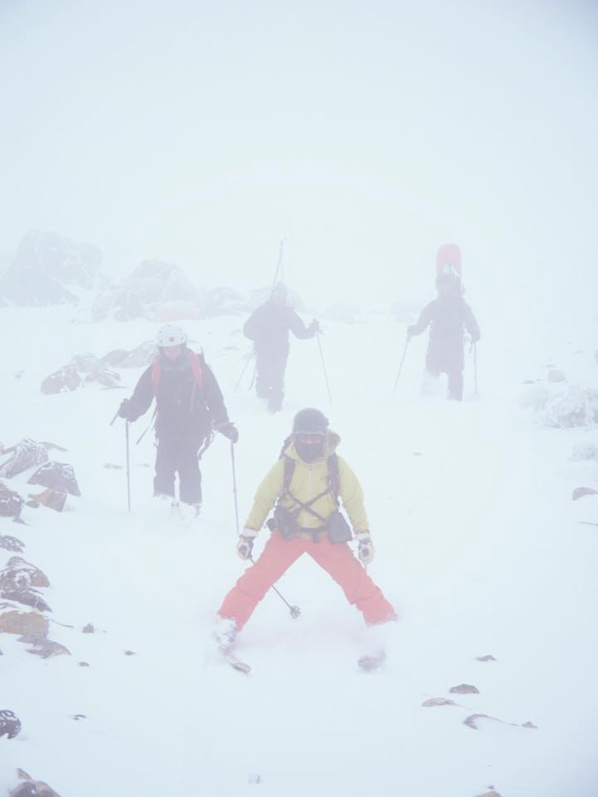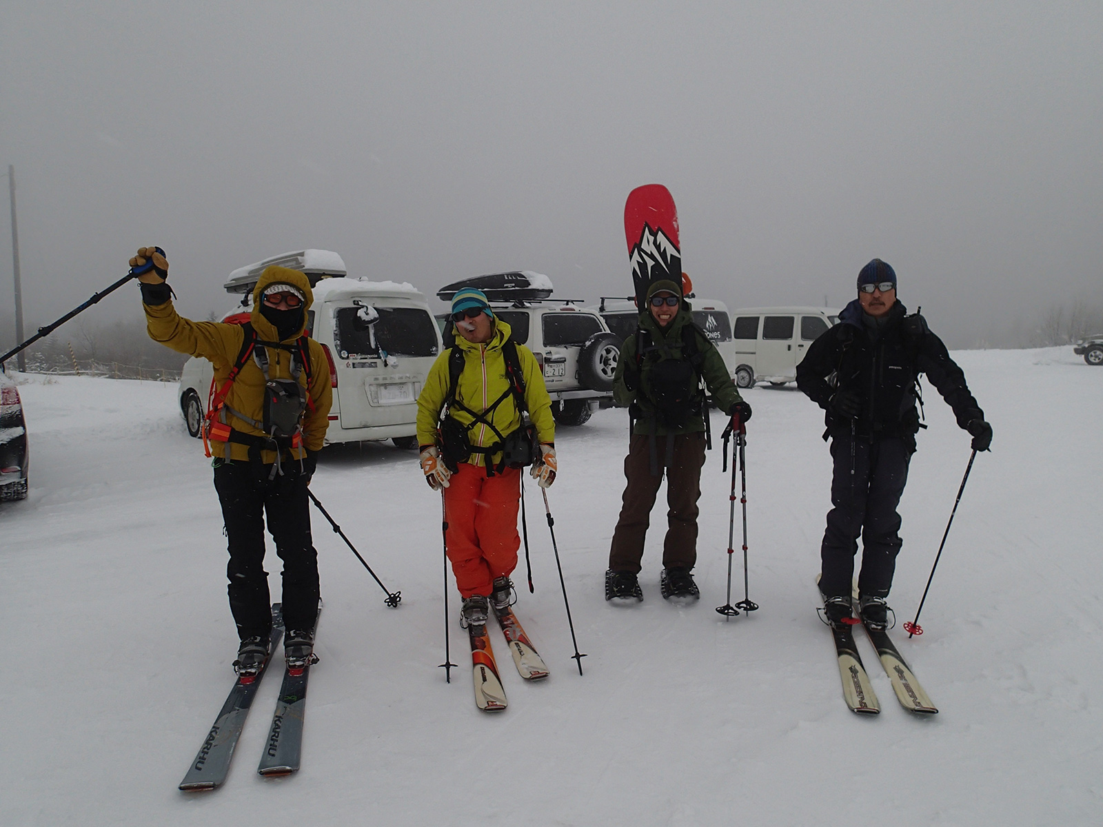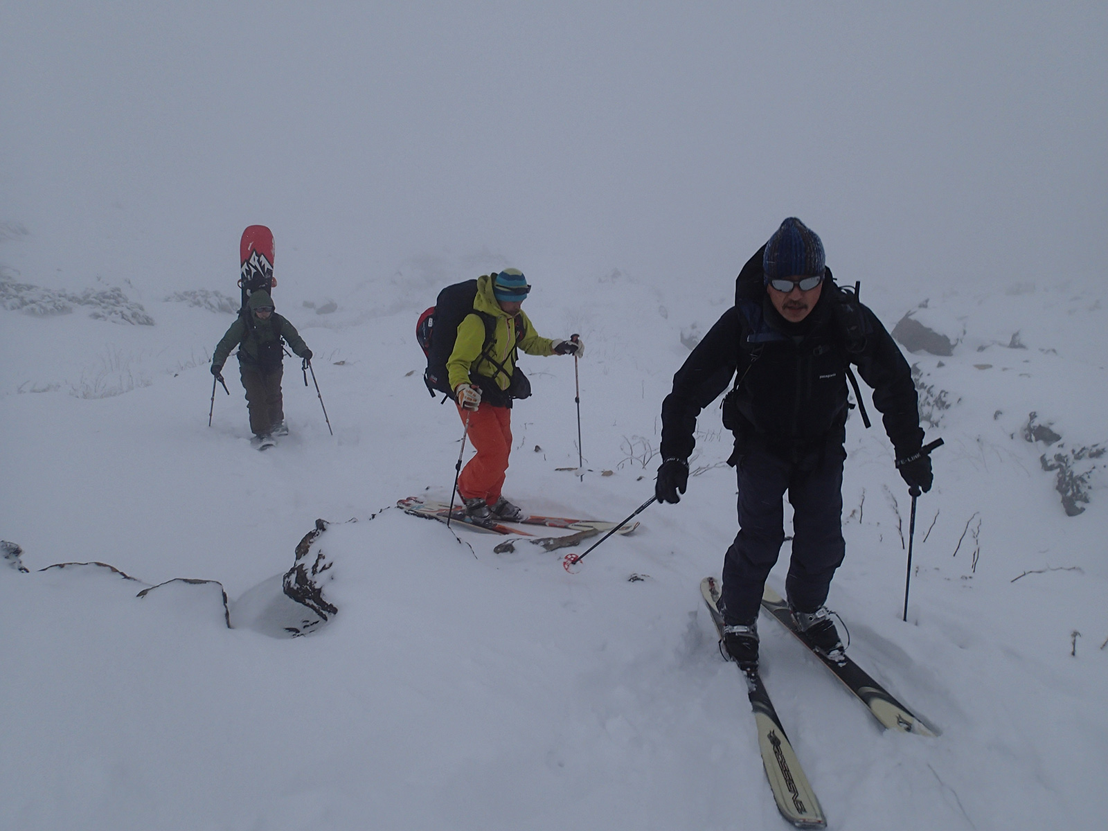 他にも5パーティくらいもの好きな人達が居たが、皆さん避難小屋までしか上がっていないようだ。我々も右にならえでちょっと小屋で休んでから早々に下山。保護材としてシールは貼り付けたまま滑降してみたが、1メートルごとにガリガリと音がした。賢明な田中パパとカズ君は板を背負ったまま下山してきたが、滑降組と下山速度が同じで悔しい。
