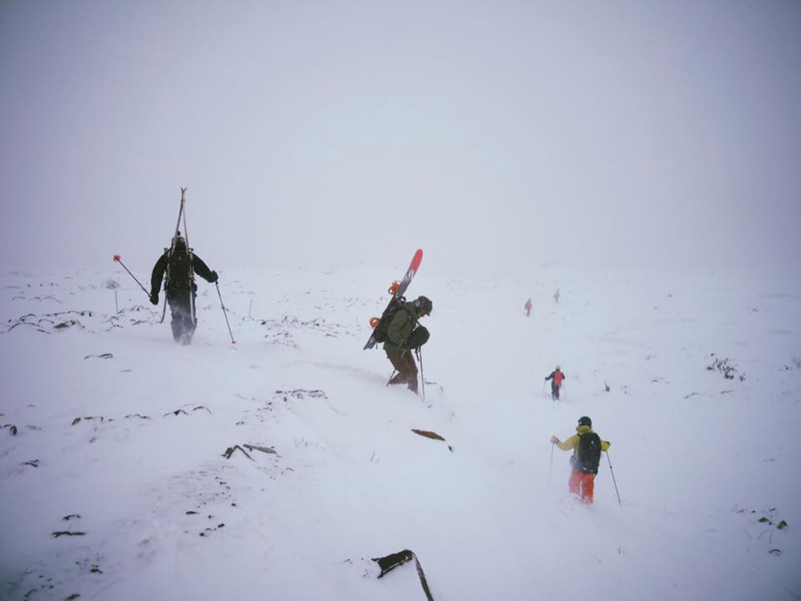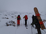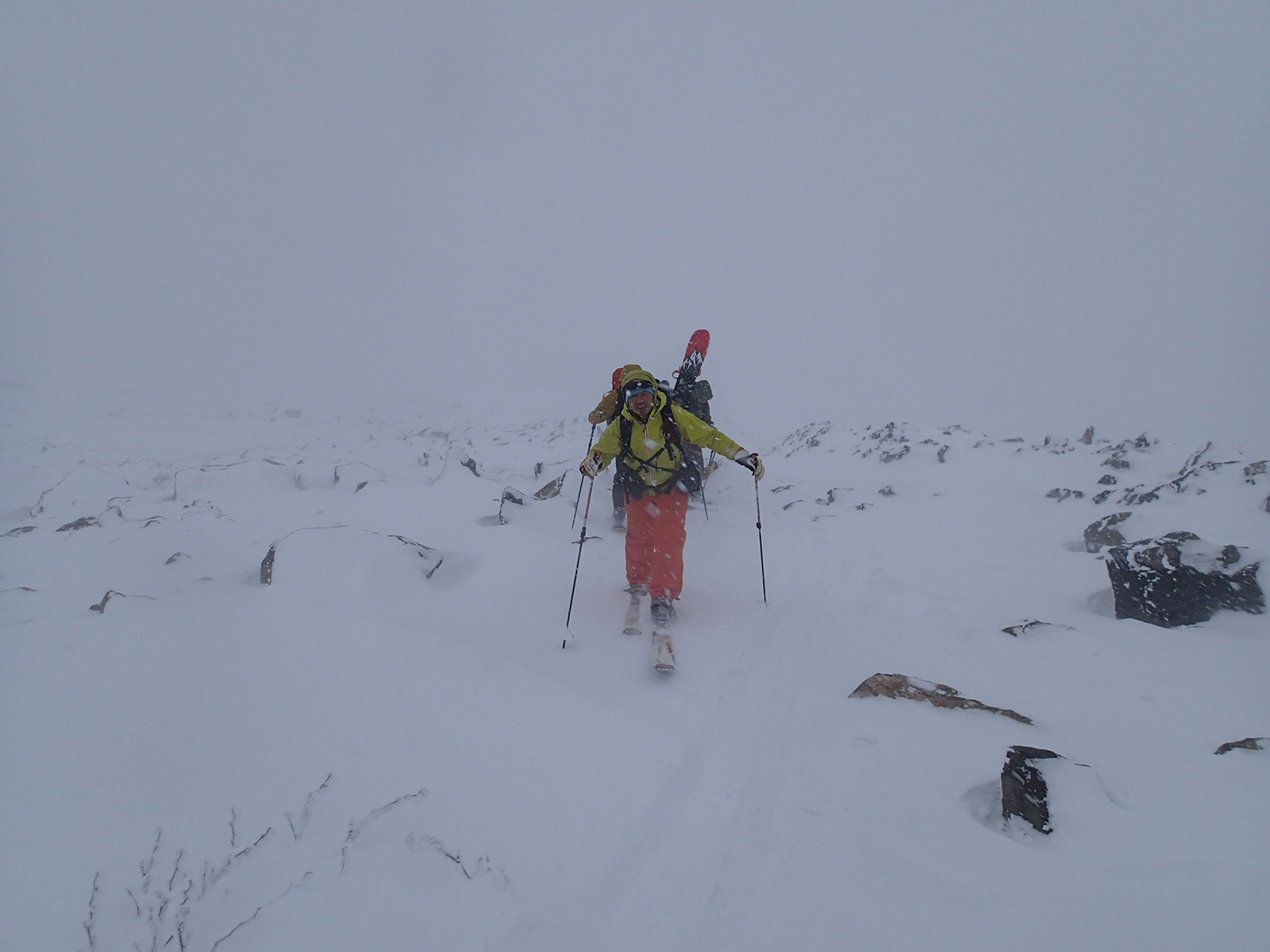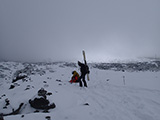 まー分かっていたことだが、全然雪が無い。でも吹きだまりではツボ足だと厳しそう・・せっかくなので板で登ってみたが、一足ごとにガリガリと音がした。