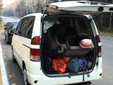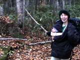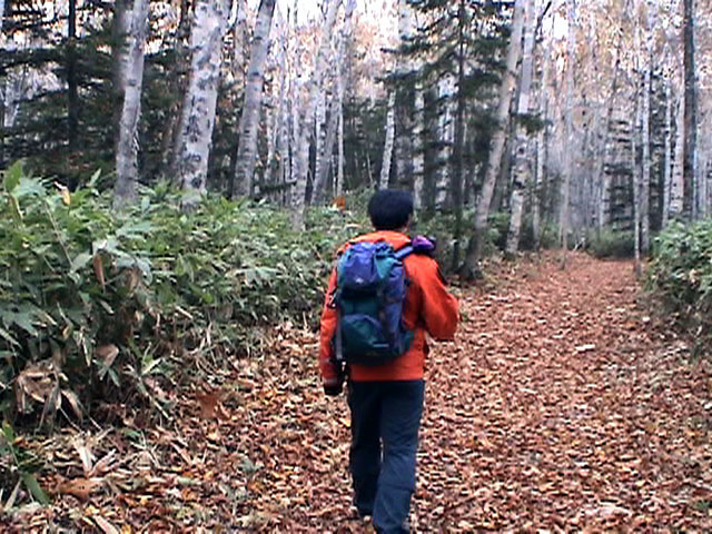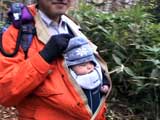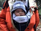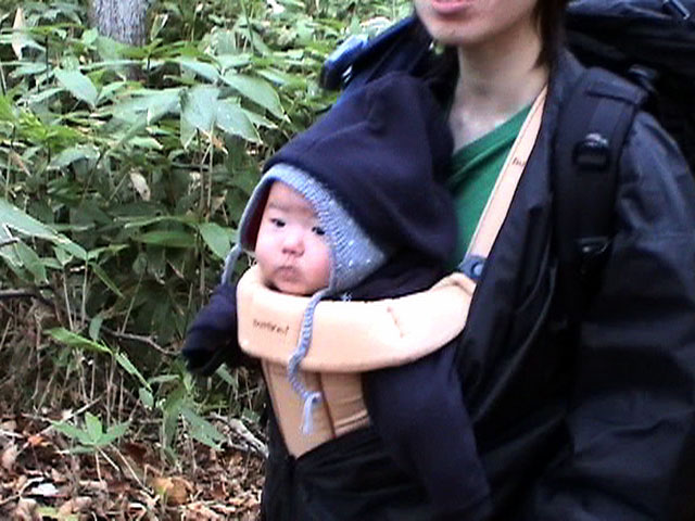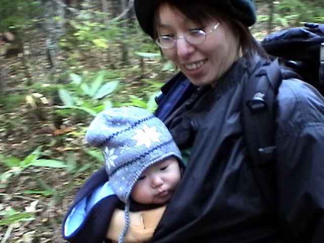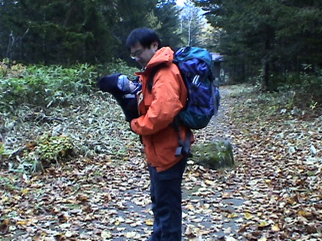 | 2004年10月16日(土) 白金ハイキング(四ヶ月目の初ハイク) 双子達も四ヶ月目になり、やっと首が座ってくれたので、初めてのハイキングに出かけてみました。 場所は、白金温泉白樺街道付近のハイキングコース。 雪が降るような降らないような・・この時期って、山からめっきり人が少なくなってとても好きなんですが、寒かったです。 気温は8度。子供達にはフリースのつなぎと、帽子で防寒装備を施し、さらに親が大きめのアウターを着て子供をくるむようにしました。 最初大泣きしていた子供達も、少し歩くとスヤスヤ・・途中で北狐なども歓迎しに来てくれて、親子共々とても楽しめました。 途中、美瑛・白金ネイチャークラブに寄って、ピンキーと世間話。コーヒーごちそうさまでした。 子供を背負った装備は、「ベビービョルン ベビーキャリア02」で子供を前抱きし、背中には45Lのザックに各種非常装備とオムツ、ミルクなどを入れて歩きました。 とても楽しかったけど、やっぱり重たいですね・・子供は、それぞれ6Kg,7.5Kgなんで大したこと無いと思っていたのですが、かなり腰と背中に負担を感じました。登山じゃないので、ハイキング向きに装備を再考したいと思います。 今度は背負子を試したいと思います。 前抱きの仕方ですが、前半は後ろ向きに抱っこしましたが、後半は前向きにしてみました。この方が子供の視界が良いせいか、あまり寝ないで熱心に周りを見渡しているようでした。 天候:曇り 風速:0〜1メートル 気温:8度 コース:白金不動の滝〜白金温泉〜白樺遊歩道 メンバー:旦那、ゆきこ、双子 計4名 |