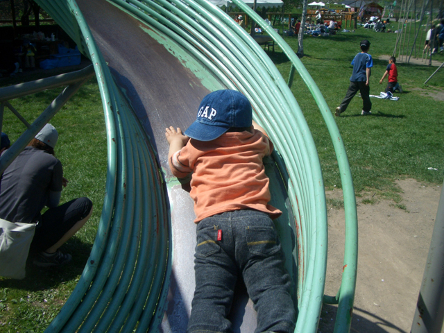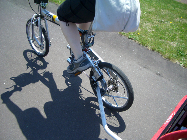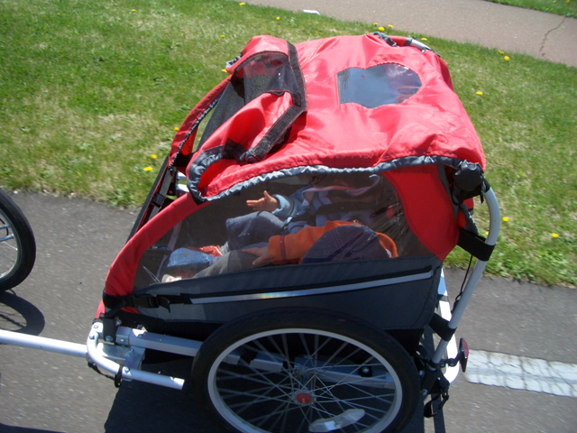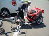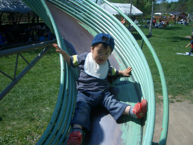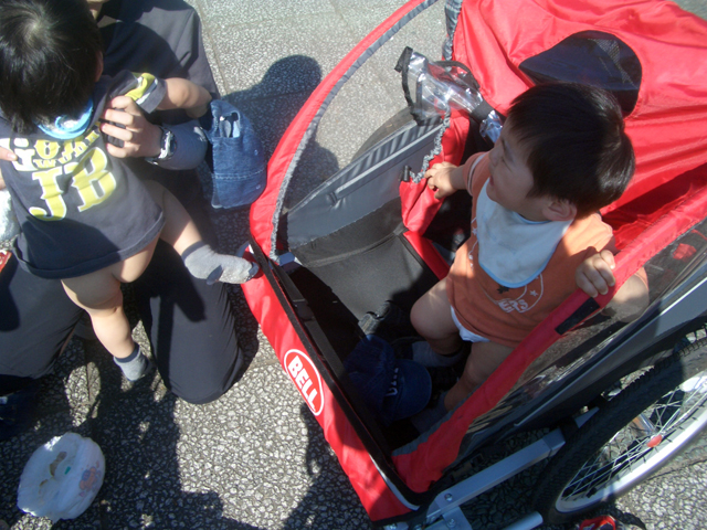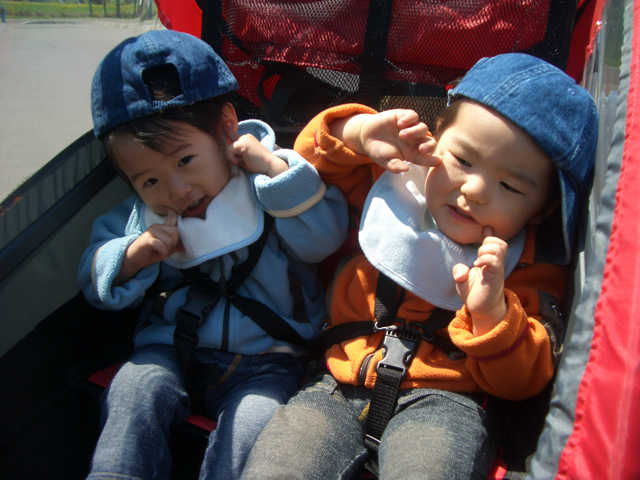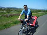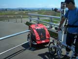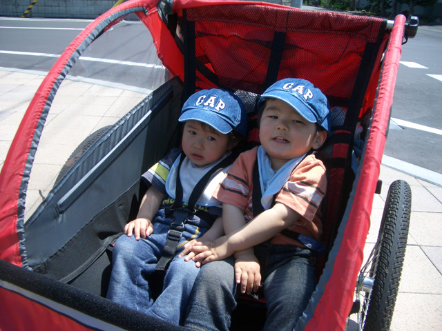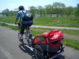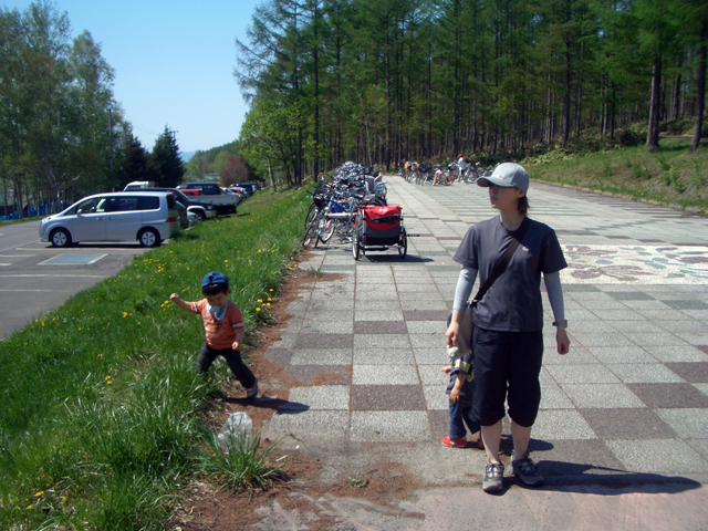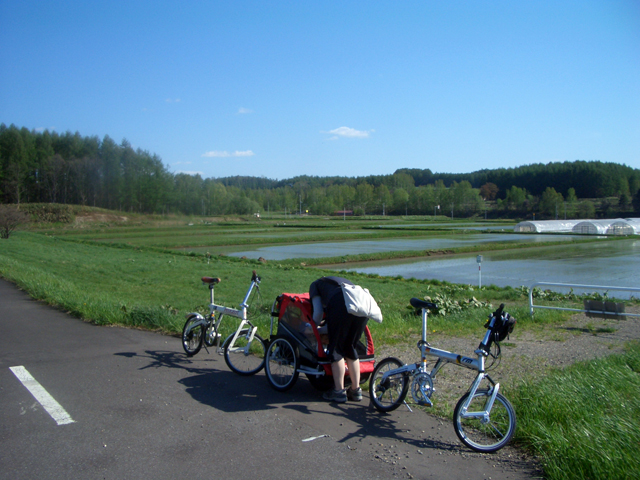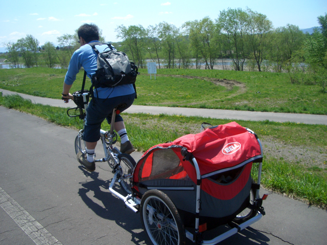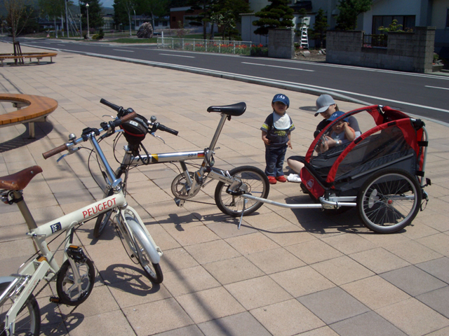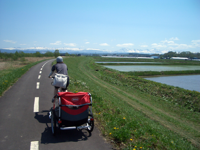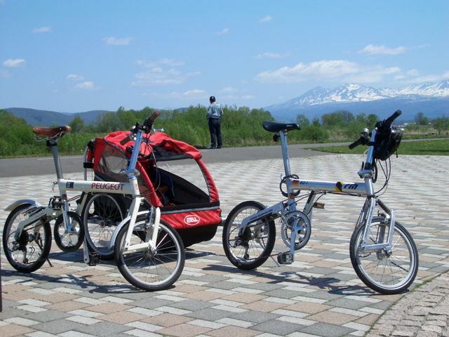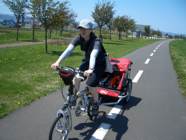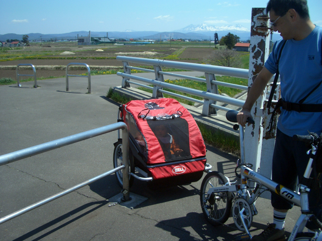 | 2006年5月21日(日) 東神楽森林公園(忠別川サイクリングロード) 天候:晴れ メンバー:旦那家 計4名 気温:21度 風速:5m/s 今回の「双子でサイクリング」は、忠別川サイクリングロードから東神楽森林公園へ、初めての遠乗りにチャレンジしてみました。 忠別川サイクリングロードは、旭川ツインハープ橋のたもとから東神楽森林公園まで忠別川左岸に治ってまっすぐのびる延長15.2キロメートルのサイクリン グロードです。 大雪山連峰を正面に、忠別川の流れ、田園風景、桜づつみ白樺林など多彩なロケーションが楽しめます。しかし、コ−スの途中には 4つの橋があり、これをパスするのが一苦労・・でも苦労した甲斐がありました。 ちなみに、今回の新兵器はサイクルトレーラーをBD-1に繋ぐためのアダプター。以前のものは無理矢理取り付ける形で不安があったのですが(以下参照)、これならばっちりです。えぞサイクル製作所に作っていただきました。 |