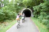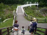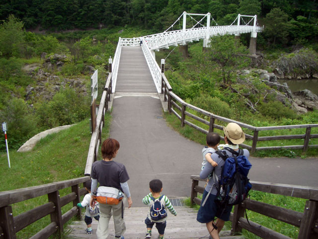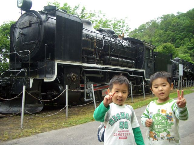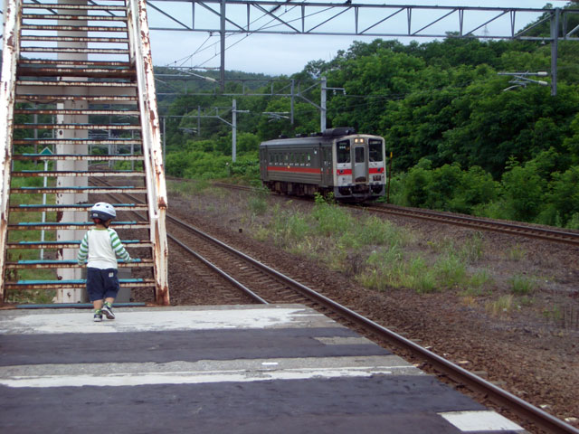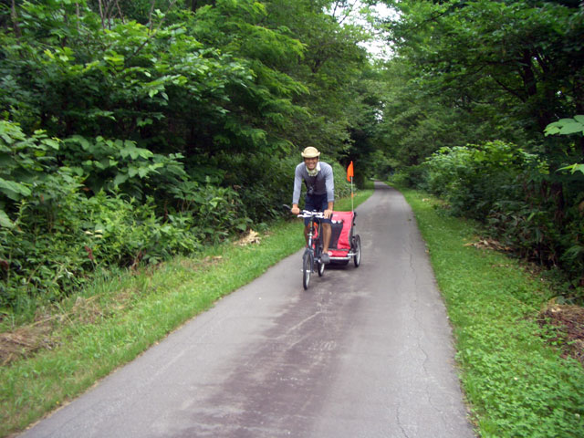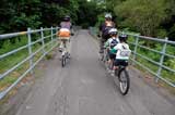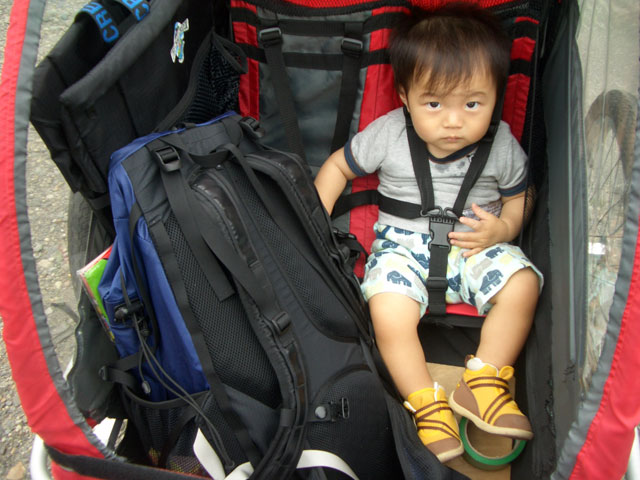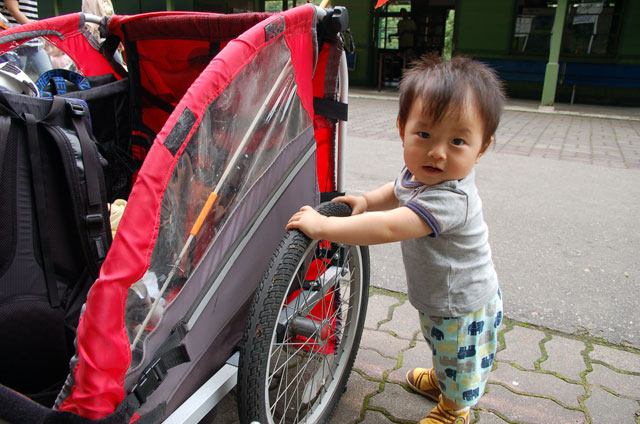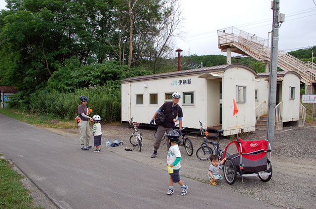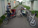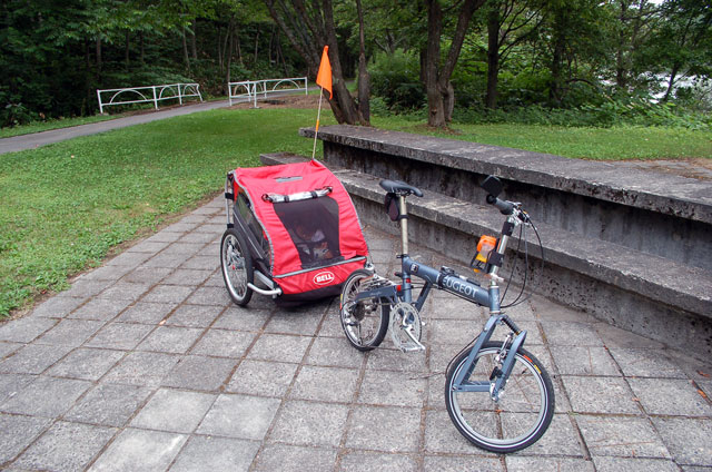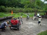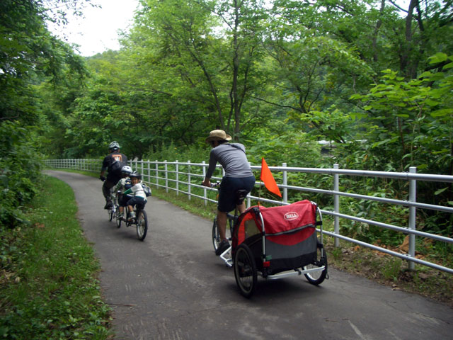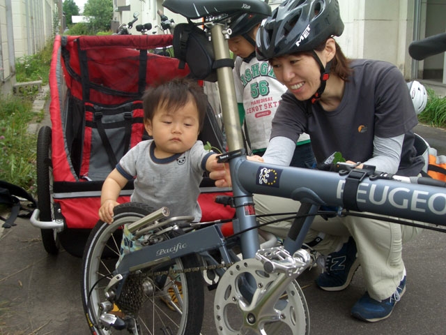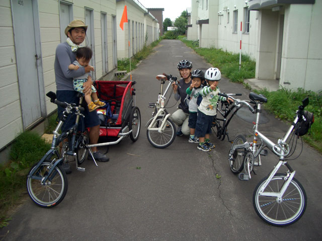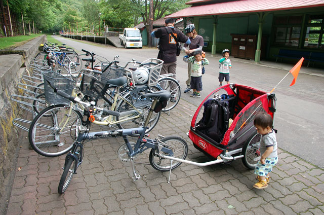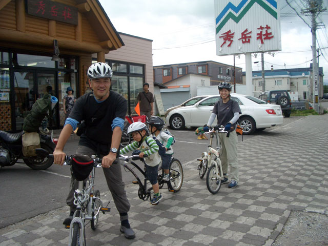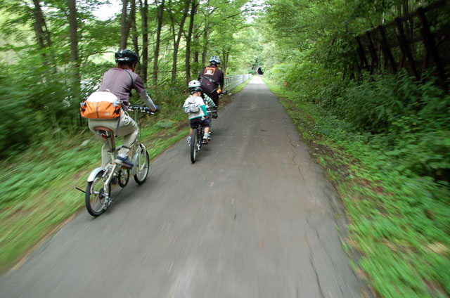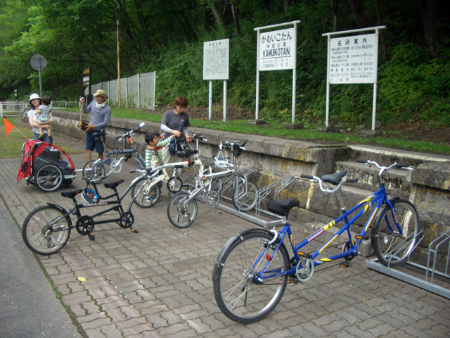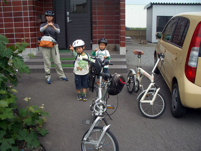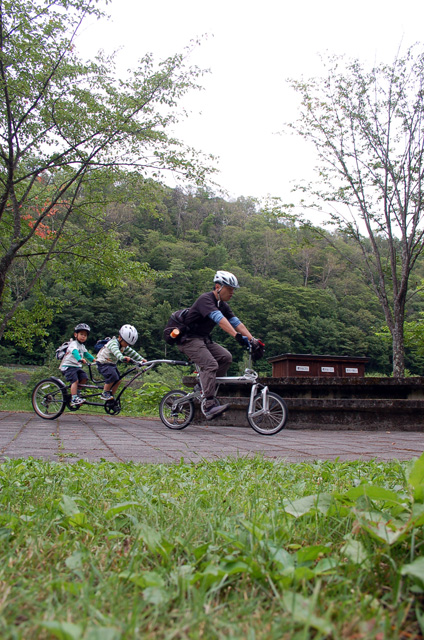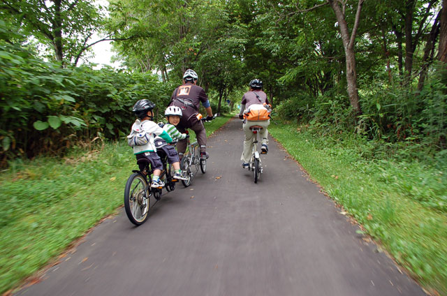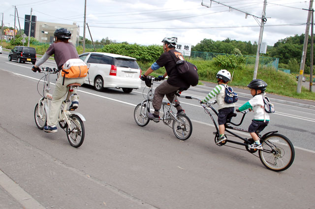 | 2008年7月21日(日) 神居古潭サイクリング(トレーラーバイクとサイクルトレーラーのコラボレーション) 天候:くもり メンバー:旦那、ゆきこ、双子 計4名 気温:26.5度 風速:2〜4m/s 装備:おにぎり・おかず・お茶・グズベリと桑の実(現地調達) コース: 自宅(9:05)〜(9:30)タカヤ家(9:45)〜(10:20)伊納駅(10:50)〜(11:10)春志内(11:20)〜(11:20)神居古潭(13:00)〜伊納駅(13:30)〜エゾサイクル製作所・秀岳荘(14:20)〜自宅(14:55) 総走行距離:約50km 大西家とタカヤ家でサイクリングに行きました。 タカヤ家はサイクルトレーラー(我が家から譲りました。これでタカヤが三代目の所有者となります)、我が家はトレーラーバイク(例の三人乗り)というコラボレーション、BD-1が三台と、双方ともただ者ではない(^_^;)組み合わせのサイクリングとなりました。 |