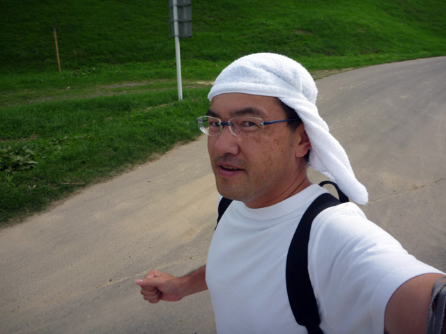 旦那のジョギングスタイル 背中のザックには救急箱や携帯電話、カメラなど