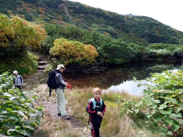 途中、三段山への分岐で休憩。崩落のために三段山への道は閉鎖されていた。この時初めて三段の沼を見物し、三段山には火口だけではなくて沼もあったのだと感心する。