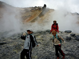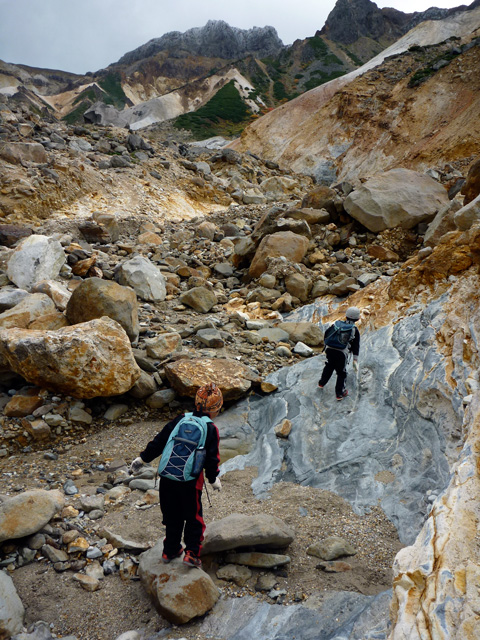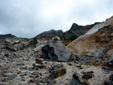 一面瓦礫の中、道を探しながら噴煙の方向へ。硫黄の刺激臭と真っ白な噴煙に囲まれ、自分達が火口の真ん中に居ることを実感させられる。