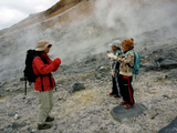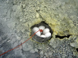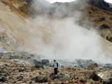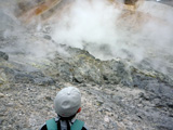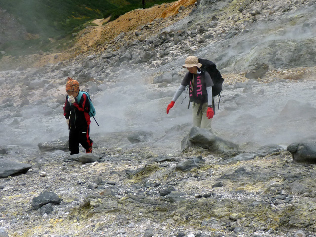 やっとちょうど良さそうな噴気口を見つけて、噴気口近くの蒸気に手をかざしてみて驚いた。「熱い!」見かけよりずっと高温の蒸気・・グローブをしていなかったら、間違いなくやけどしていた。