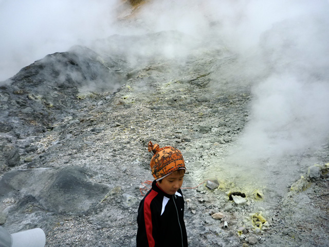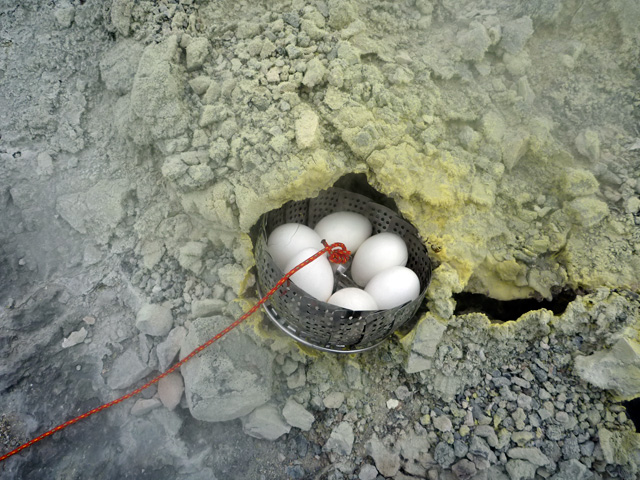 早速温泉たまご装置に卵を入れ、うろうろと手頃な噴気口を探し回る。あまり勢いのある大きな噴気口は怖いし、小さすぎるとたまごがうまく茹でられない可能性がある。なかなか難しい。